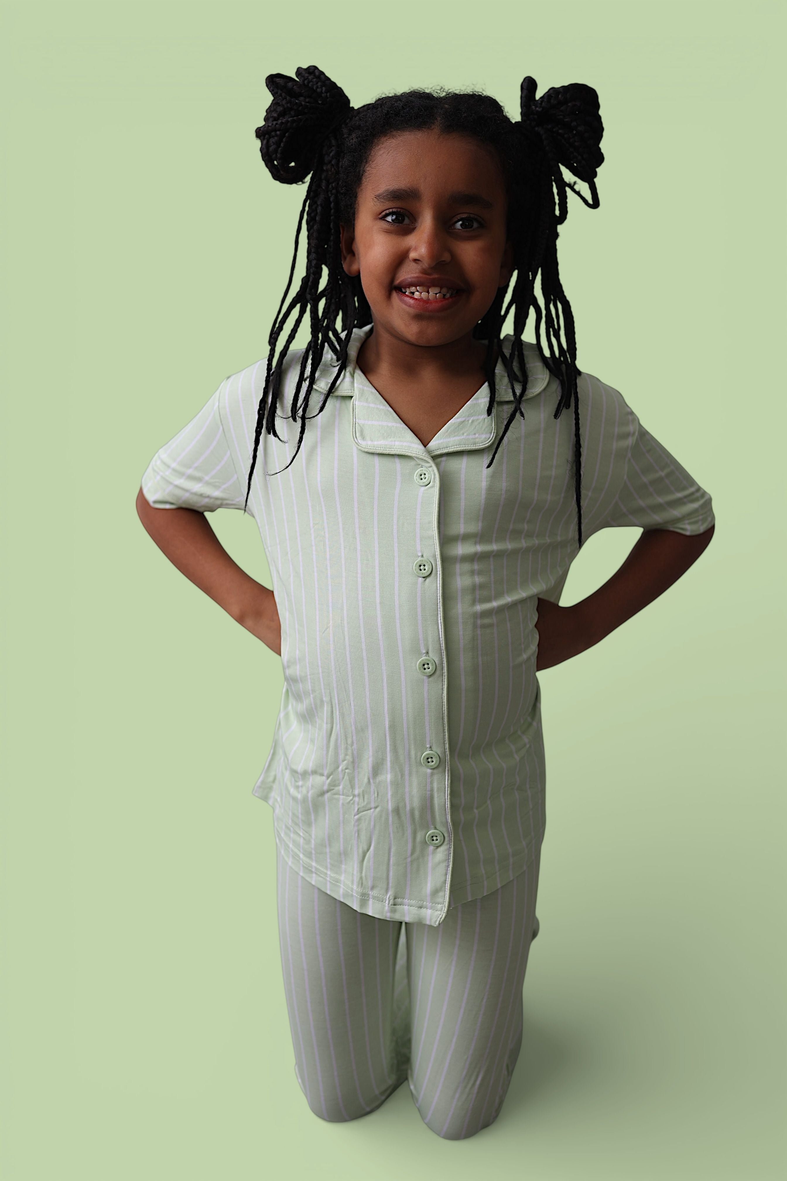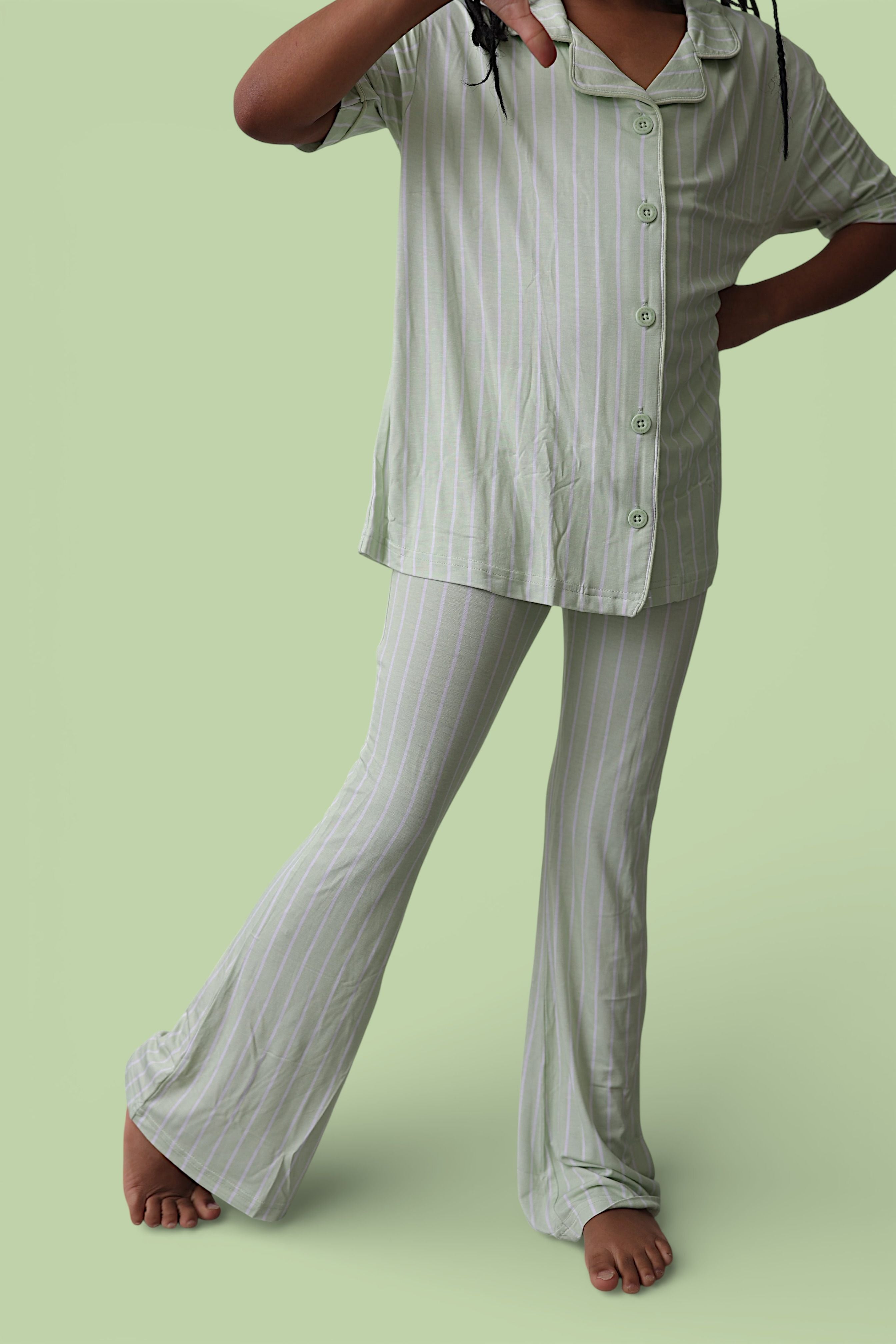 Fresh, sweet, and perfect for sunny spring days. Our Springtime Stripe Dream Girl's Flare Set features soft pastel stripes with a simple + classic look — a darling everyday style that pairs beautifully with all of our spring prints for sibling matching. Clean, minimal, and so easy to dress up or lounge in. 🌷✨