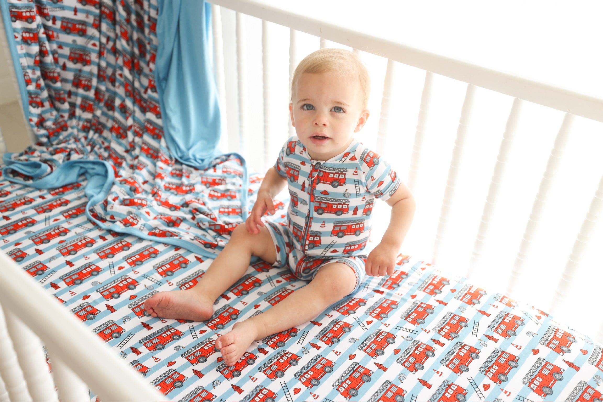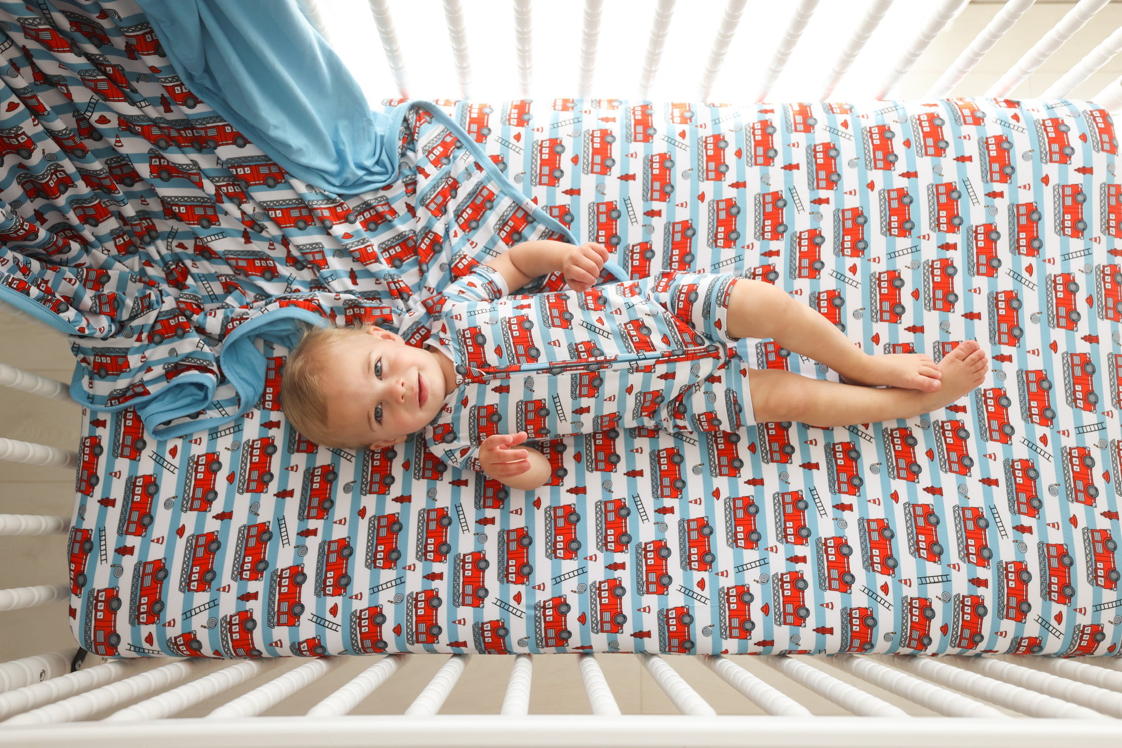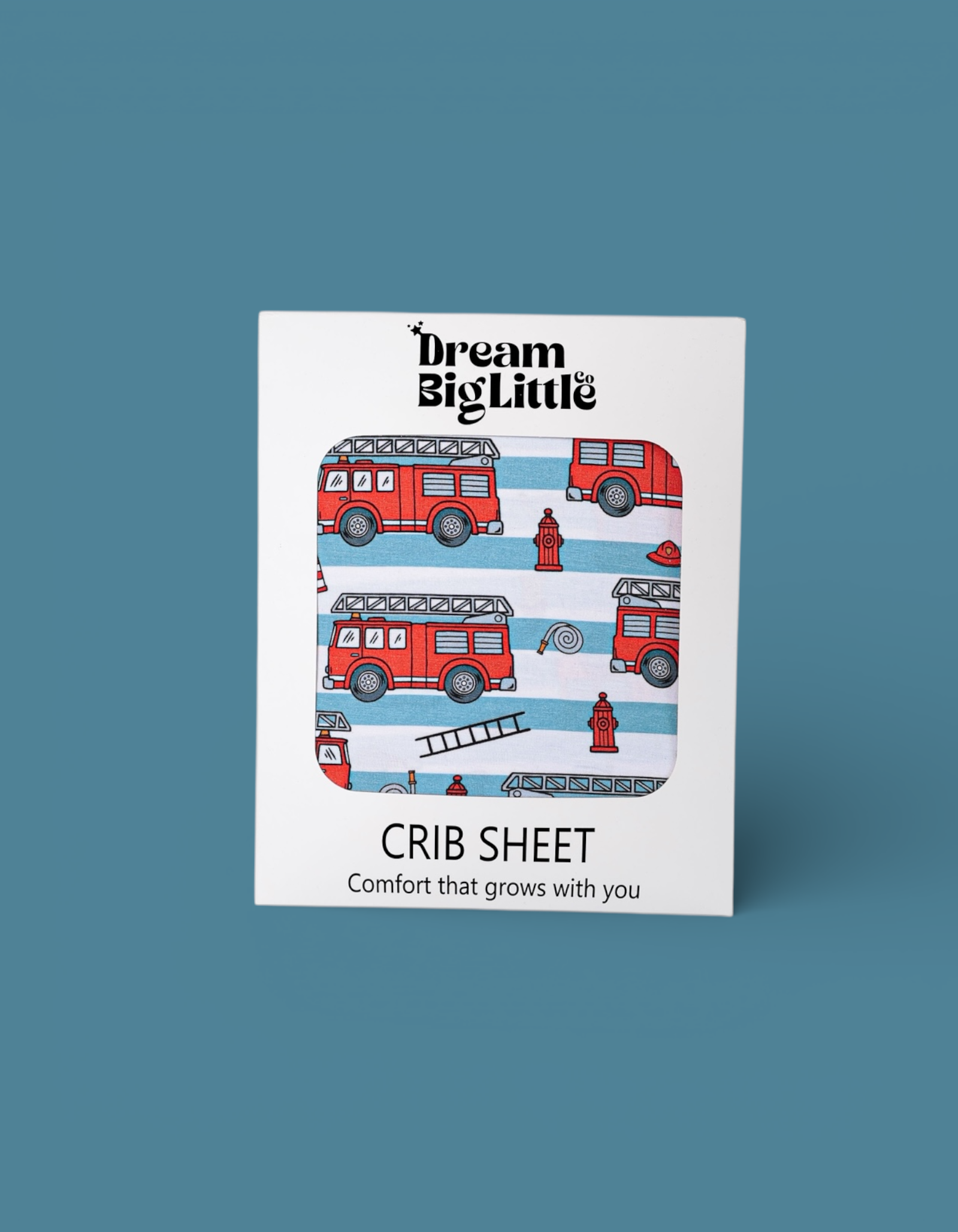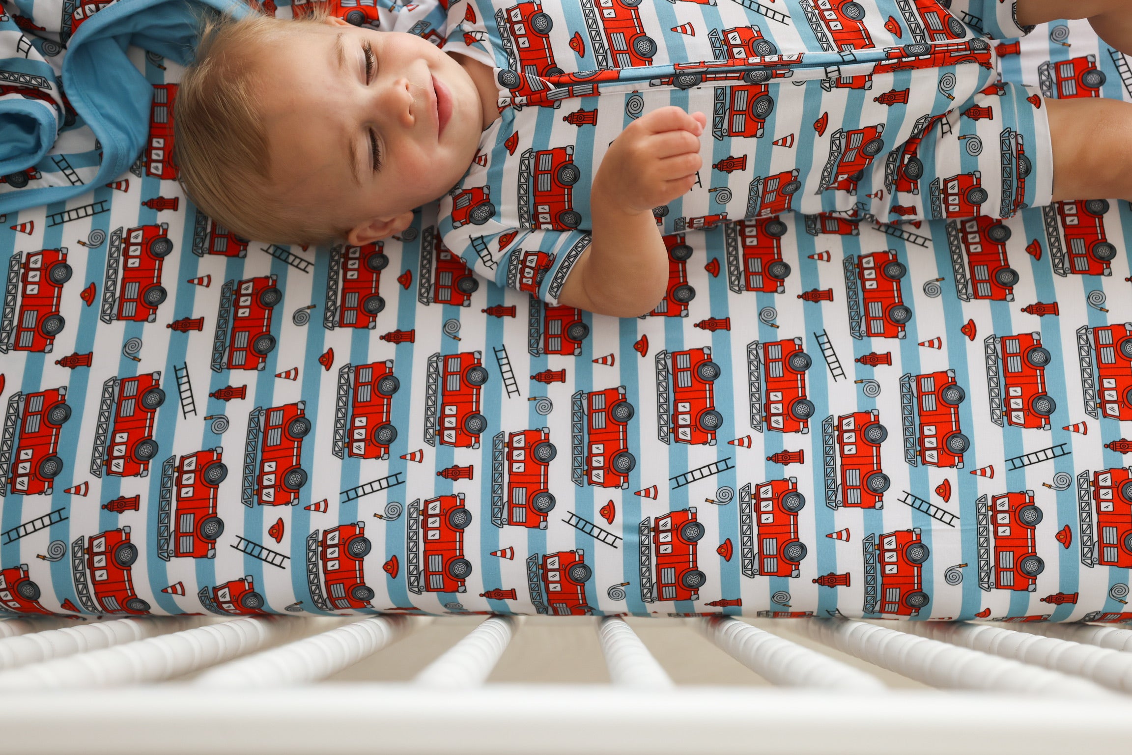 The Firetruck Frenzy Dream Crib Sheet adds playful, heroic charm to your little one’s sleep space. Featuring a fun firetruck print with ladders and hydrants, this crib sheet is crafted from our signature buttery-soft bamboo fabric for a breathable, gentle feel that keeps baby comfy through naps and nighttime rest.