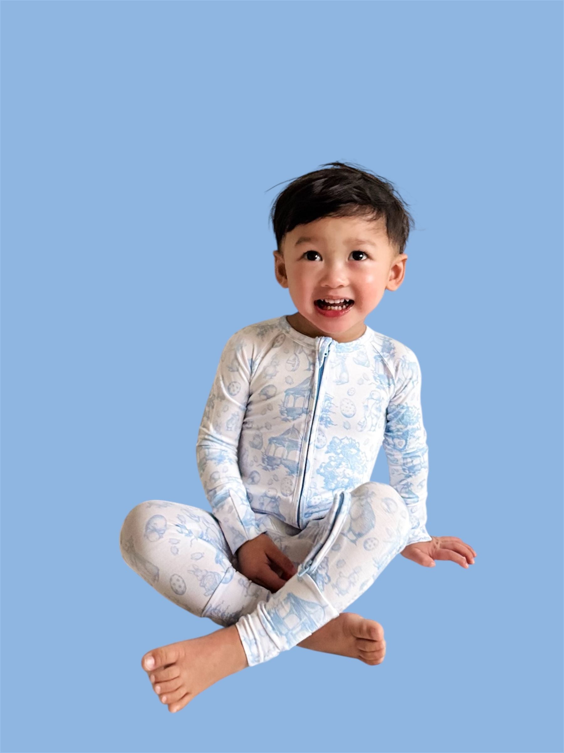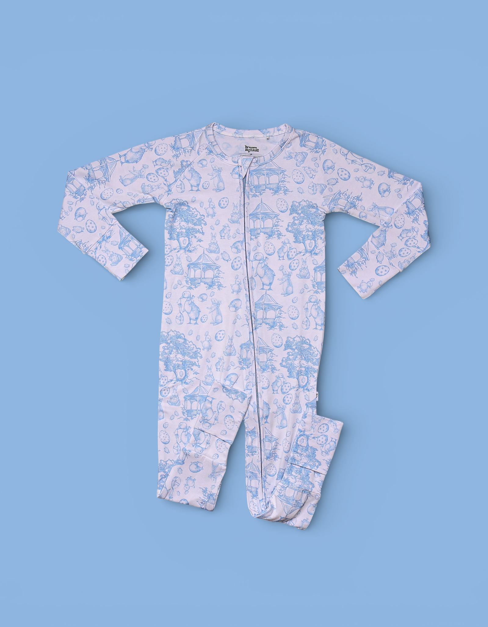 Timeless, elegant, and full of Easter charm. Our Bluebell Easter Toile Dream Romper features a delicate toile-style print in soft powder blue — complete with bunnies, eggs, spring florals, and storybook scenes that feel straight out of a fairytale garden. Perfect for Easter morning, spring photos, and sweet seasonal snuggles. 🌿✨