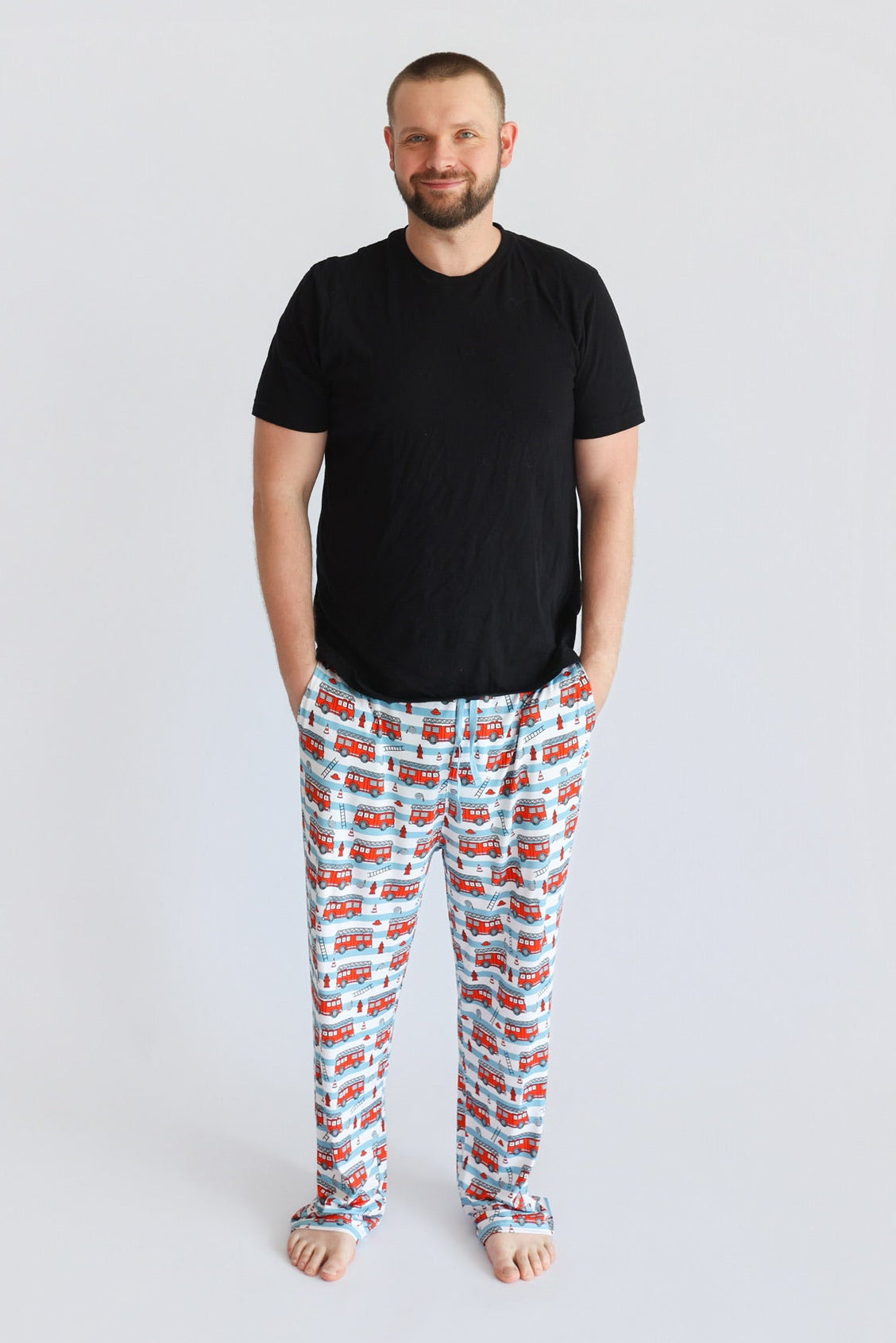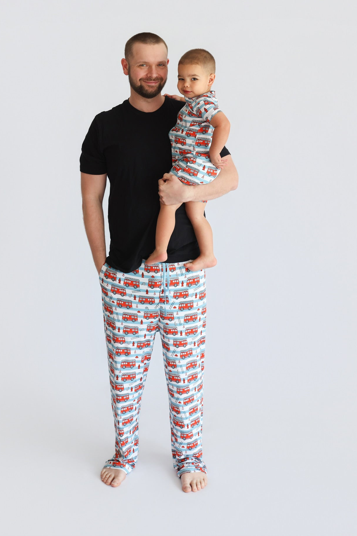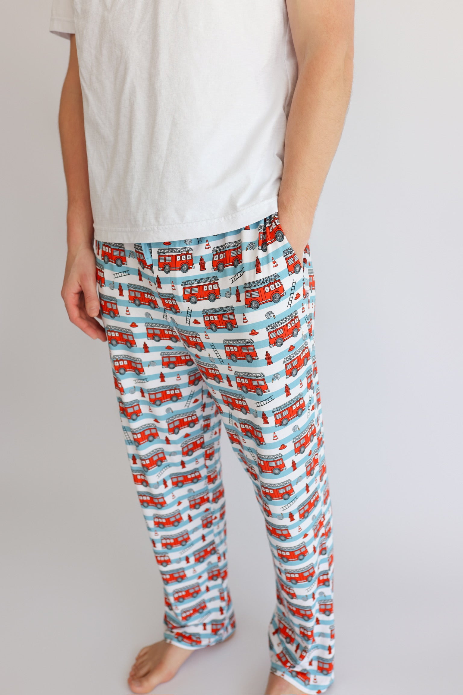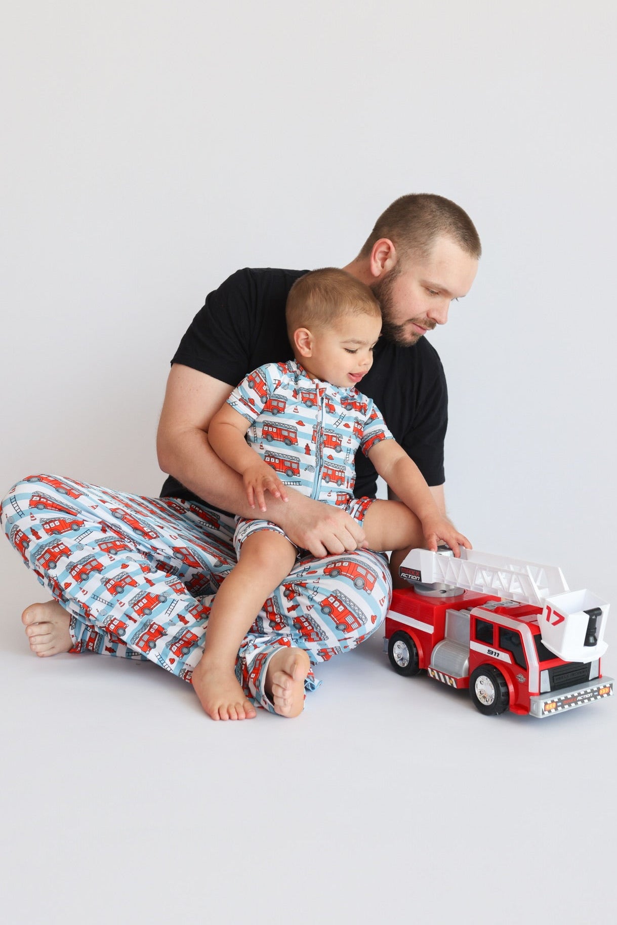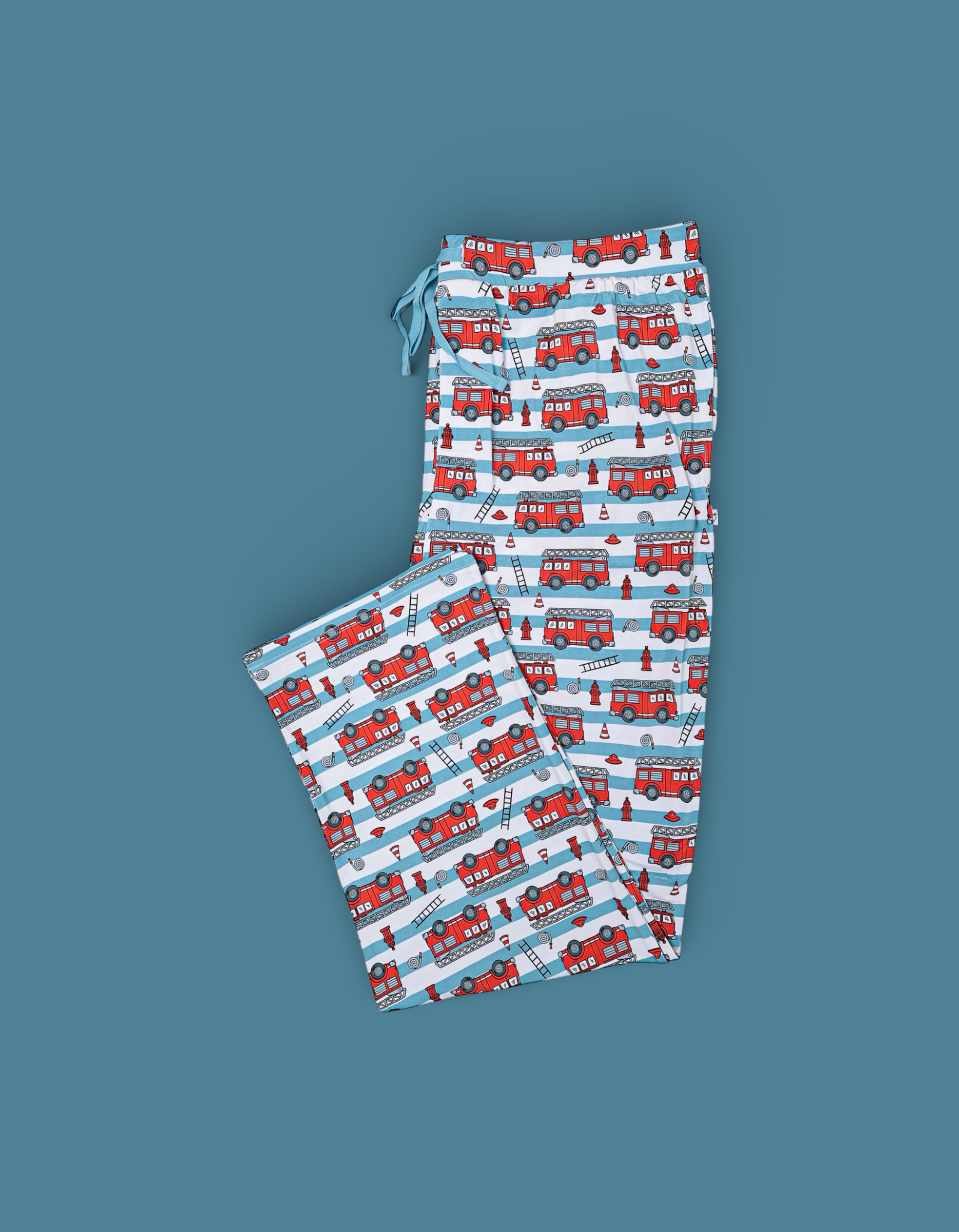 The Firetruck Frenzy Dream Men’s Pants bring playful style to everyday lounging. Featuring a bold firetruck print with classic rescue details, these lounge pants are crafted from our signature buttery-soft bamboo fabric for a breathable, ultra-comfy feel—perfect for relaxing at home or matching with your little firefighter.