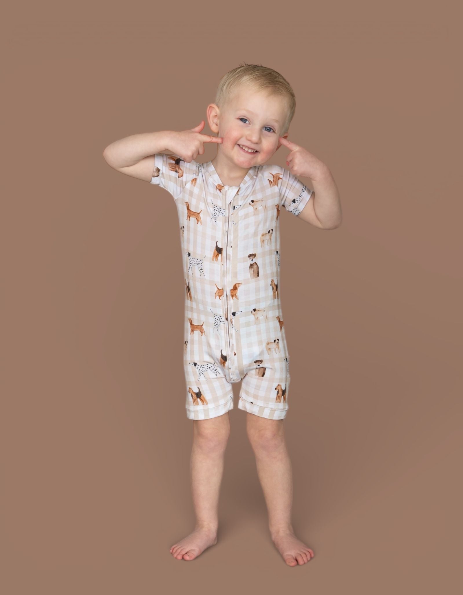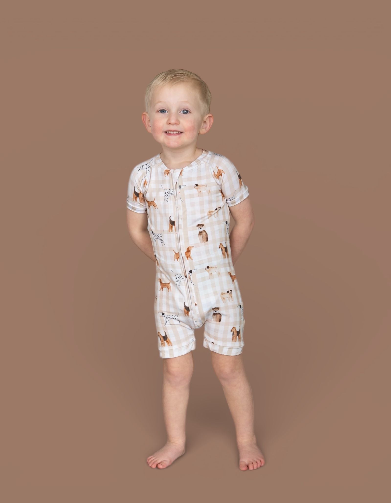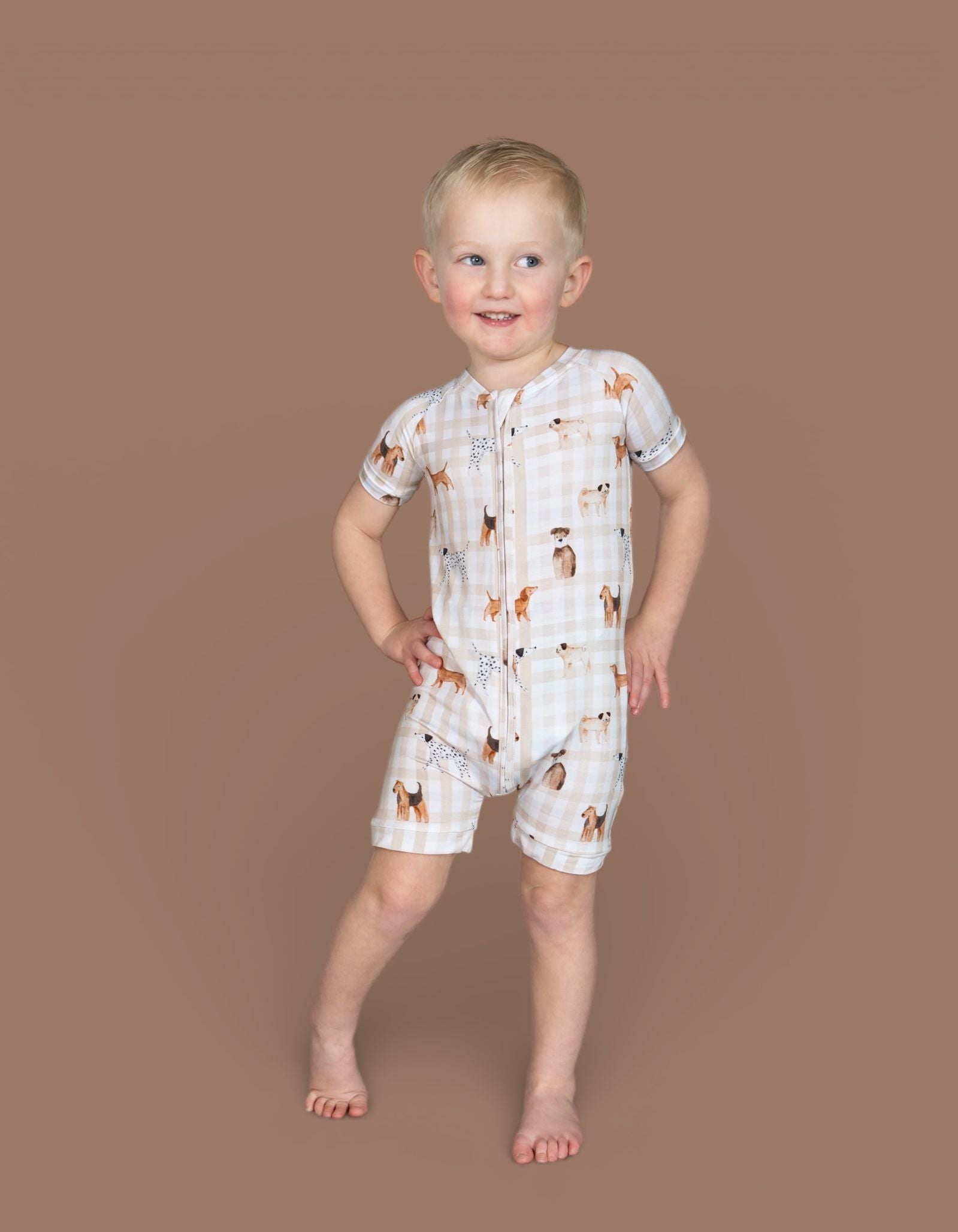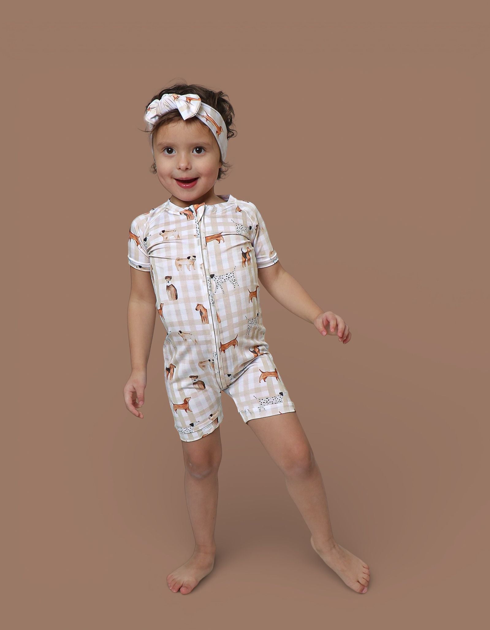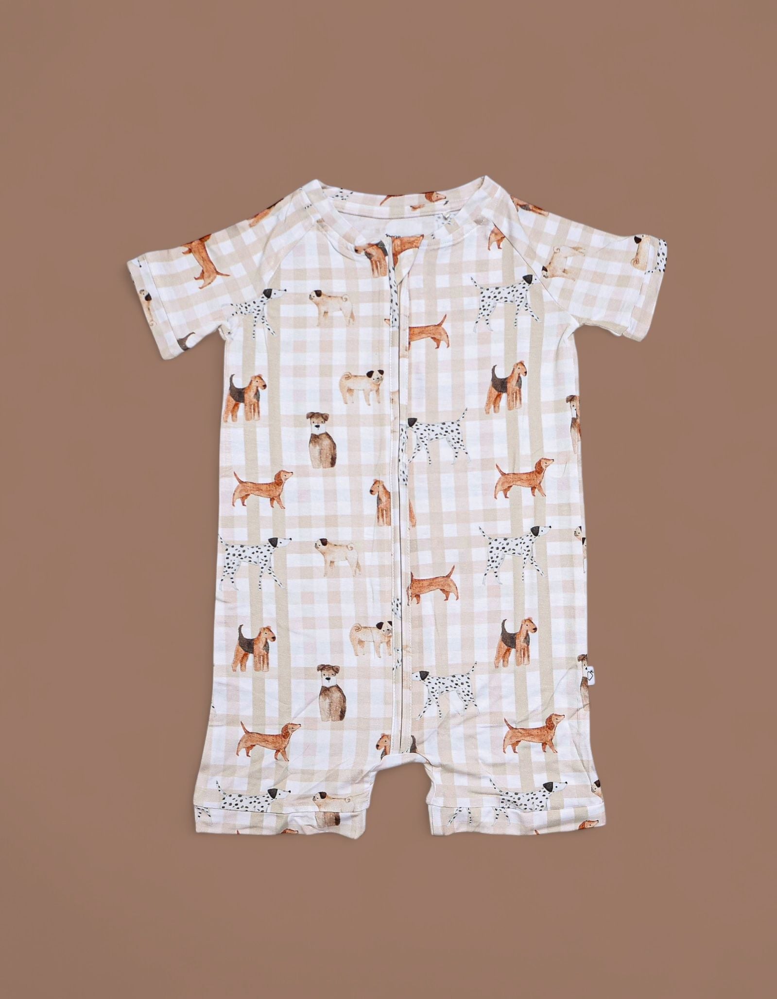 The Pawfect Pals Dream Shortie is a go-to favorite for play, sleep, and everything in between. Designed with our adorable Pawfect Pals puppy print on a classic neutral check, this one-piece shortie is made from our signature buttery-soft bamboo fabric for a breathable, cozy feel that keeps little ones comfy day and night.