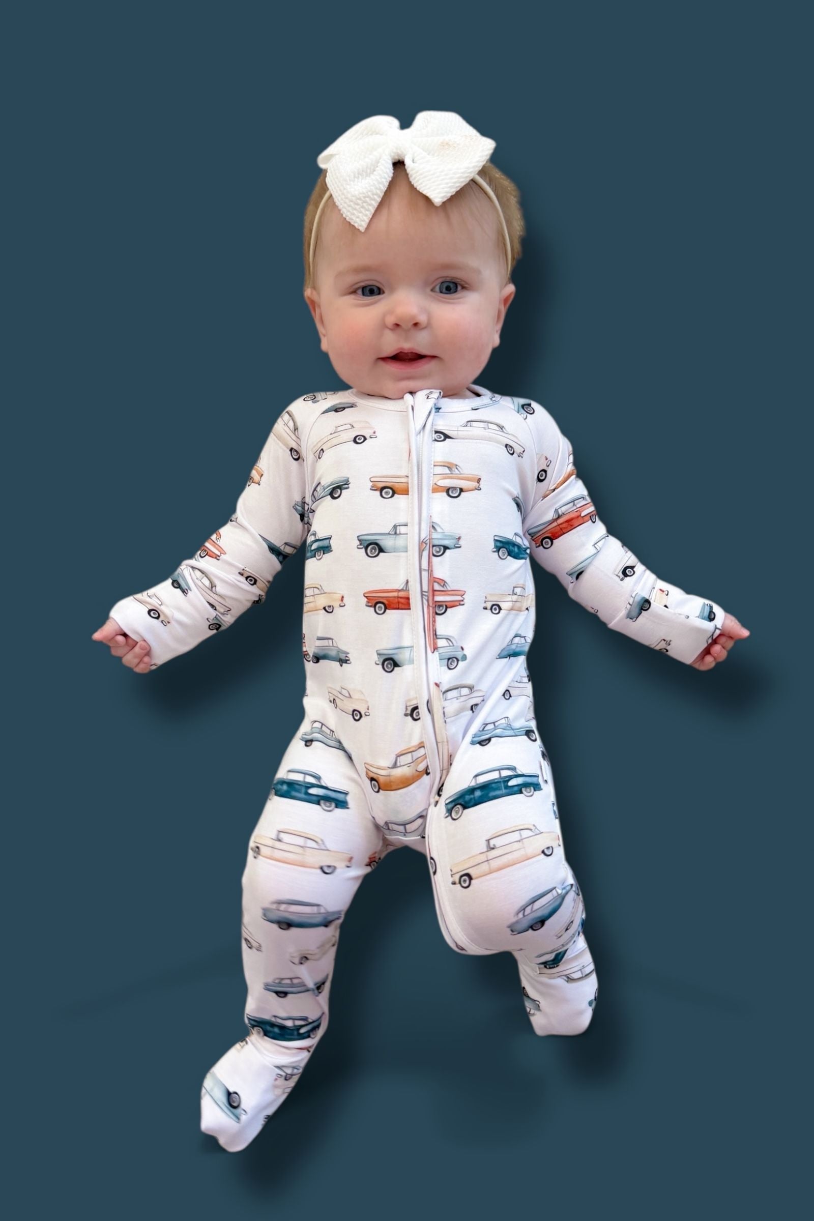 Classic cars, cozy comfort! The Retro Rides Dream Romper features a playful all-over print of vintage cars in muted retro hues. Made from our signature buttery-soft bamboo fabric, this romper is breathable, stretchy, and perfect for little ones on the go. With a two-way zipper for quick changes and a snug yet comfy fit, it’s built for cruising through naps, playtime, and dreamland.