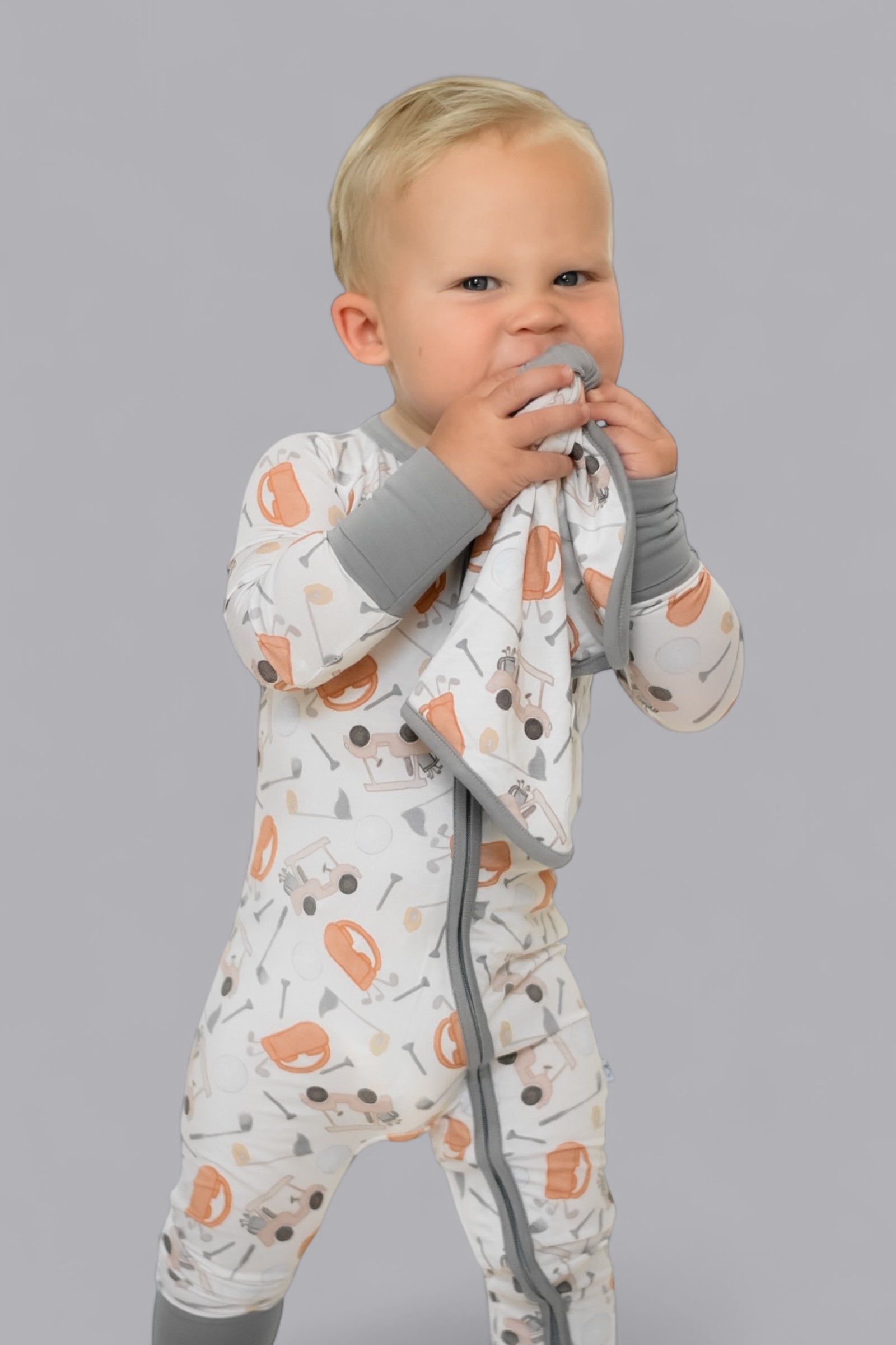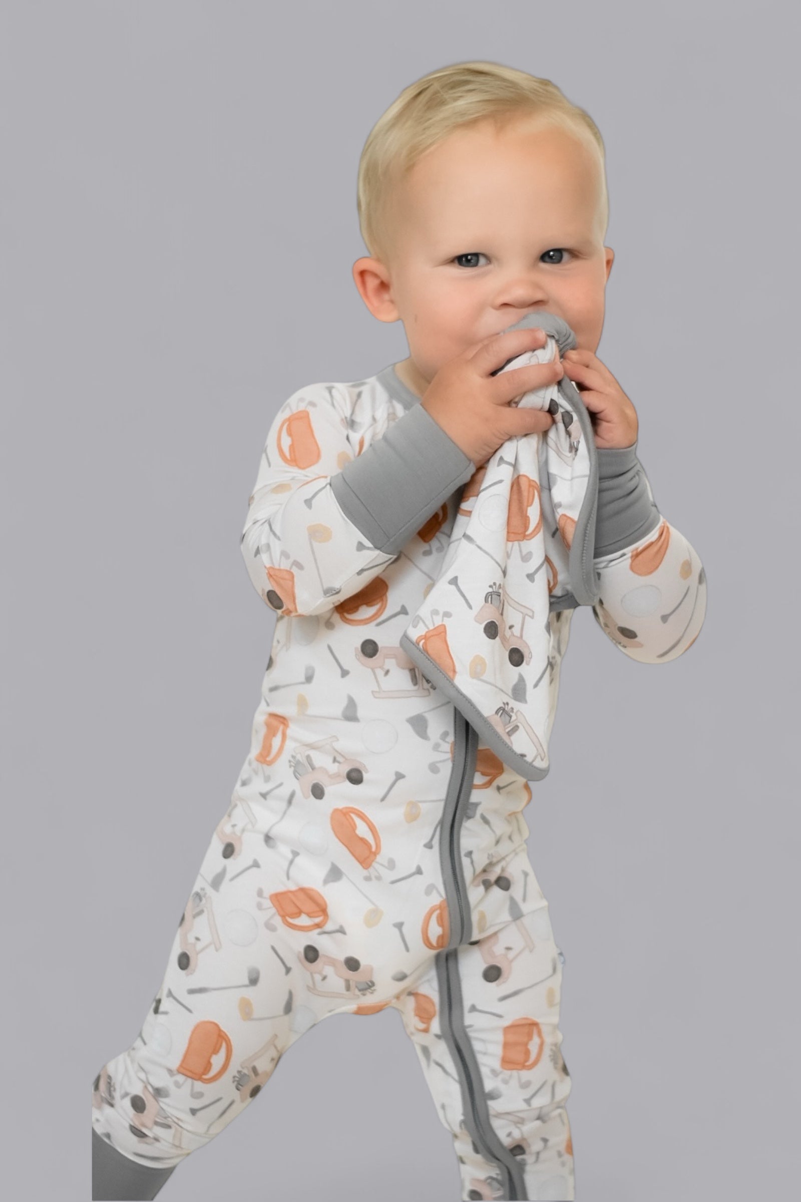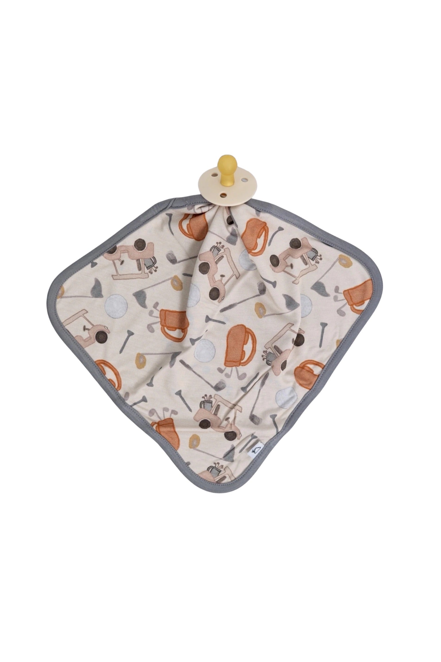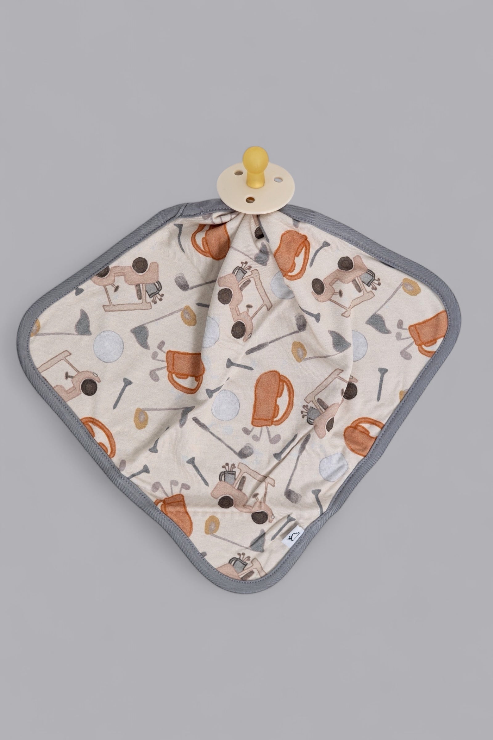 Our Bedtime Birdie Dream Lovey features a playful golf-inspired print with charming illustrations of golf carts, clubs, balls, and caps in warm, neutral tones—made for mini golfers in the making. Whether they're dreaming of the green or cuddling up at naptime, this lovey brings cozy country club vibes to your nursery.