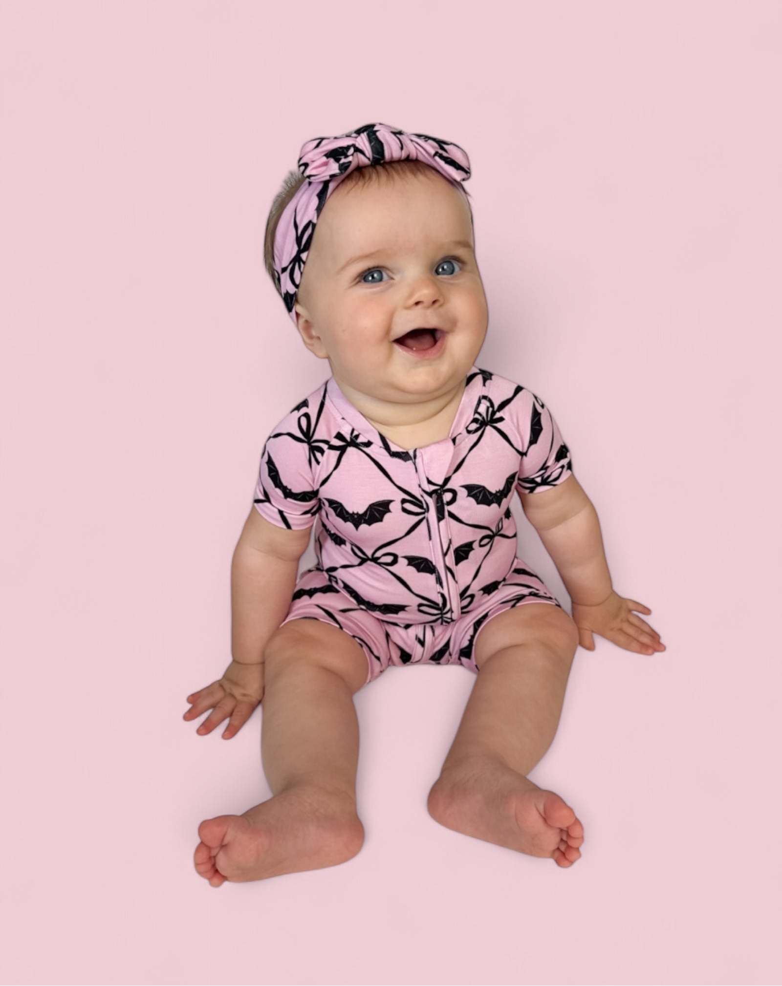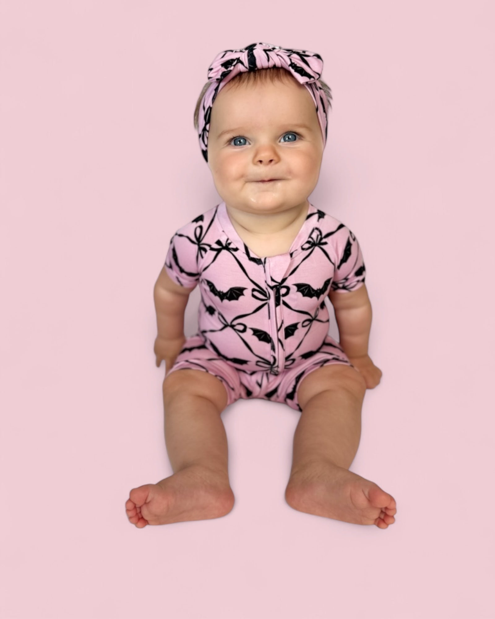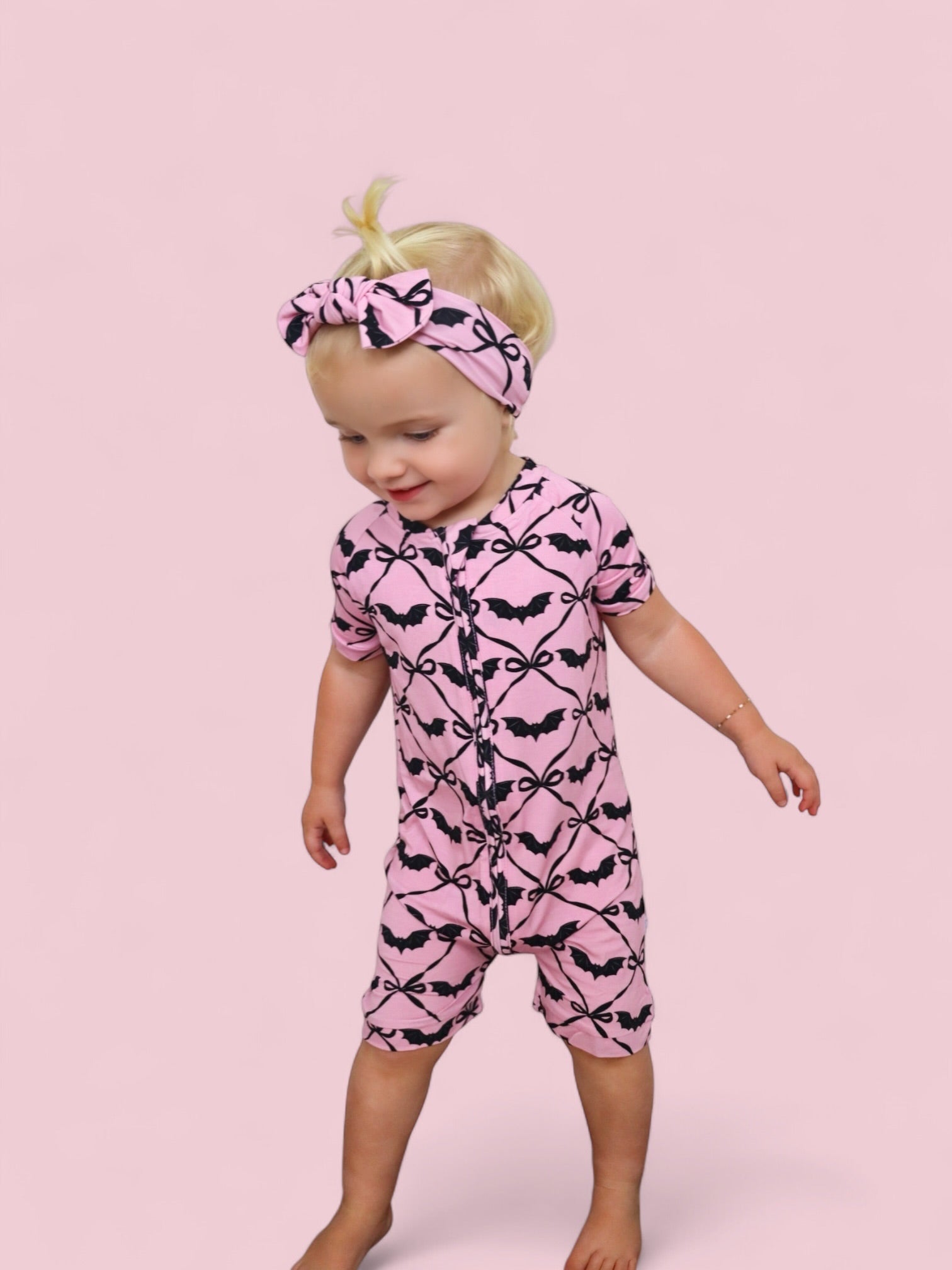 Bedtime gets a spooky-cute upgrade with the Batty Bows Dream Shortie! Featuring a pink background covered in black bows and fluttery bats, this one-piece zip romper is perfect for warm fall nights, Halloween sleepovers, and cozy mornings. With short sleeves, short legs, and our signature buttery-soft fabric, it's comfy, festive, and fang-tastically fun!