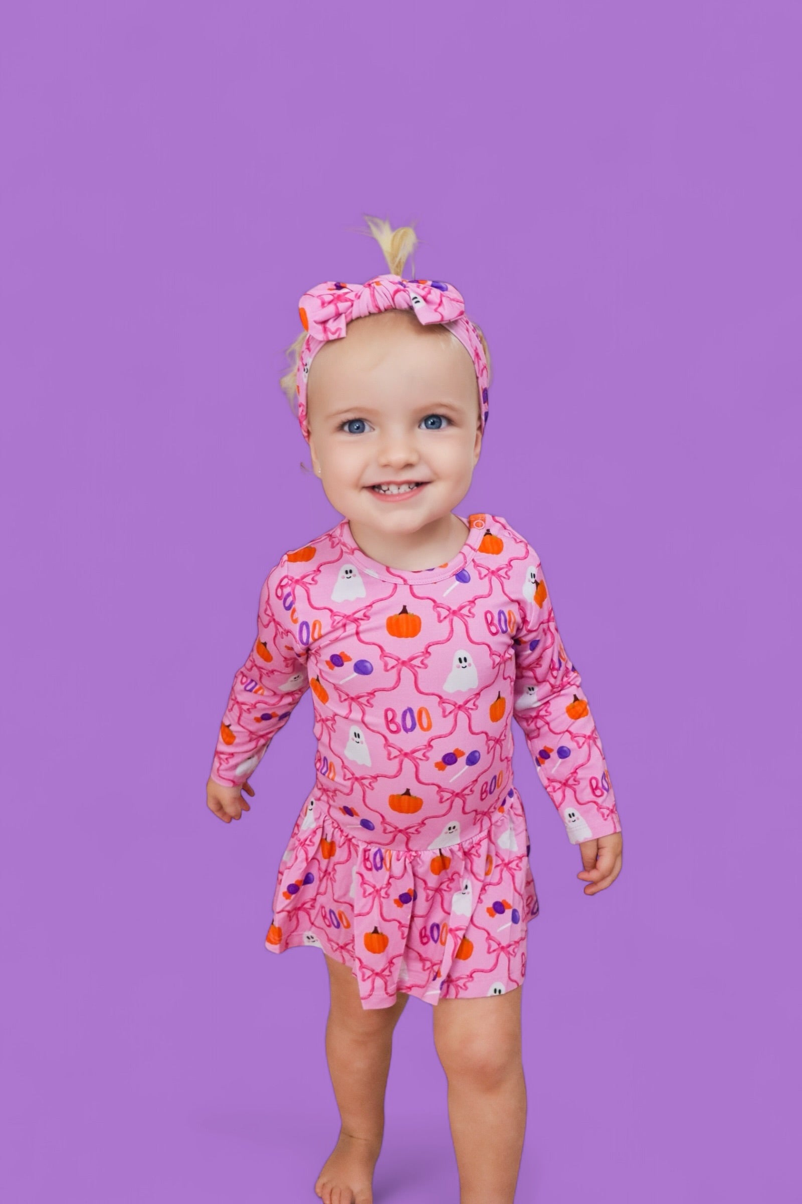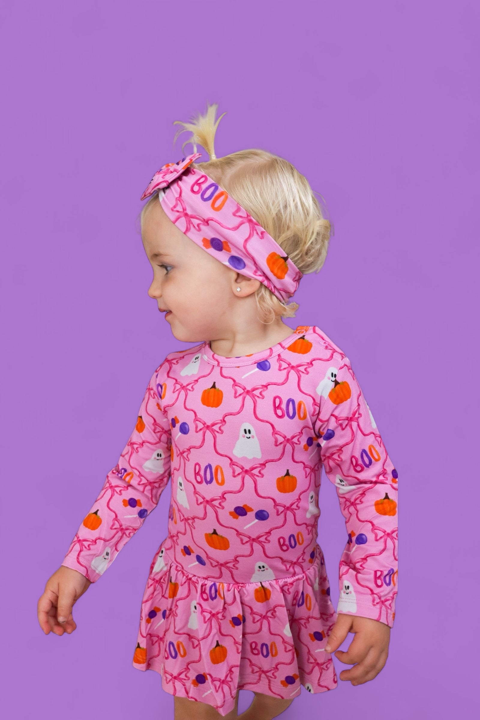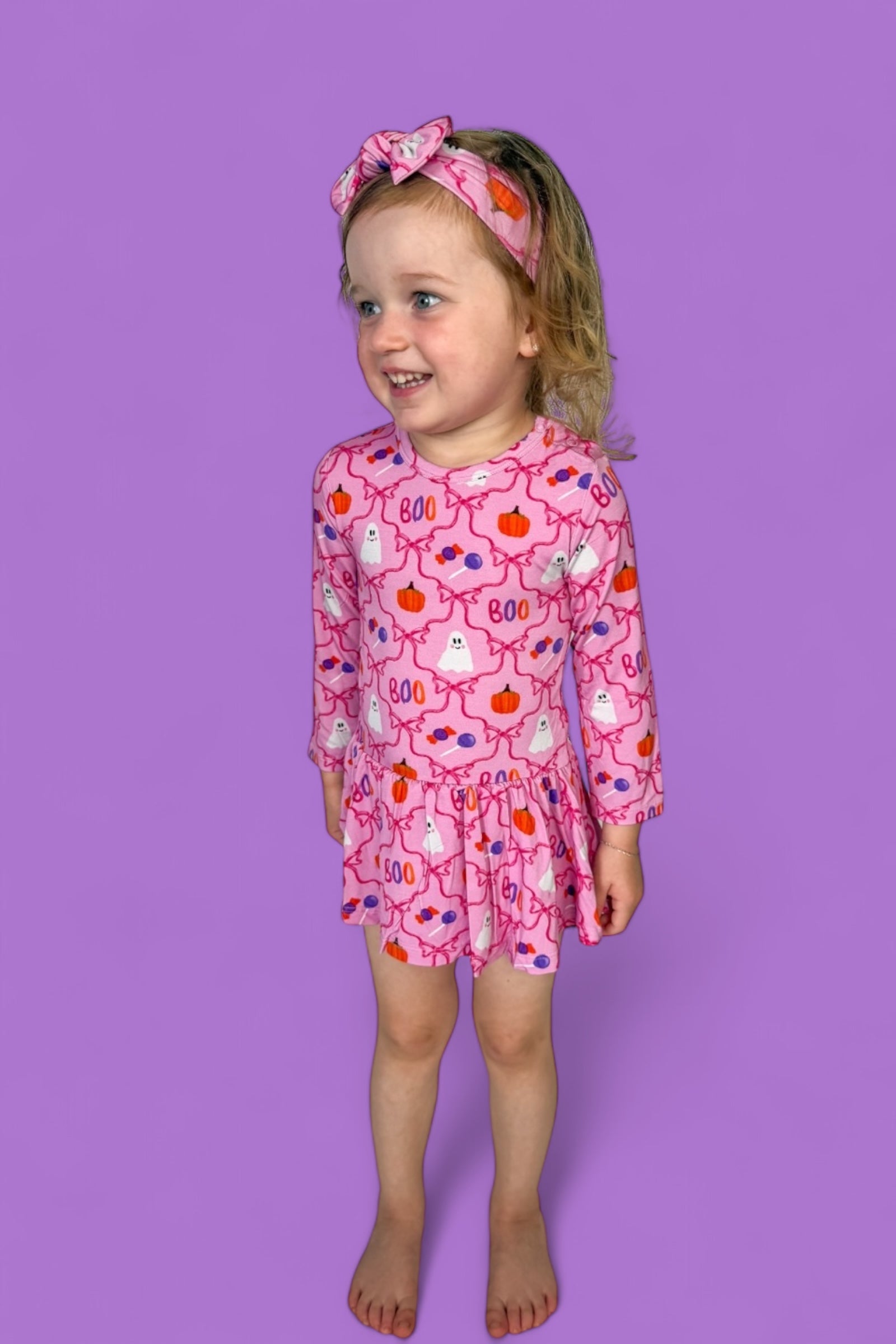 Top off her Halloween look with the Berry Sweet Boo Dream Bow! Featuring a playful pink print filled with cheerful ghosts, pumpkins, candy, and dainty bows, this bow is the perfect blend of spooky and sweet.