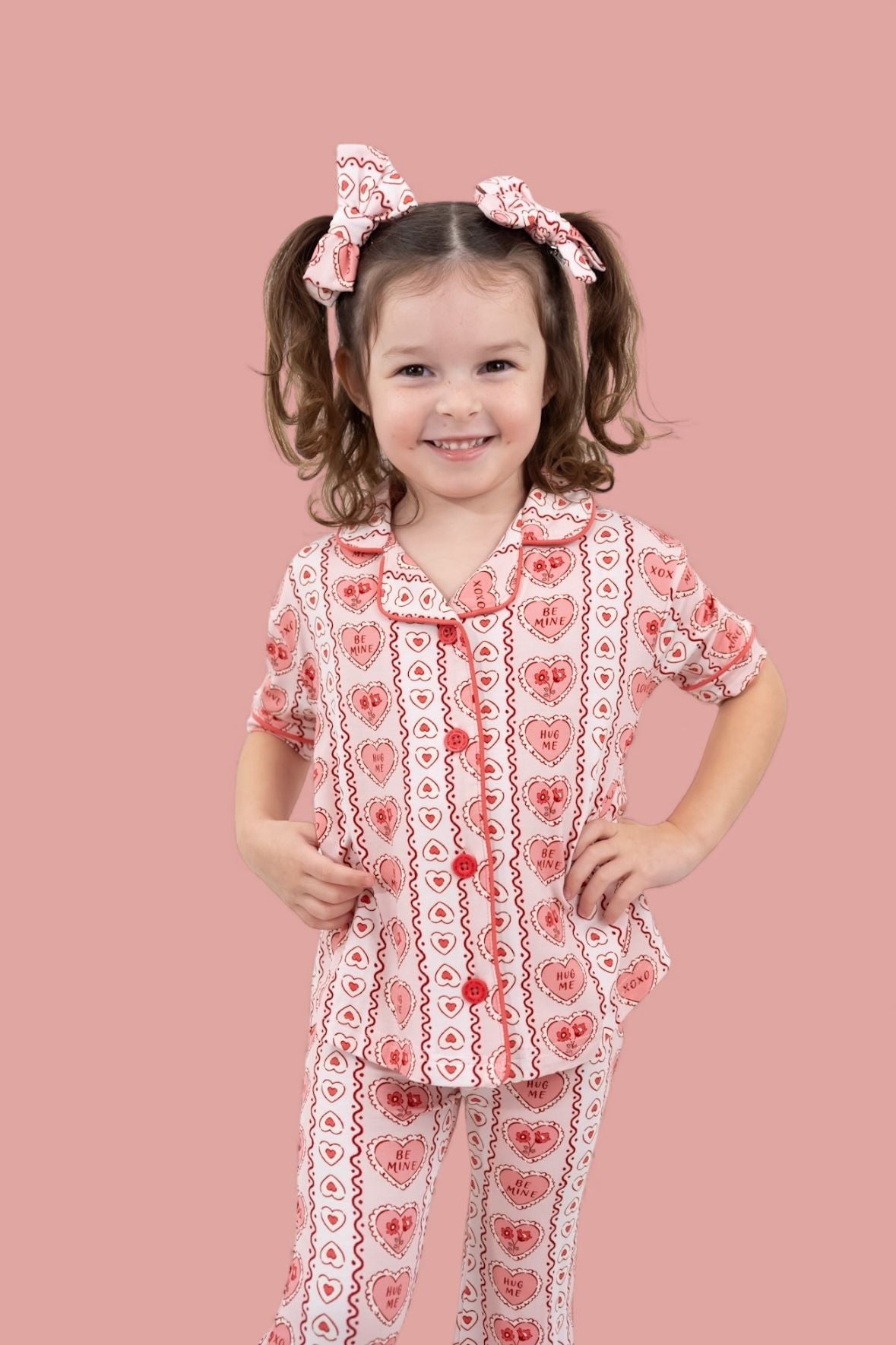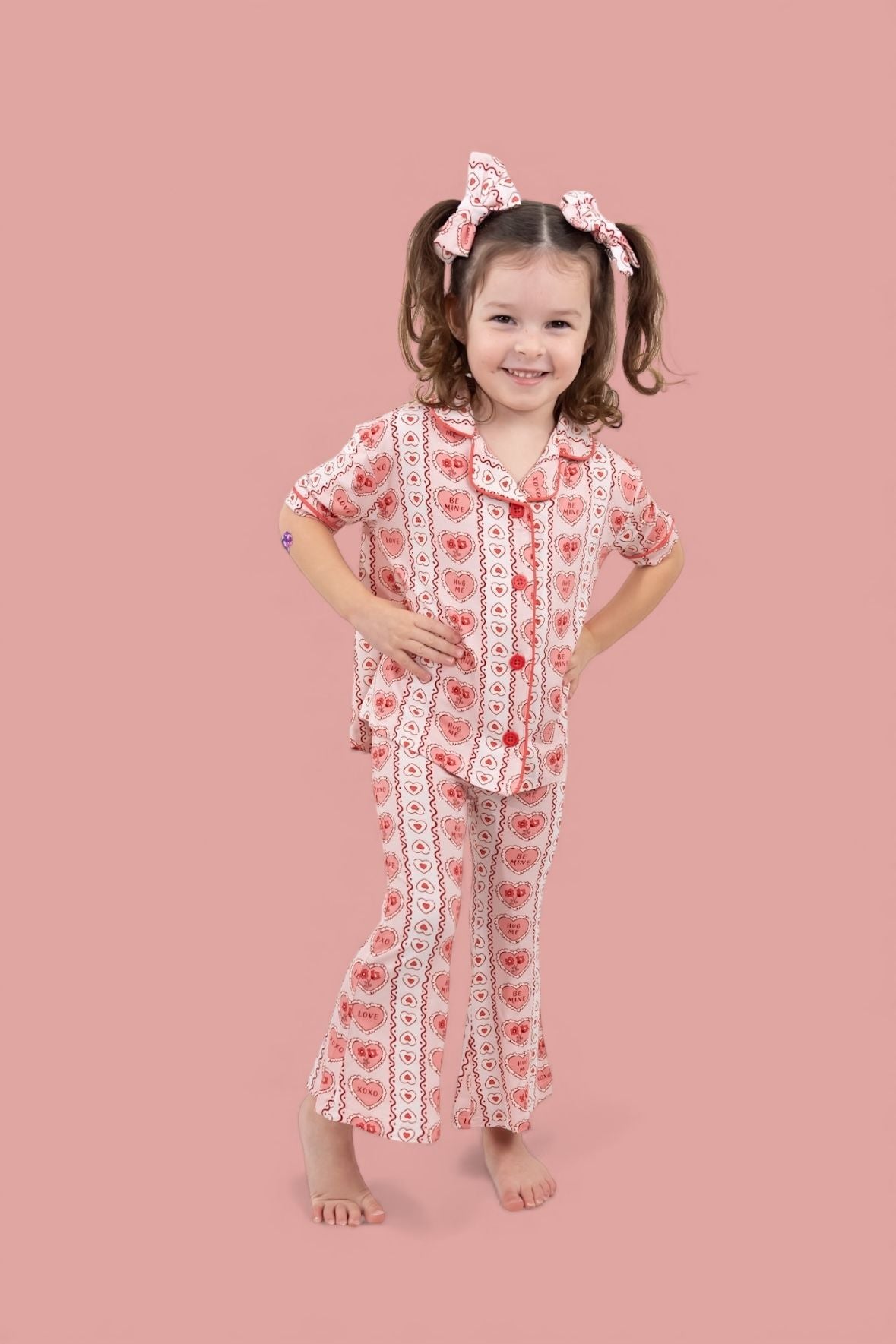 Your little sweetheart will be head-over-heels for this flirty, heart-filled set! The Candy Hearts Dream Girl’s Flare Set features our playful print of pastel candy hearts with sweet sayings like “Love,” “XOXO,” and “Be Mine,” made from buttery-soft bamboo for ultimate comfort. The classic button-front top pairs with twirl-worthy flare pants for a cozy yet photo-ready look.
