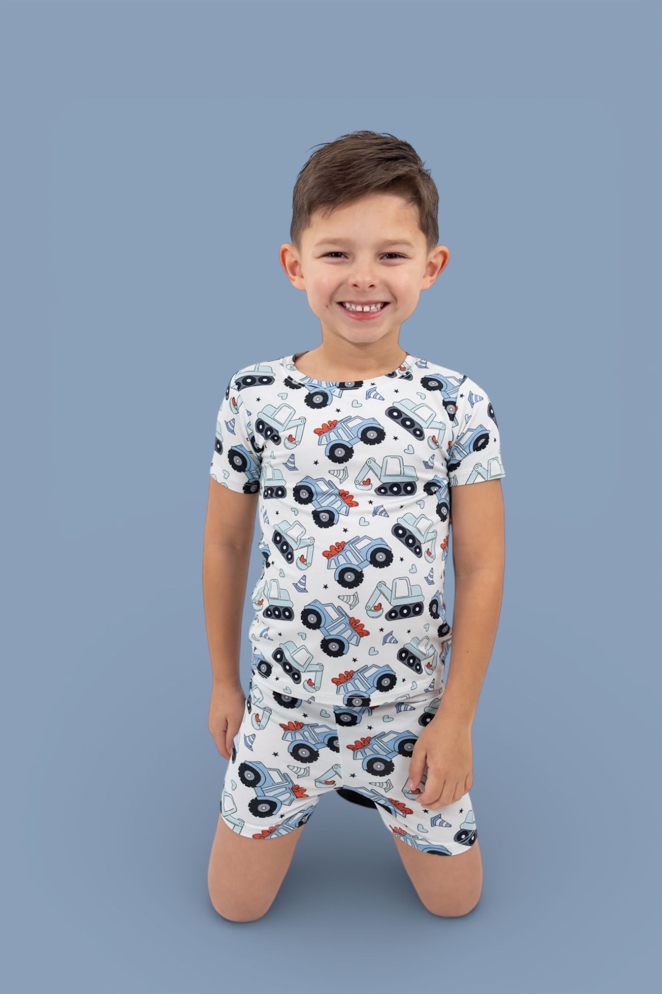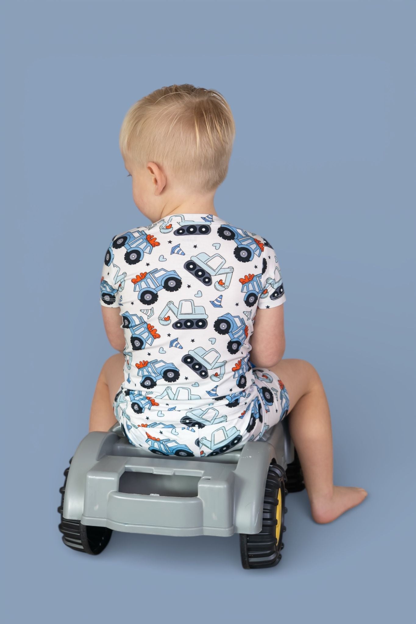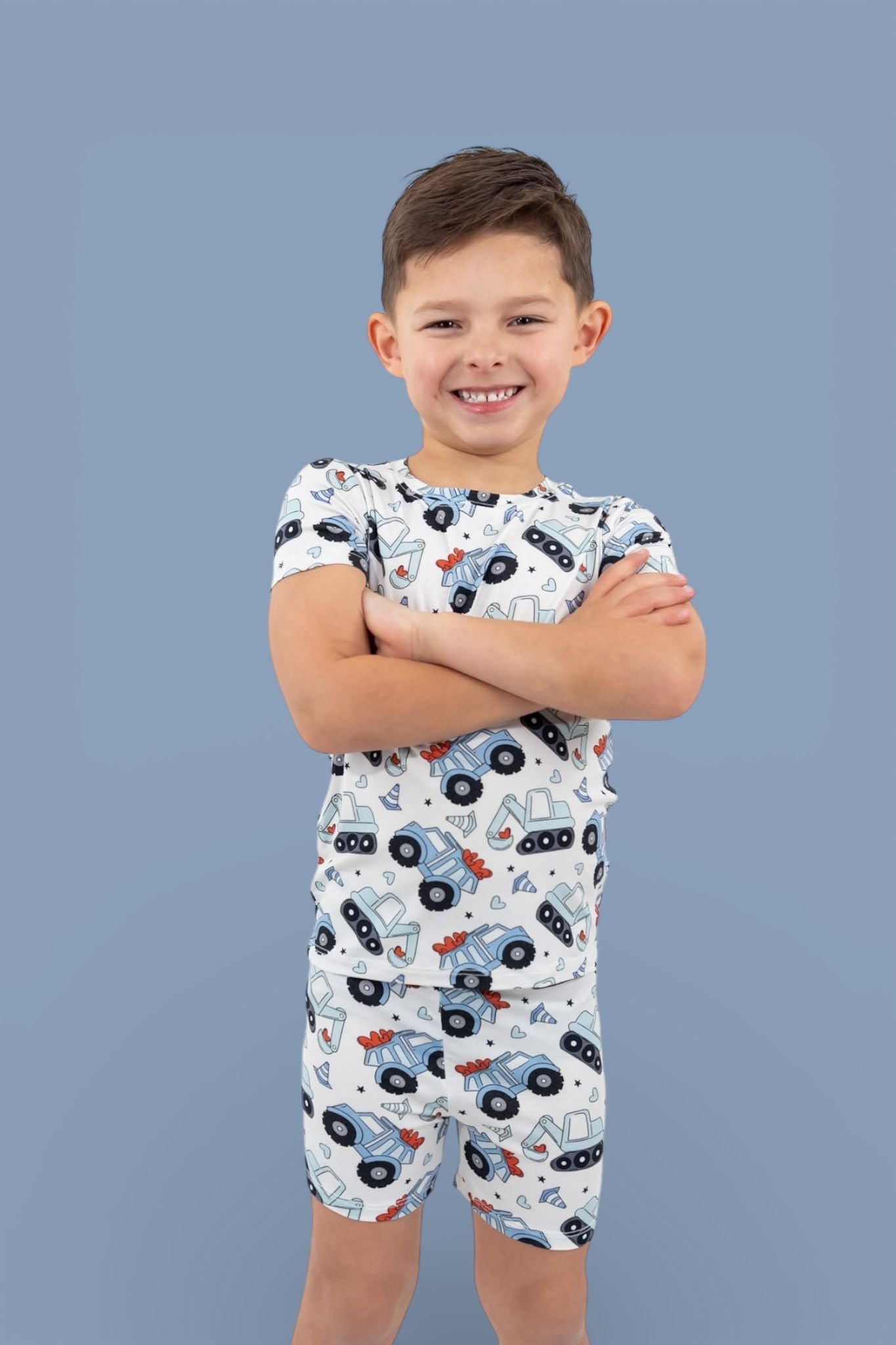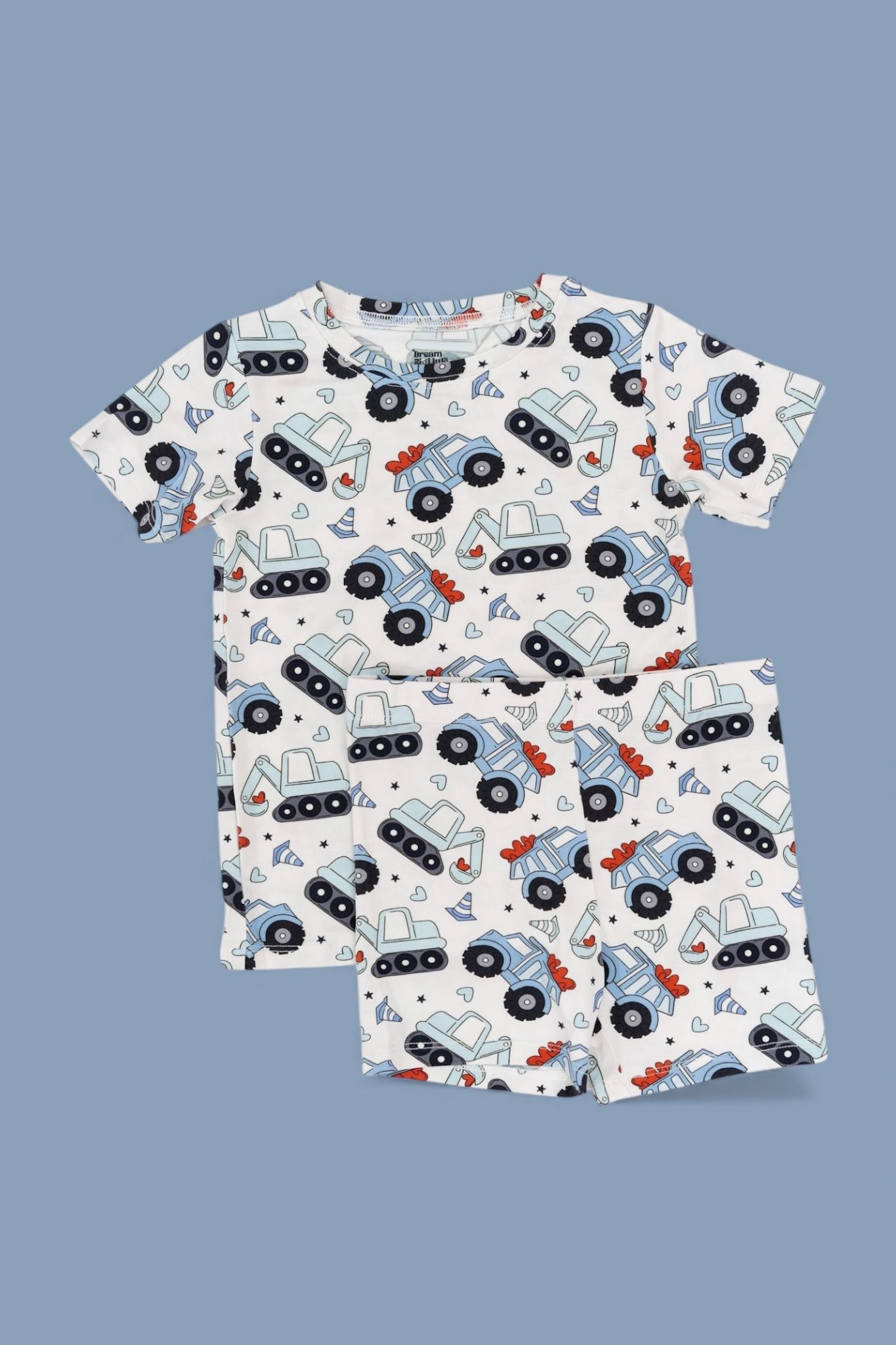 Cool, comfy, and built for fun! The Love Under Construction Dream Short Set features a short-sleeve top and matching shorts covered in a playful all-over print of dump trucks, excavators, and hearts in shades of blue, gray, and pops of orange. Crafted from our signature buttery-soft bamboo fabric, this set is breathable, stretchy, and perfect for warm days, playdates, or cozy lounging.