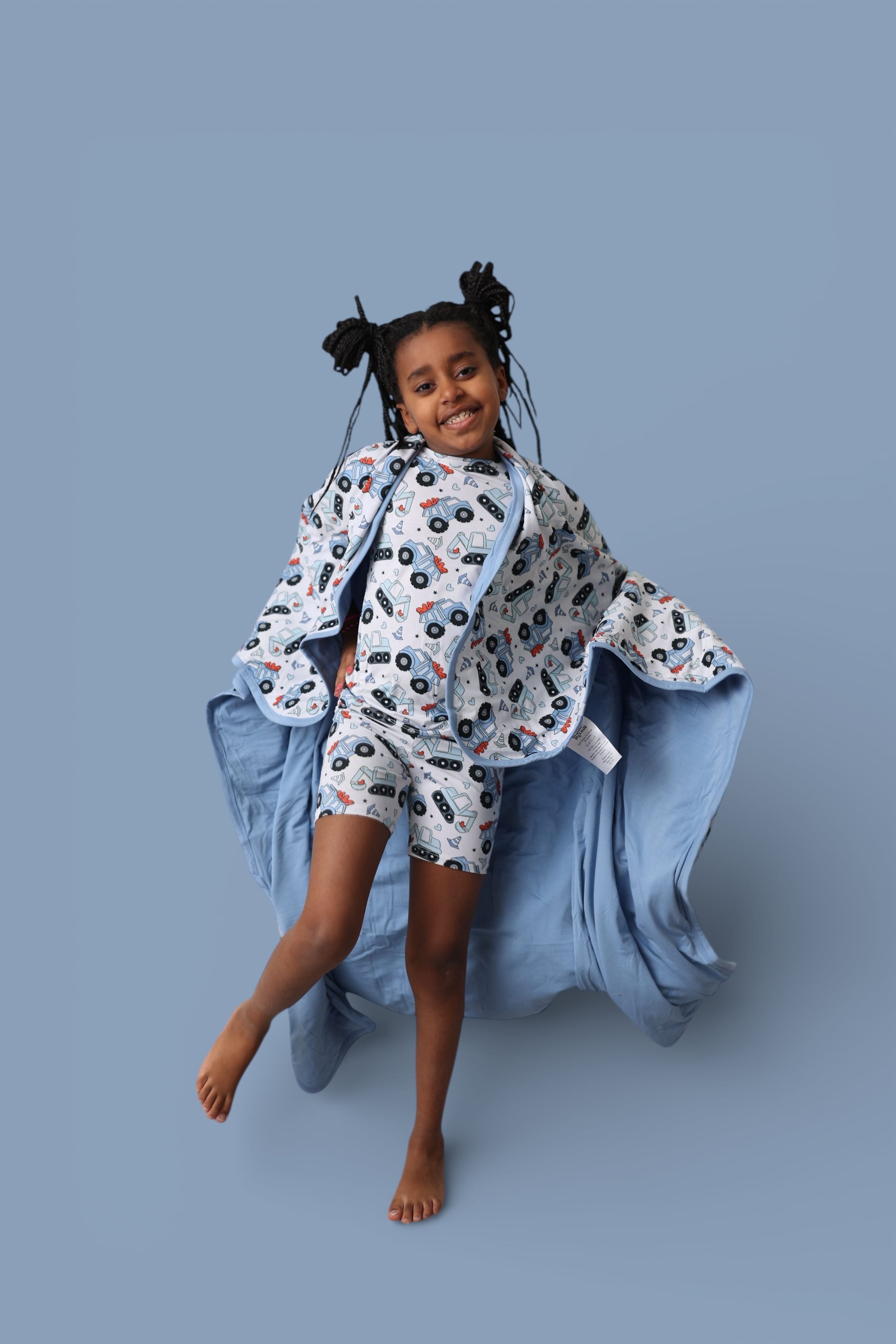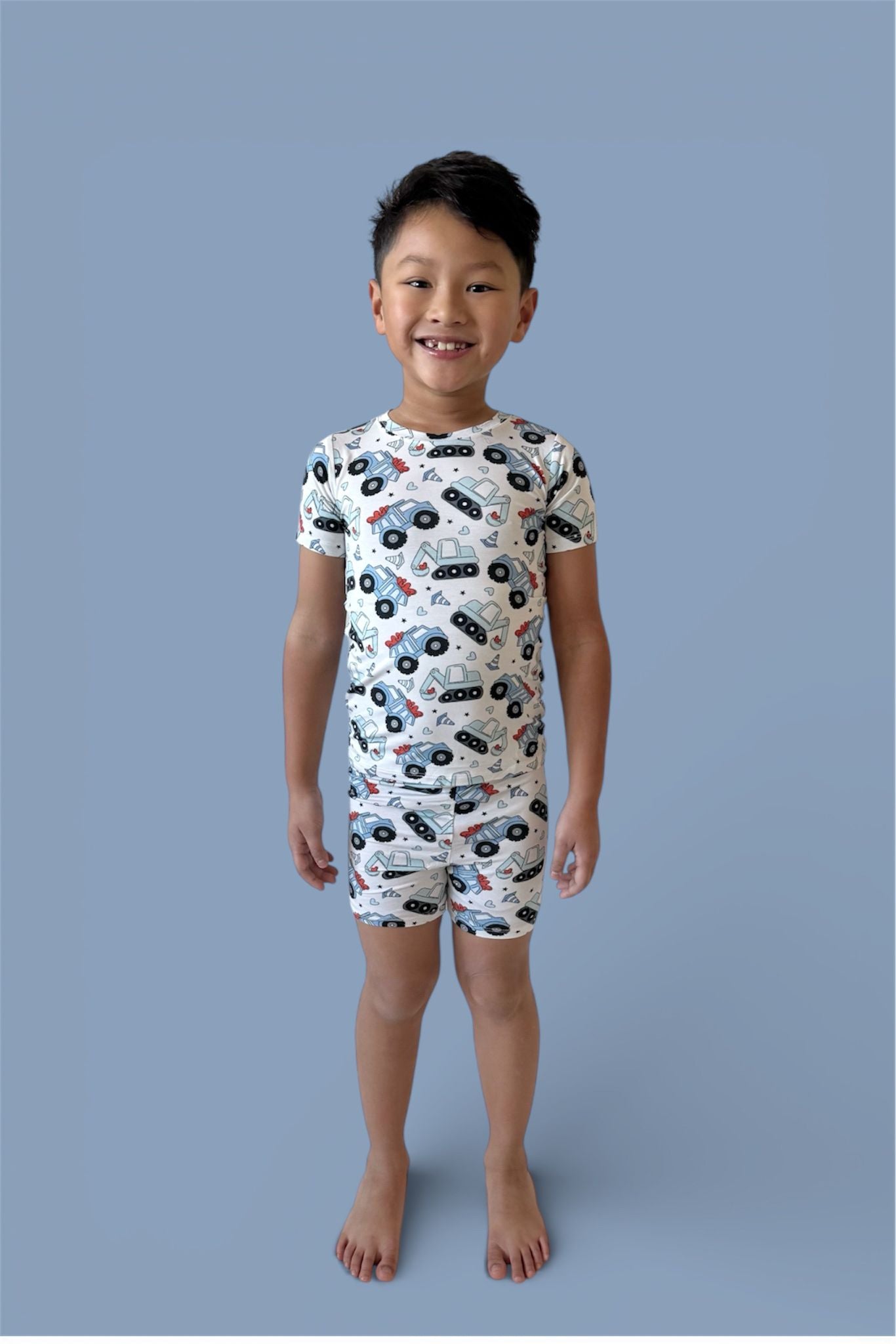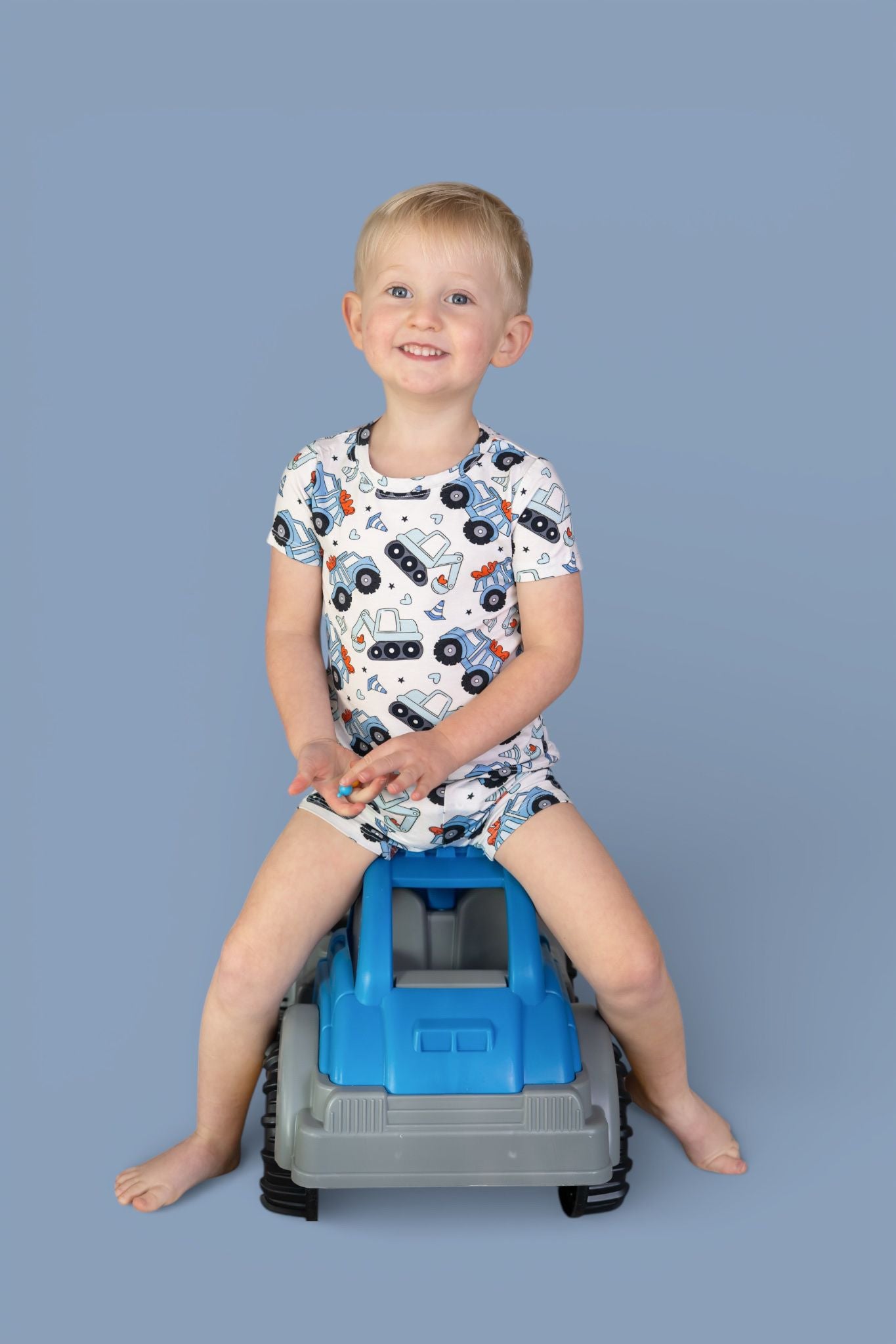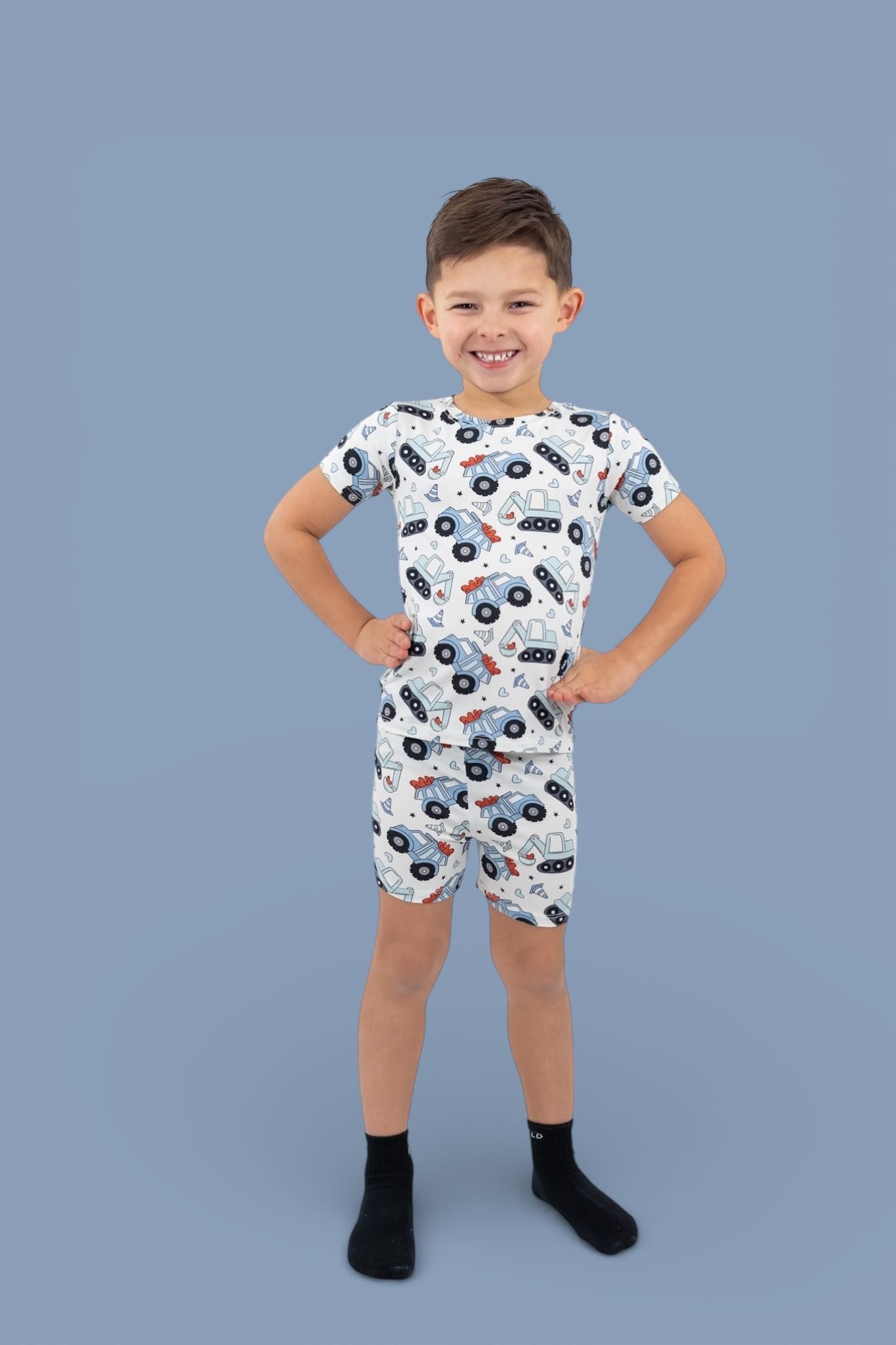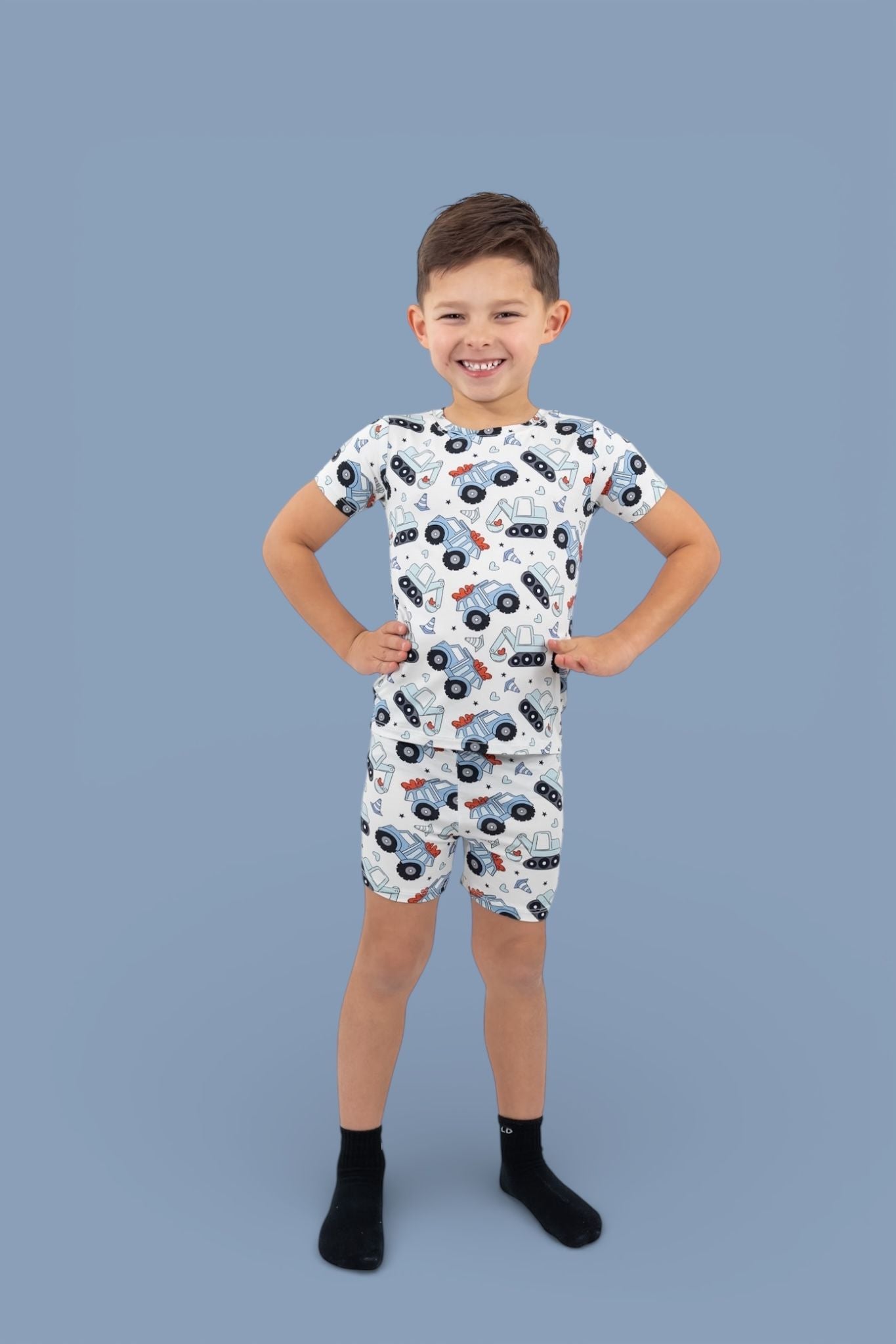 Cool, comfy, and built for fun! The Love Under Construction Dream Short Set features a short-sleeve top and matching shorts covered in a playful all-over print of dump trucks, excavators, and hearts in shades of blue, gray, and pops of orange. Crafted from our signature buttery-soft bamboo fabric, this set is breathable, stretchy, and perfect for warm days, playdates, or cozy lounging.