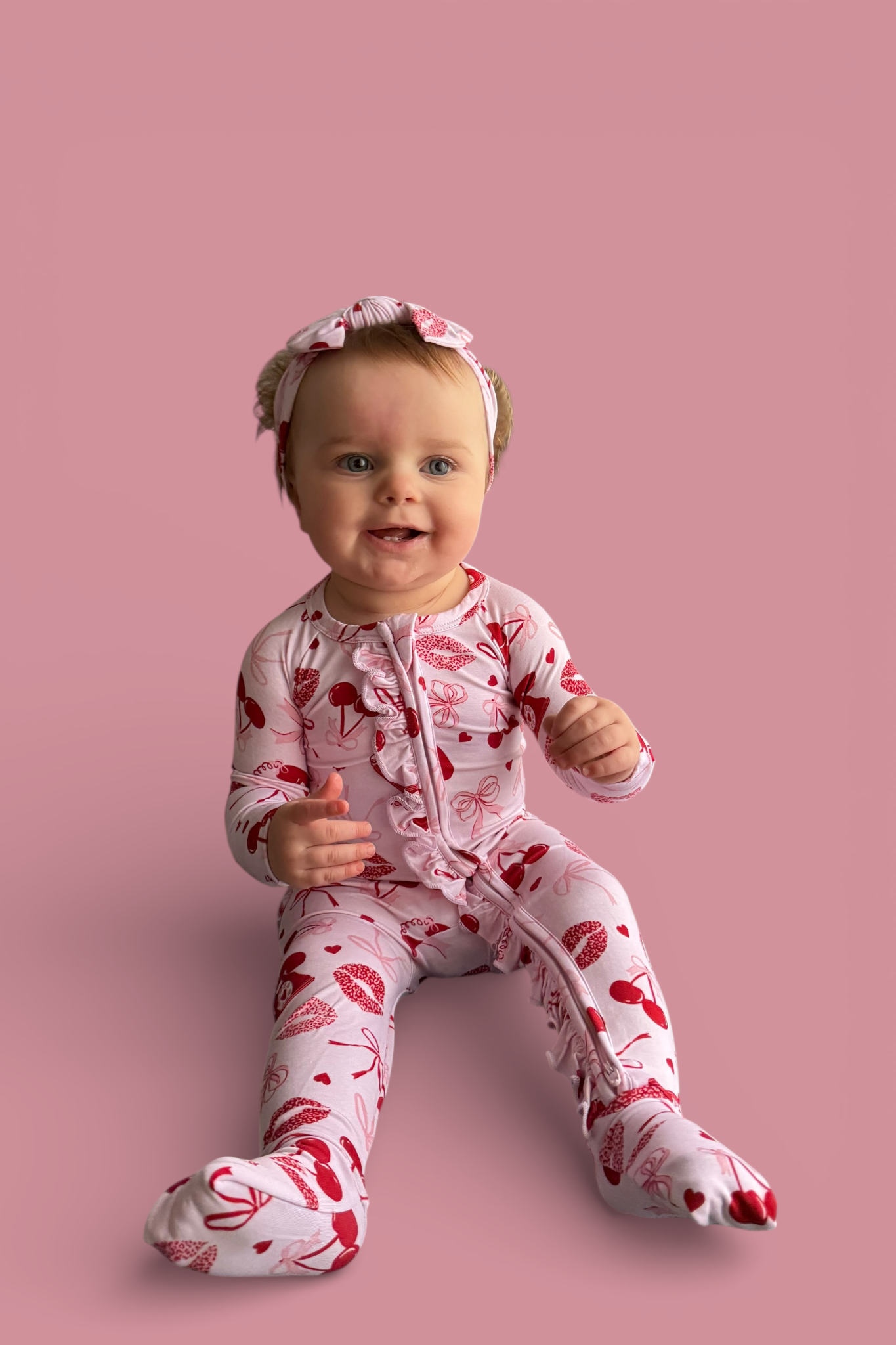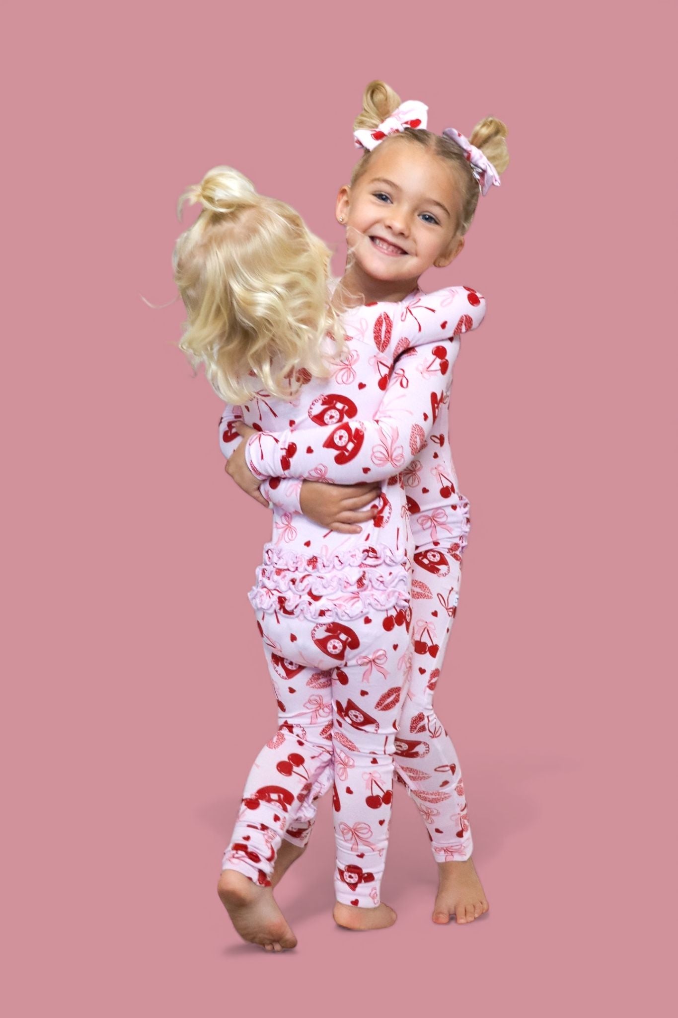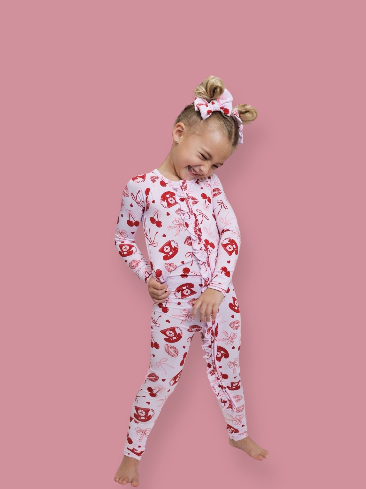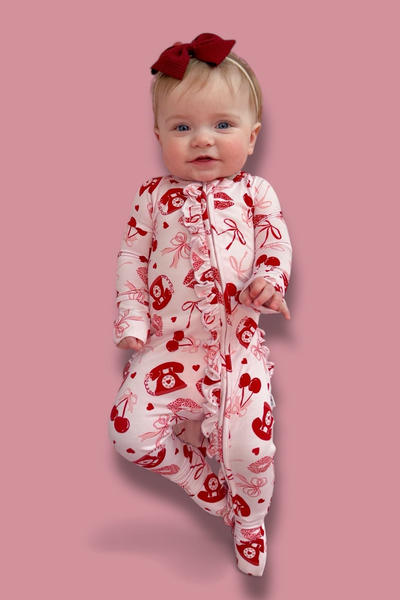 Signed, sealed, and delivered with love! The Sealed With Love Dream Ruffle Romper features a playful all-over print of vintage telephones, sweet cherries, dainty bows, and kissy lips—perfect for your little Valentine. Made from our signature buttery-soft bamboo, this romper combines comfort and charm with every detail. Complete with ruffle accents and a convenient double zipper for easy changes, it’s designed for both cuteness and practicality.