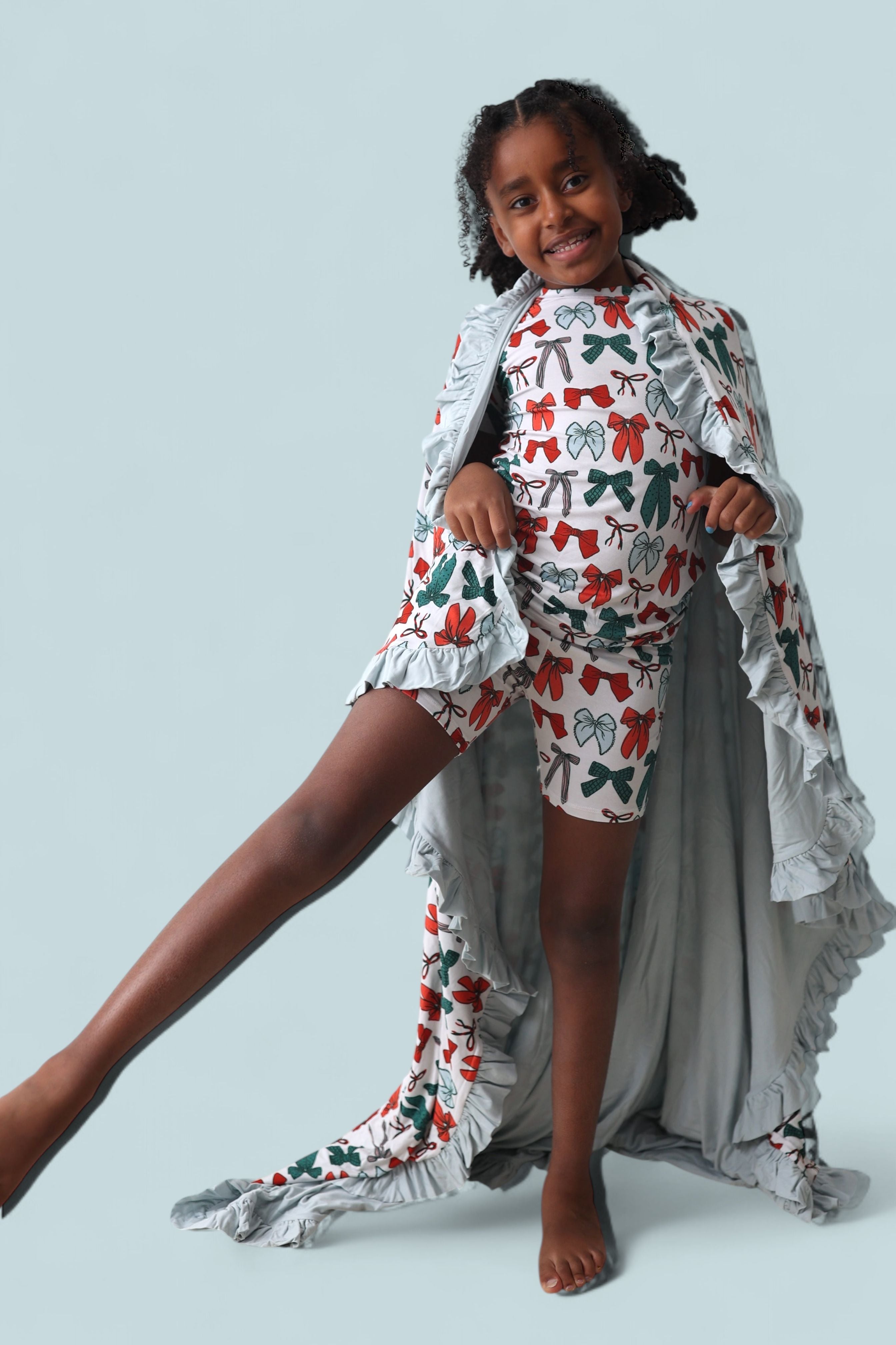Keep it cool, comfy, and festive with our Be Merry Bows Dream Short Set! Featuring a charming mix of red and green holiday bows on our signature buttery-soft bamboo fabric, this short sleeve and shorts combo is perfect for warm winter nights, cookie decorating, and cozy mornings. With a stretchy, breathable fit and loads of holiday cheer, it’s the perfect set for merry little moments!