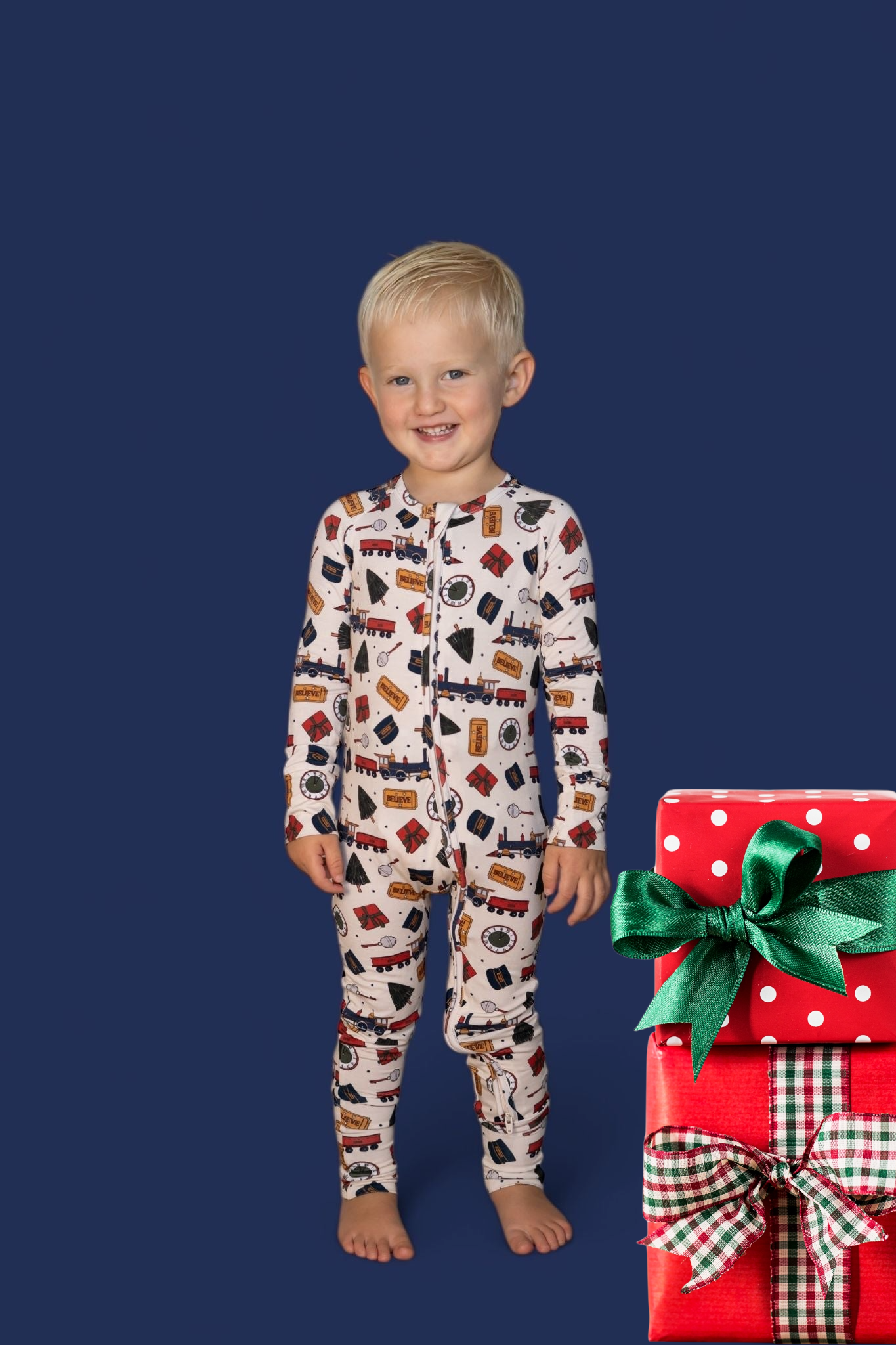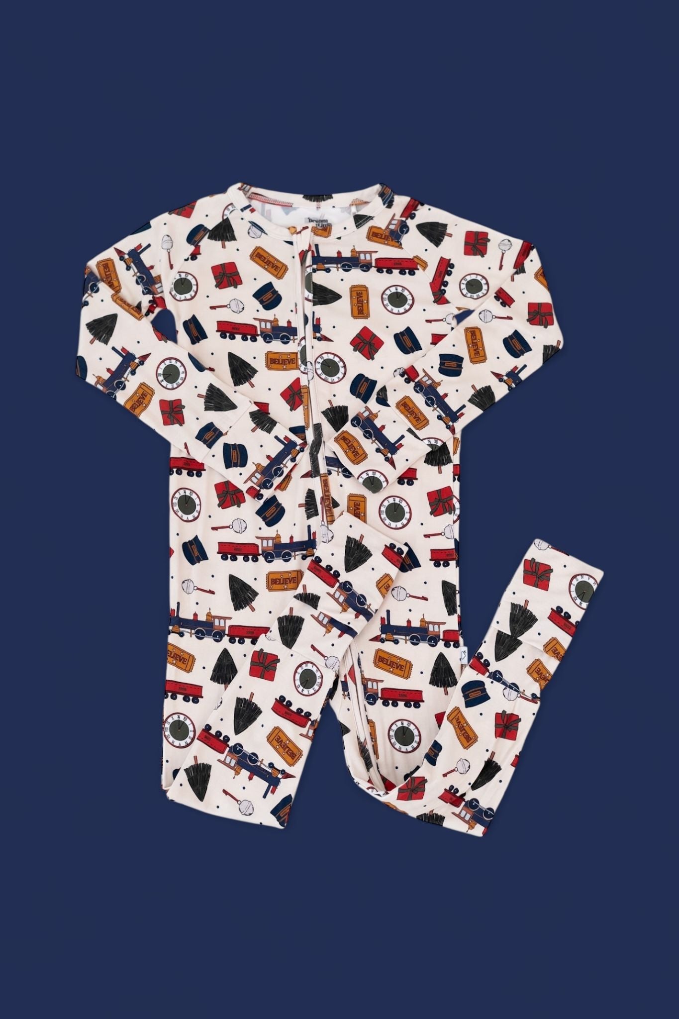 All aboard for cozy cuddles and Christmas magic! The Polar Magic Express Dream Romper is your ticket to festive fun, featuring charming trains, golden tickets, gift boxes, conductor hats, and wintry trees—all on our buttery-soft bamboo fabric. With fold-over mittens and footies for extra warmth and a double zipper for easy changes, this romper is perfect for little dreamers ready to believe in the magic of the season.