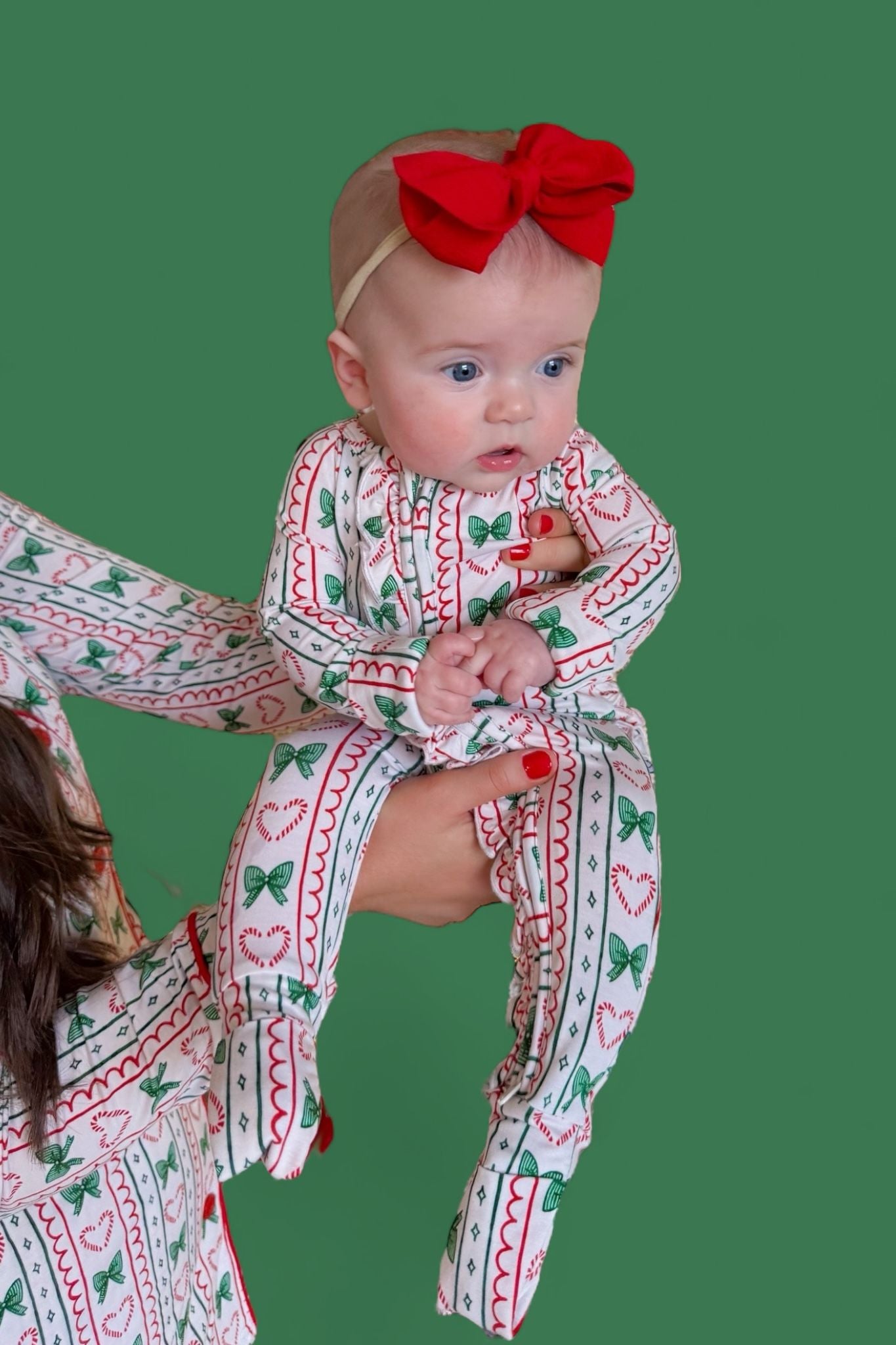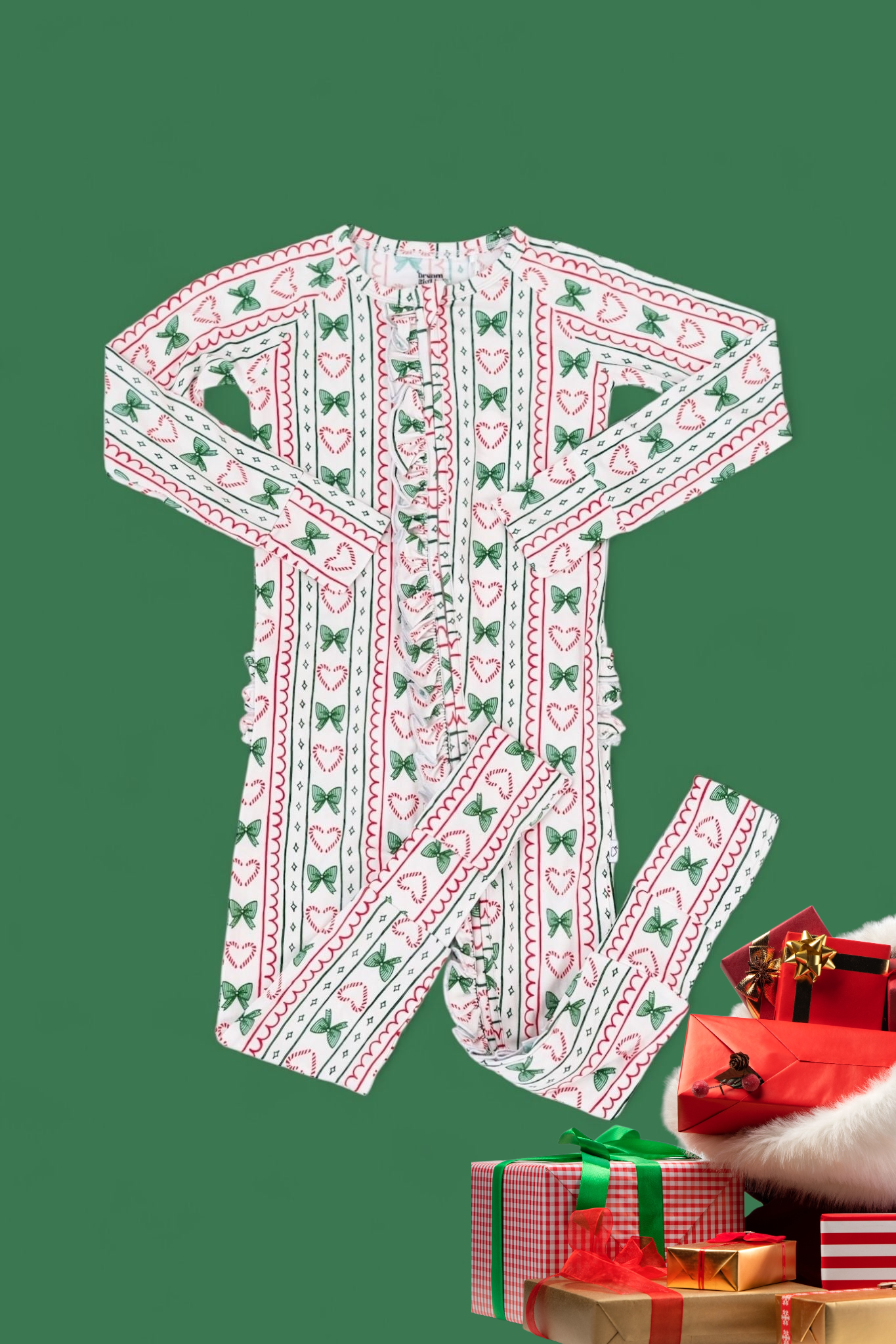 Wrap your little one in holiday happiness with our Wrapped in Joy Dream Ruffle Romper! Featuring a cheerful mix of candy cane hearts, festive bows, and playful stripes, this buttery-soft bamboo romper brings all the joy of the season in one cozy, ruffled package. With sweet ruffle details, fold-over cuffs, and a double zipper for easy changes, it’s the perfect outfit for merry moments and memory making!