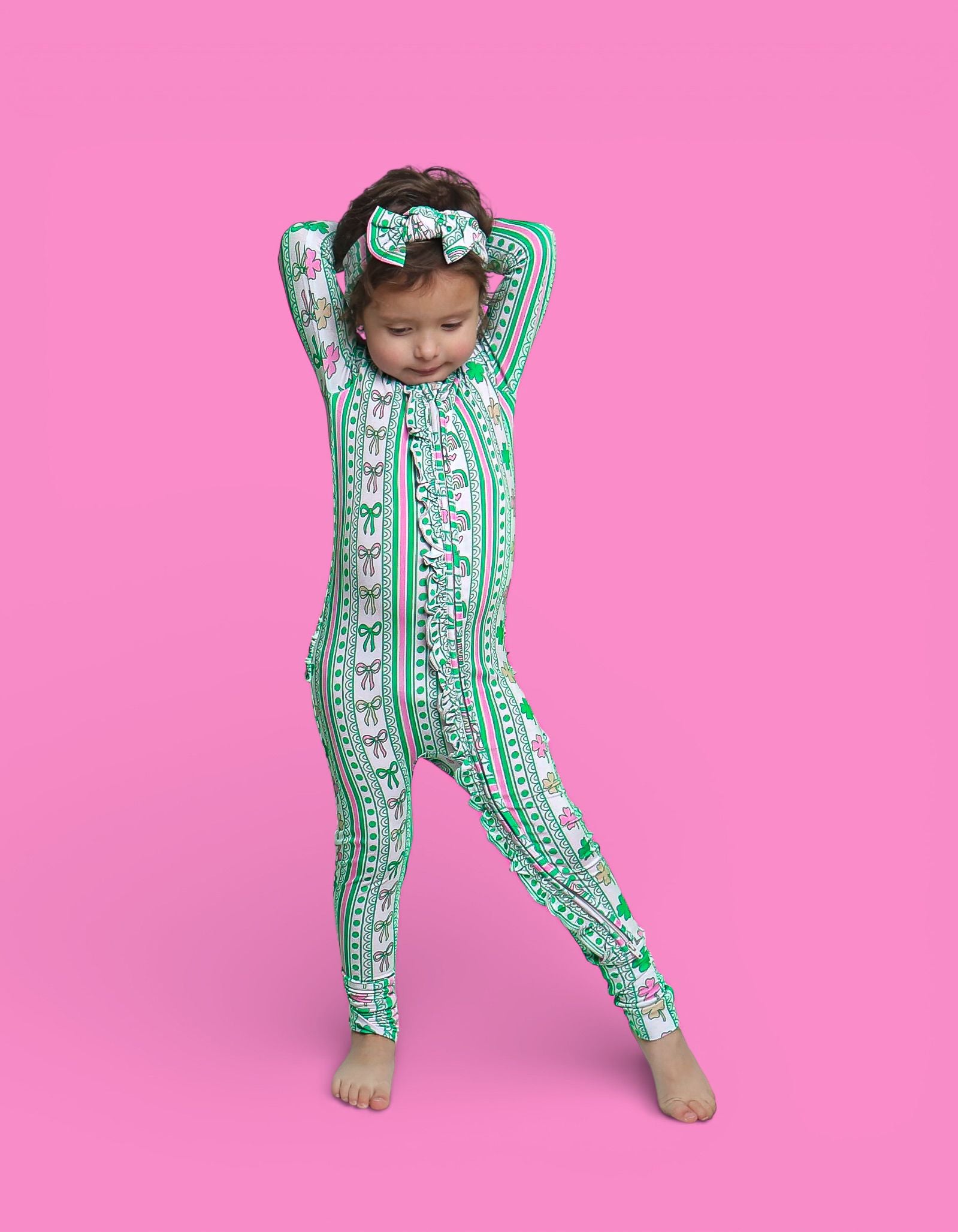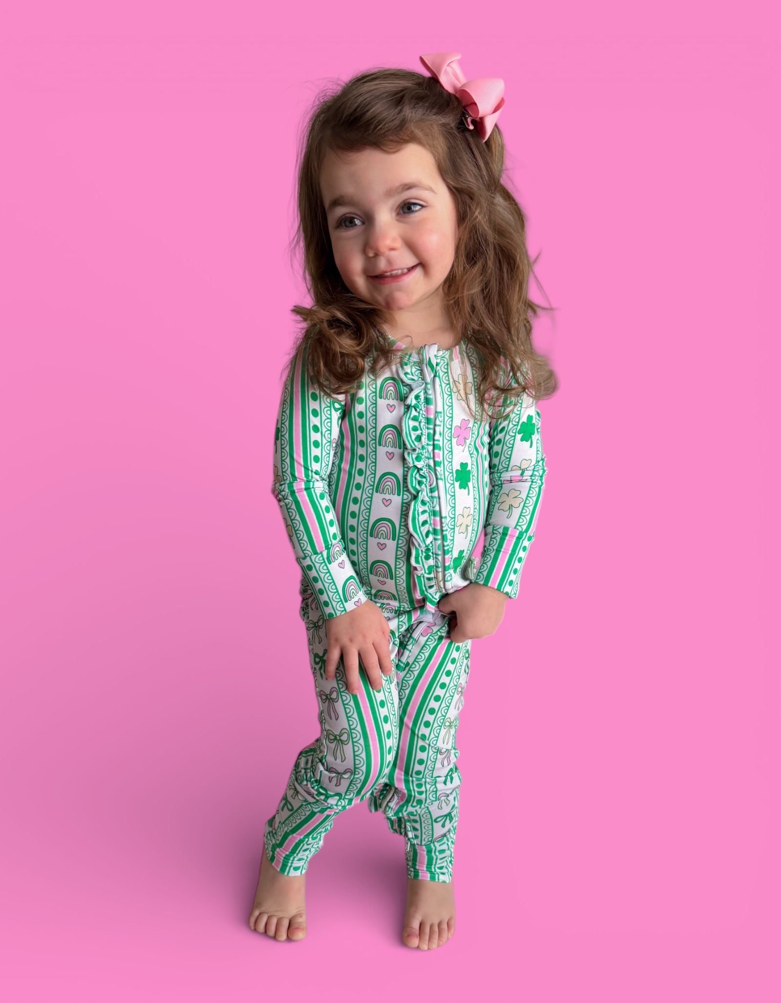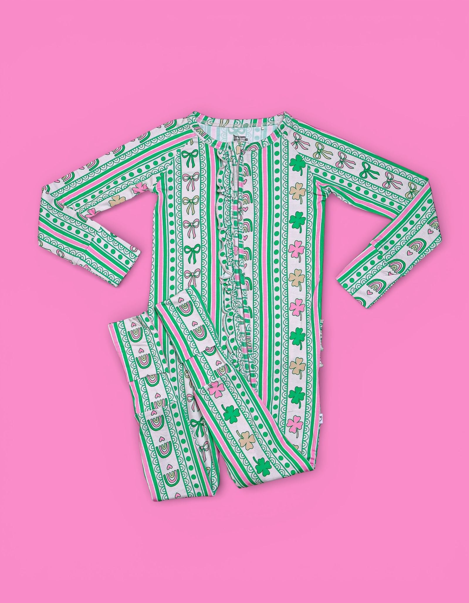 Full of charm and sweet lucky details, the Lucky Rainbow Ribbons Dream Ruffle Romper features rows of rainbows, shamrocks, hearts, and bows in vibrant greens and soft pinks, paired with adorable back ruffles for the cutest festive touch. Soft, stretchy, and comfy for all-day wear, this romper is perfect for St. Patrick’s Day photos, everyday play, and little ones who love a girly twist on lucky style. 💚✨