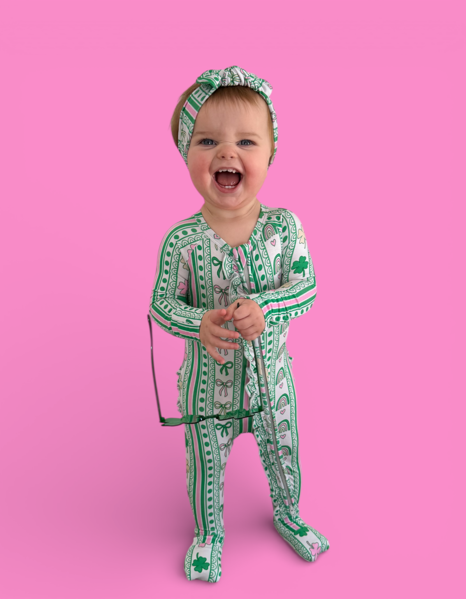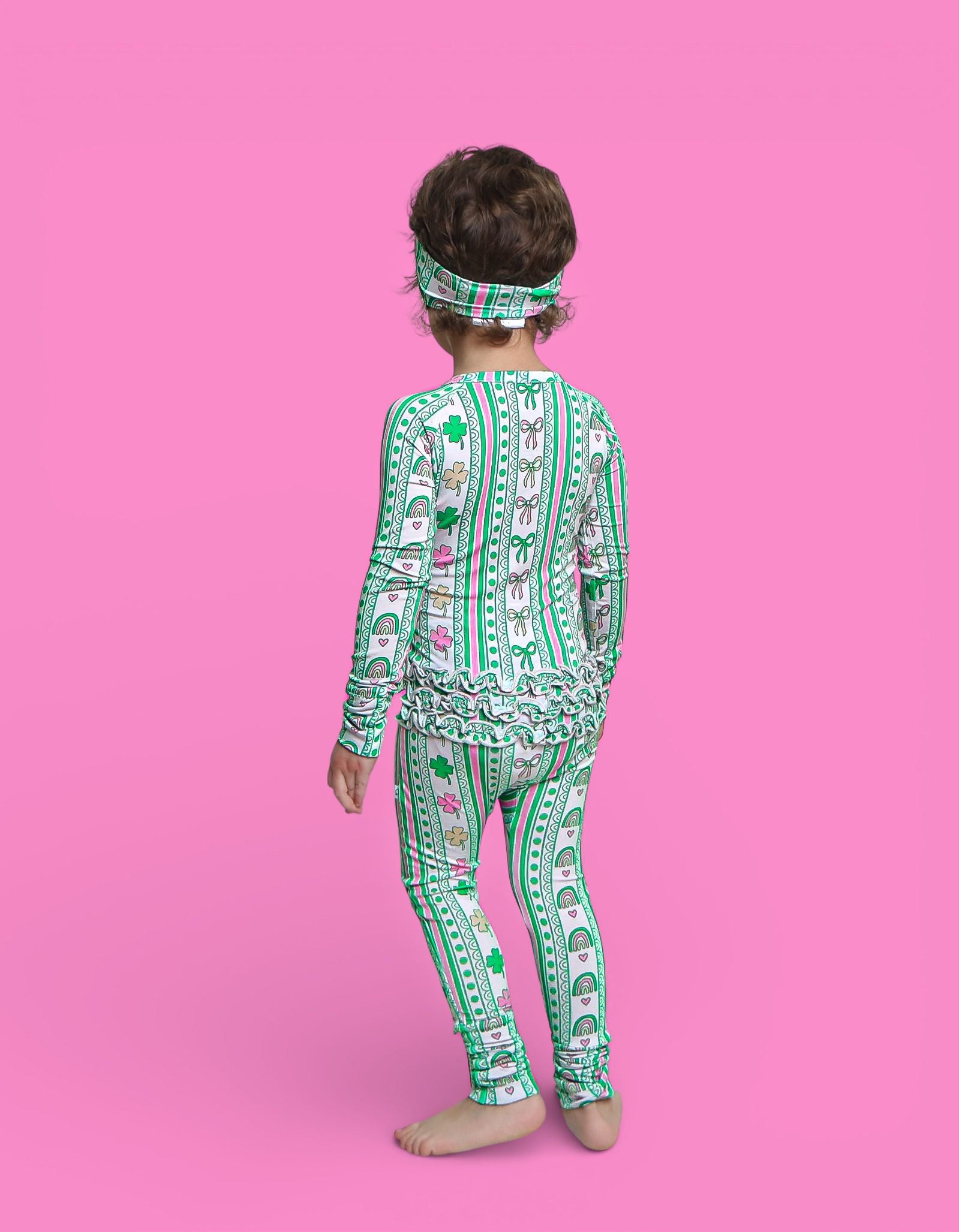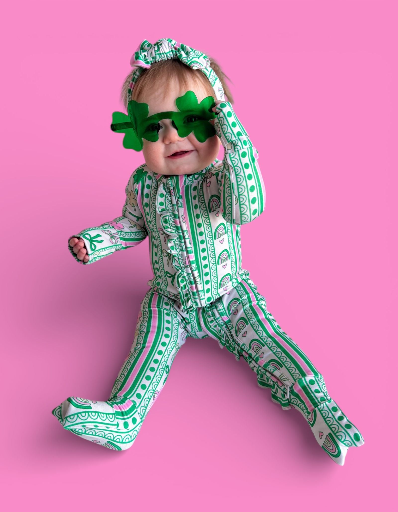 Full of charm and sweet lucky details, the Lucky Rainbow Ribbons Dream Ruffle Romper features rows of rainbows, shamrocks, hearts, and bows in vibrant greens and soft pinks, paired with adorable back ruffles for the cutest festive touch. Soft, stretchy, and comfy for all-day wear, this romper is perfect for St. Patrick’s Day photos, everyday play, and little ones who love a girly twist on lucky style. 💚✨