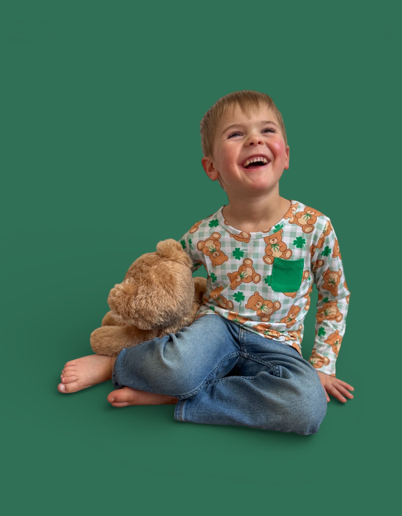 Add a little lucky charm to their everyday style! The Teddy O’Luck Dream Pocket Tee features a soft green gingham backdrop sprinkled with four-leaf clovers and the sweetest teddy peeking from the pocket. Fun, festive, and effortlessly cute for St. Patrick’s Day and beyond. 💚☘️