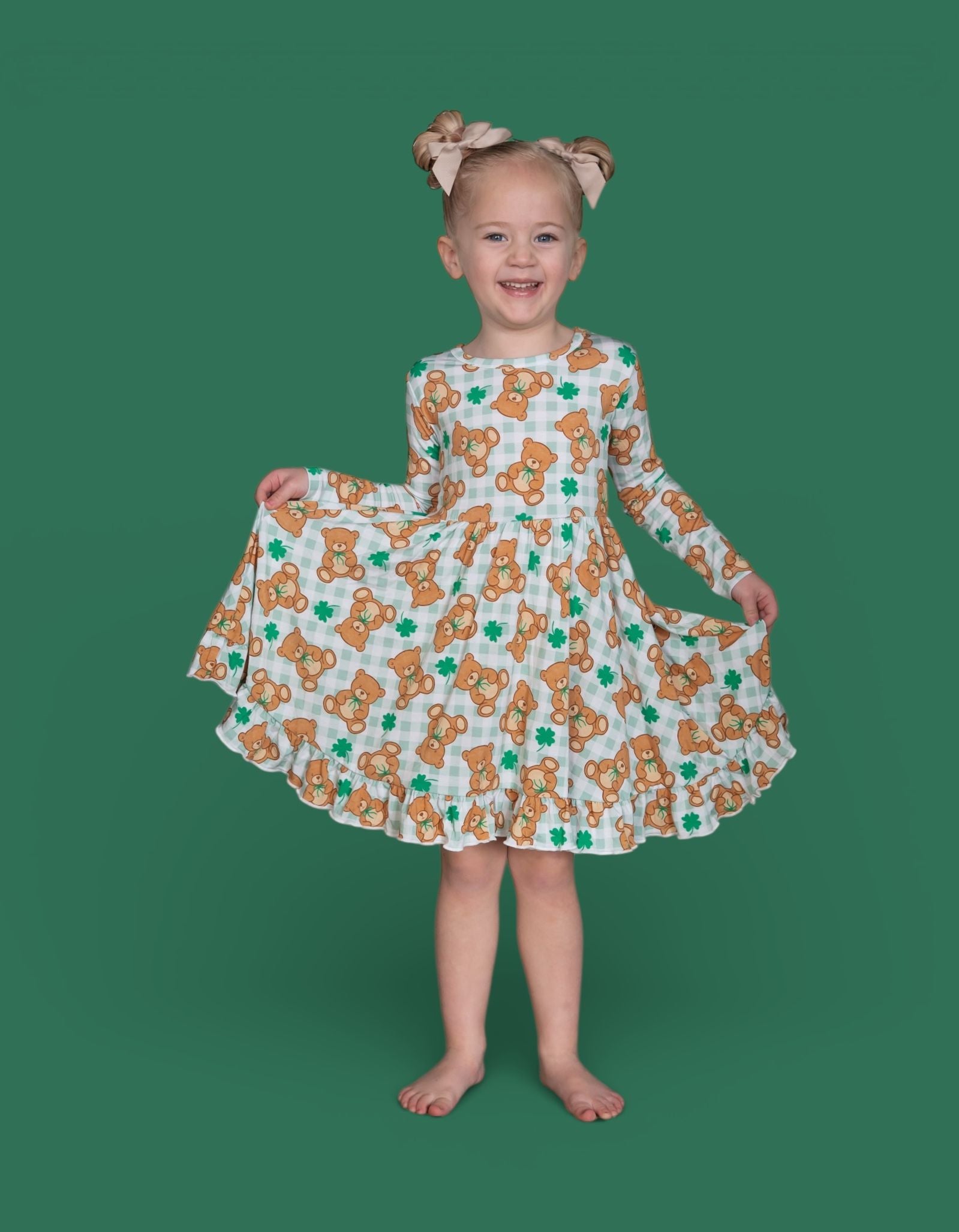 Twirl into all the lucky charm! This sweet ruffle dress features a soft green gingham print covered in playful teddy bears and four-leaf clovers, finished with a flowy ruffle hem made for spinning, dancing, and celebrating St. Patrick’s Day in style. Perfect for festive photos, sibling matching, and everyday moments that call for a little extra twirl. 💚☘️