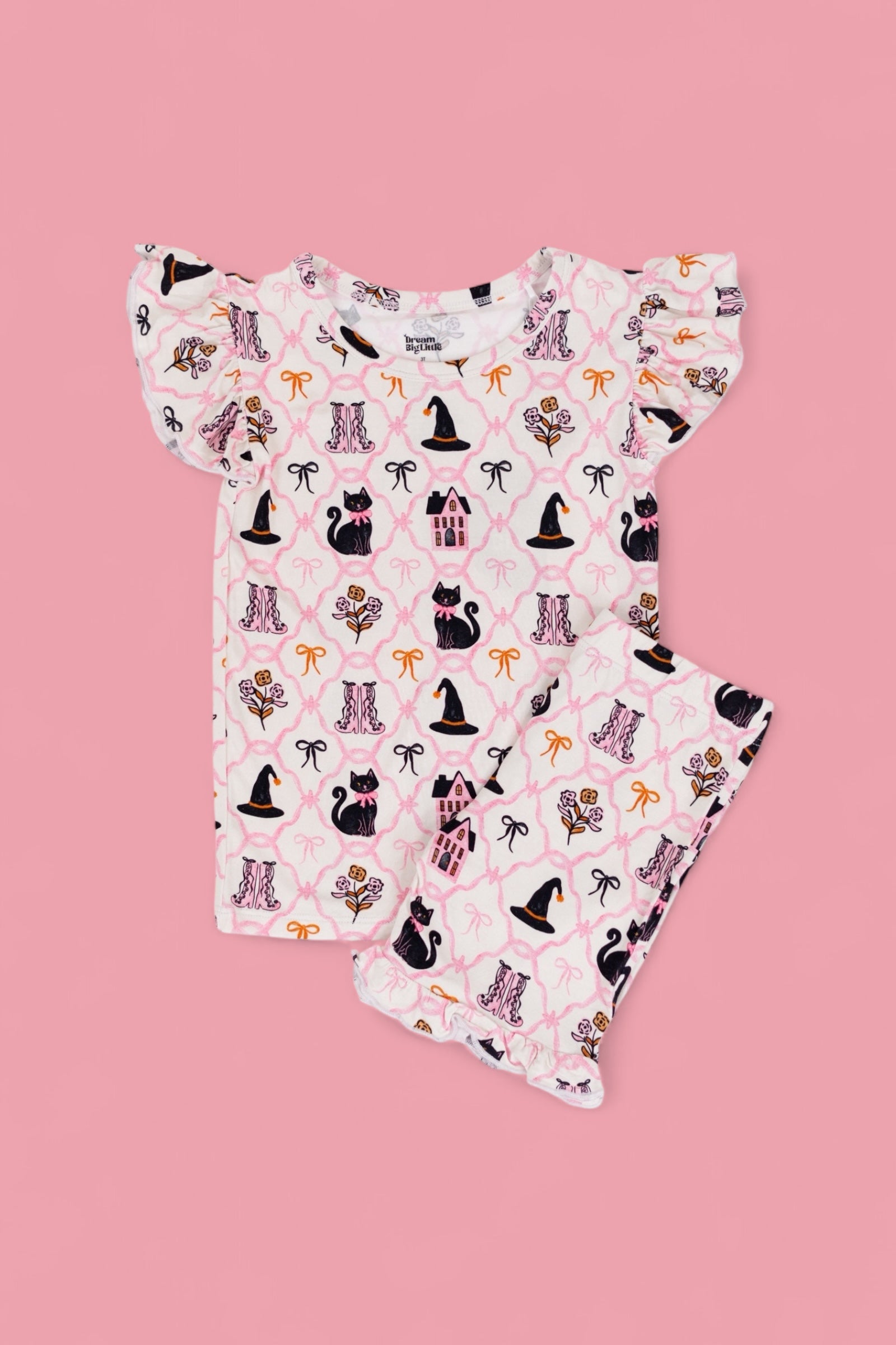 Add a little spellbinding sweetness to her fall wardrobe with the Broomsticks and Blossoms Dream Ruffle Short Set! Featuring a whimsical pink print filled with black cats in bows, witch hats, floral boots, and dainty details, this two-piece set includes a ruffle-trimmed top and soft, stretchy shorts. Made from our signature buttery-soft fabric, it’s perfect for playtime, pumpkin patches, and twirling through spooky season.