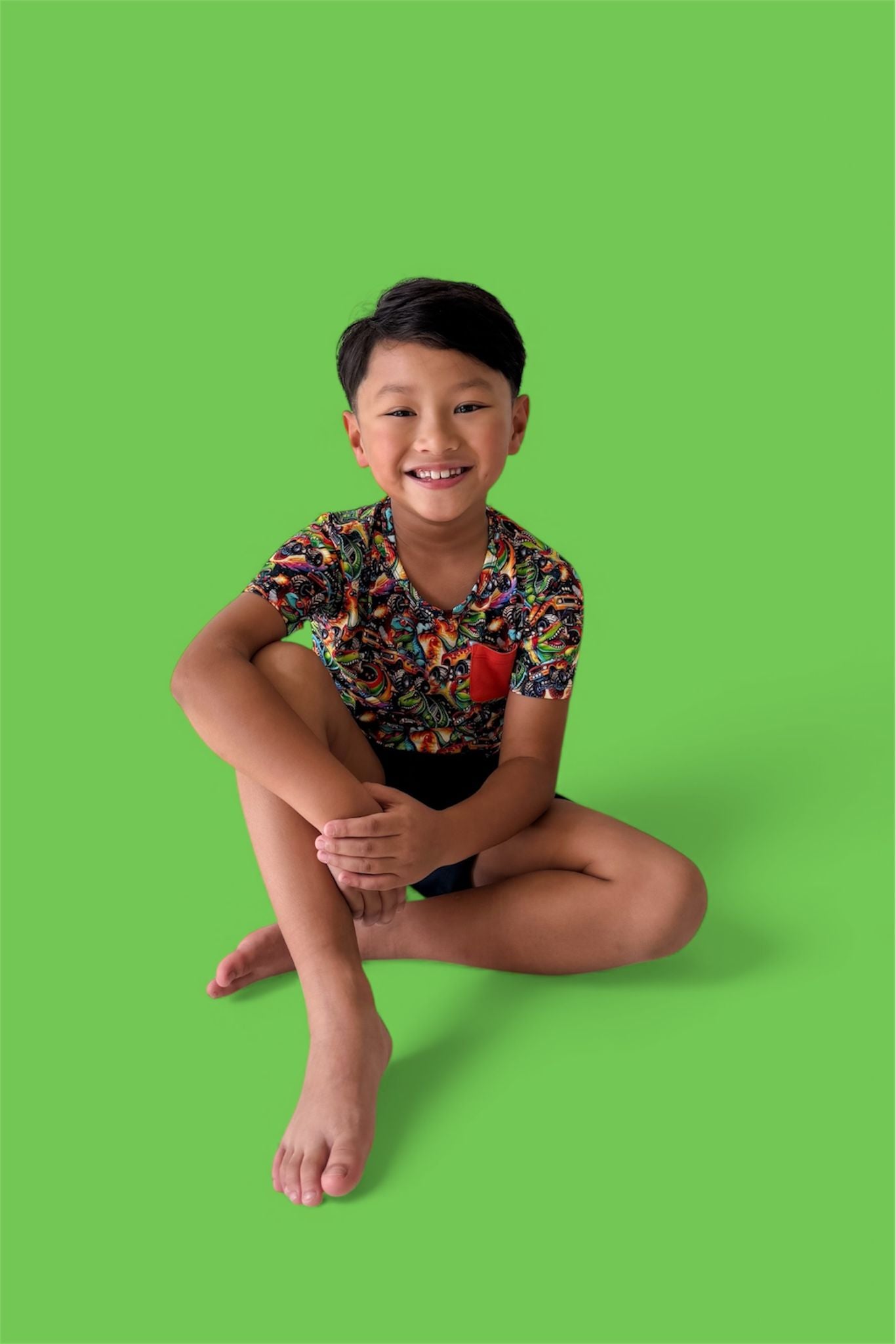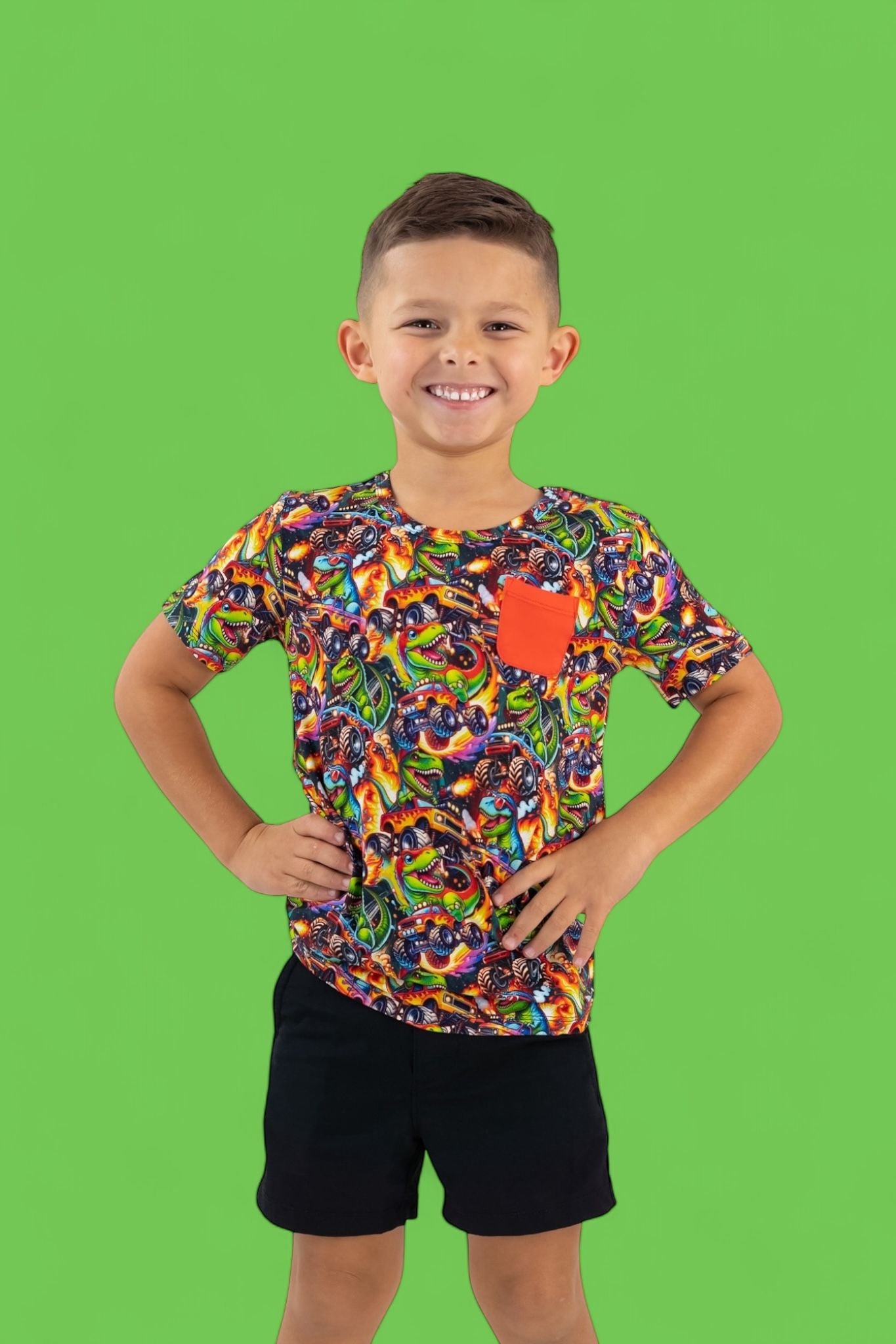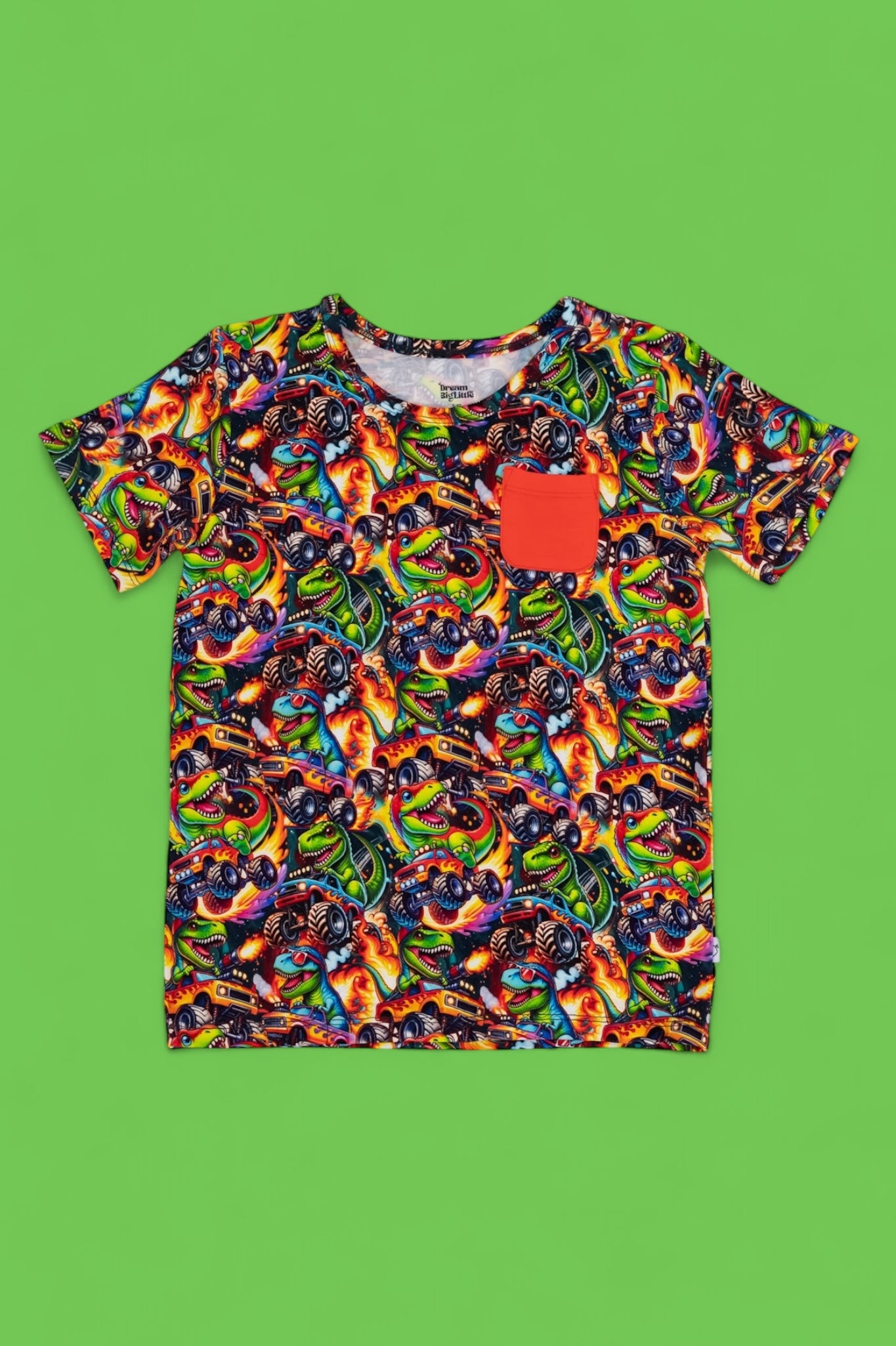 Get ready to fuel up on fun with our Roar and Rev Pocket Tee! This high-energy shirt is packed with roaring dinosaurs and revved-up monster trucks, crashing together in a wild, colorful print that’s full of motion and mega attitude. It’s a total thrill ride for kids who live loud and play even louder.
