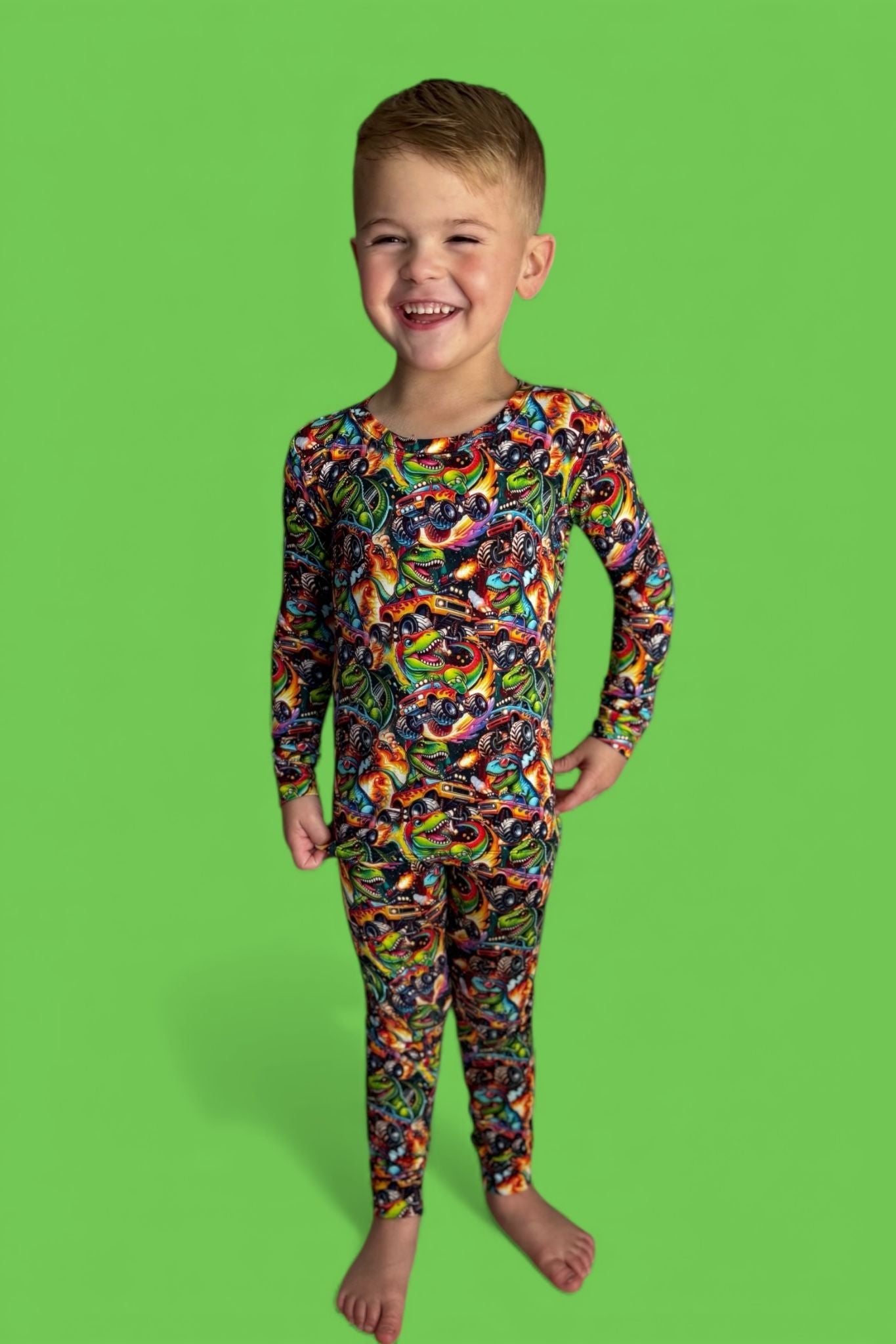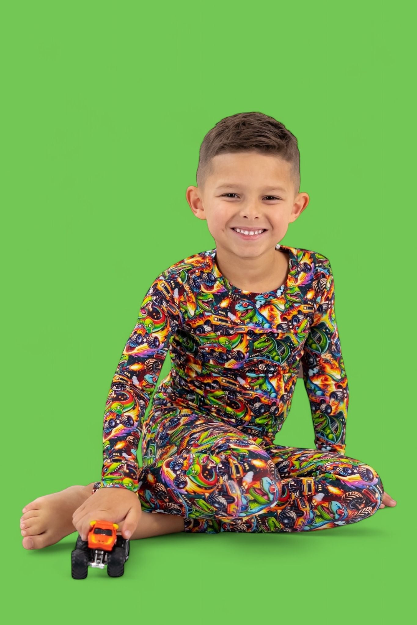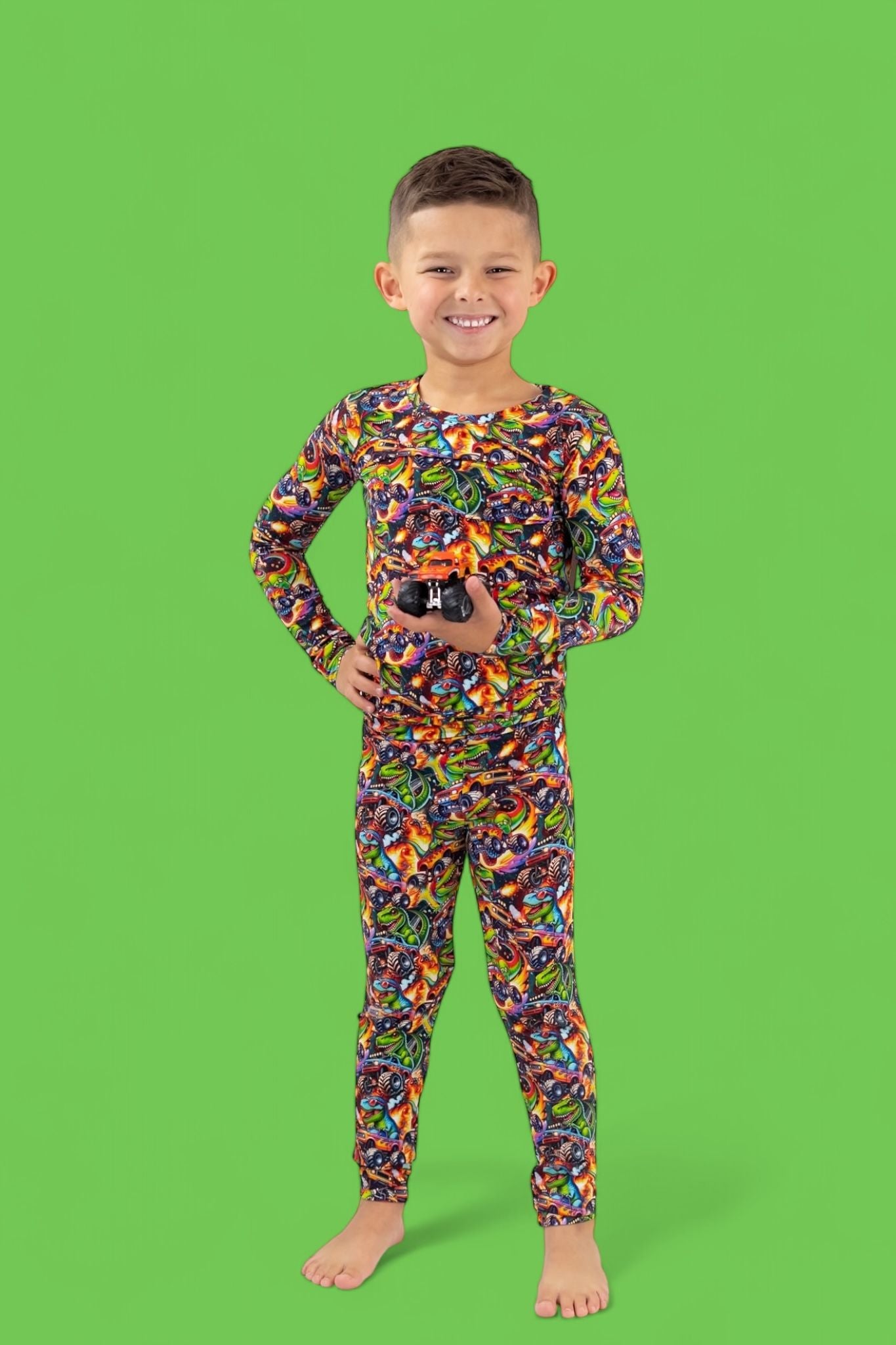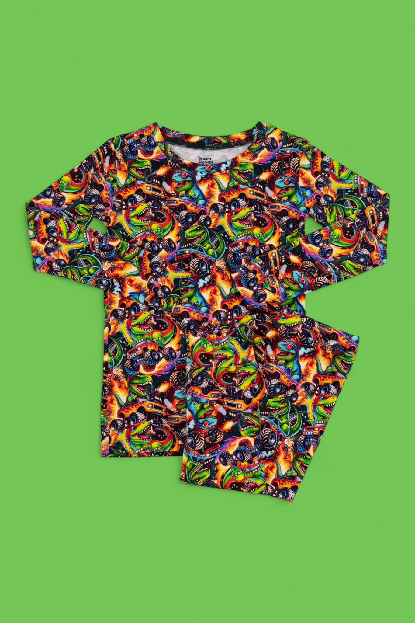 Fun, vibrant print that’s perfect for dino + car lovers