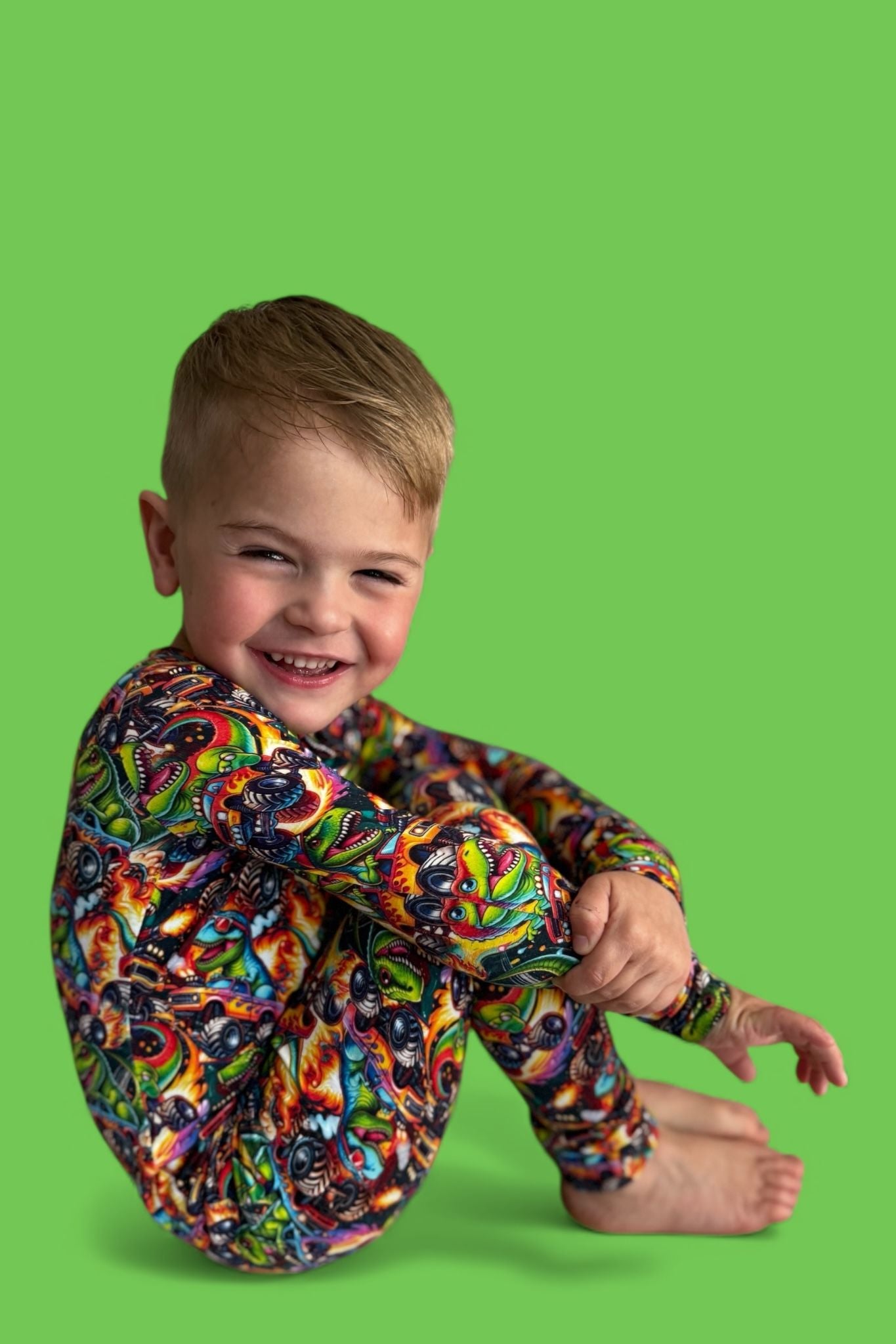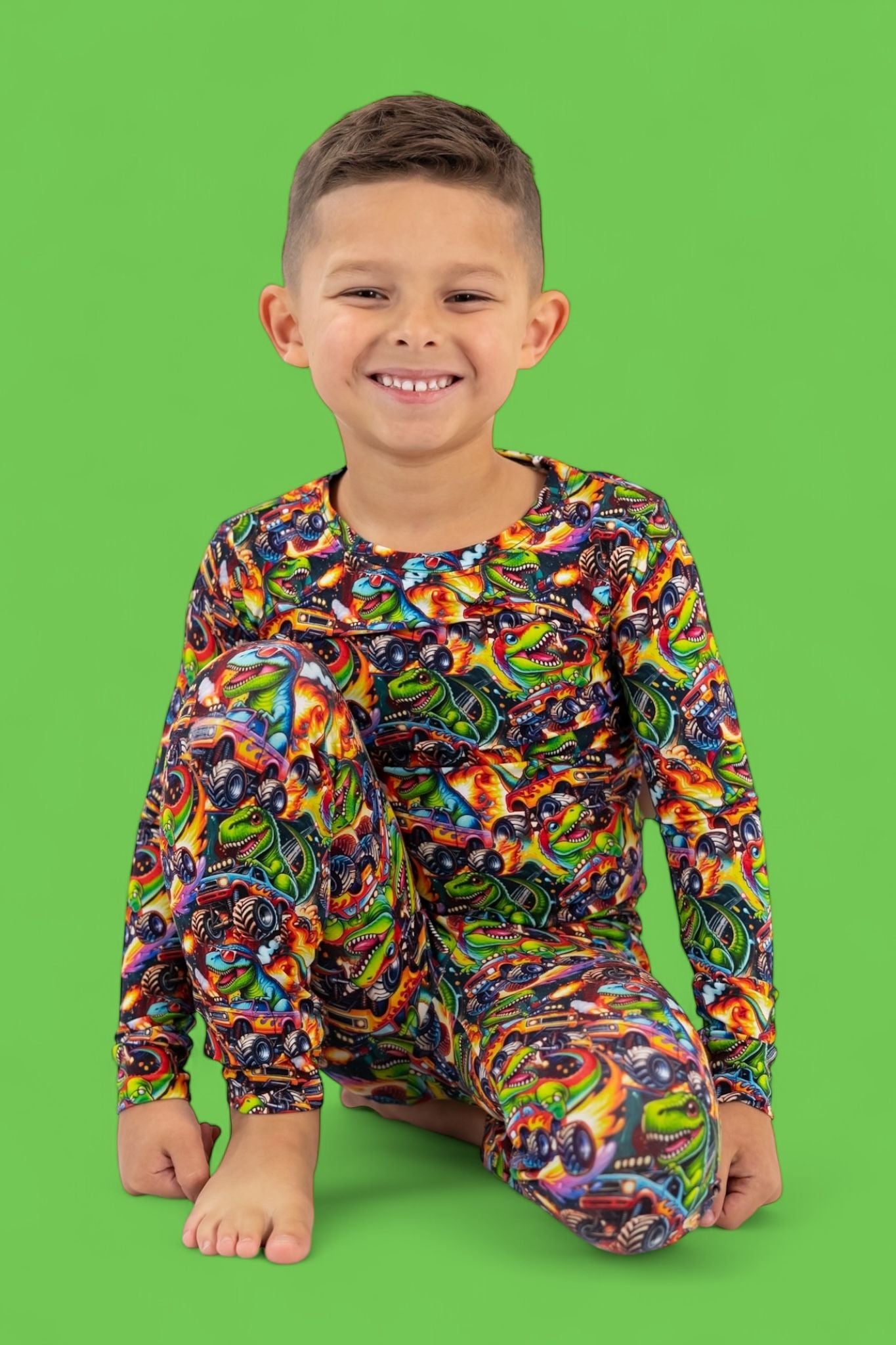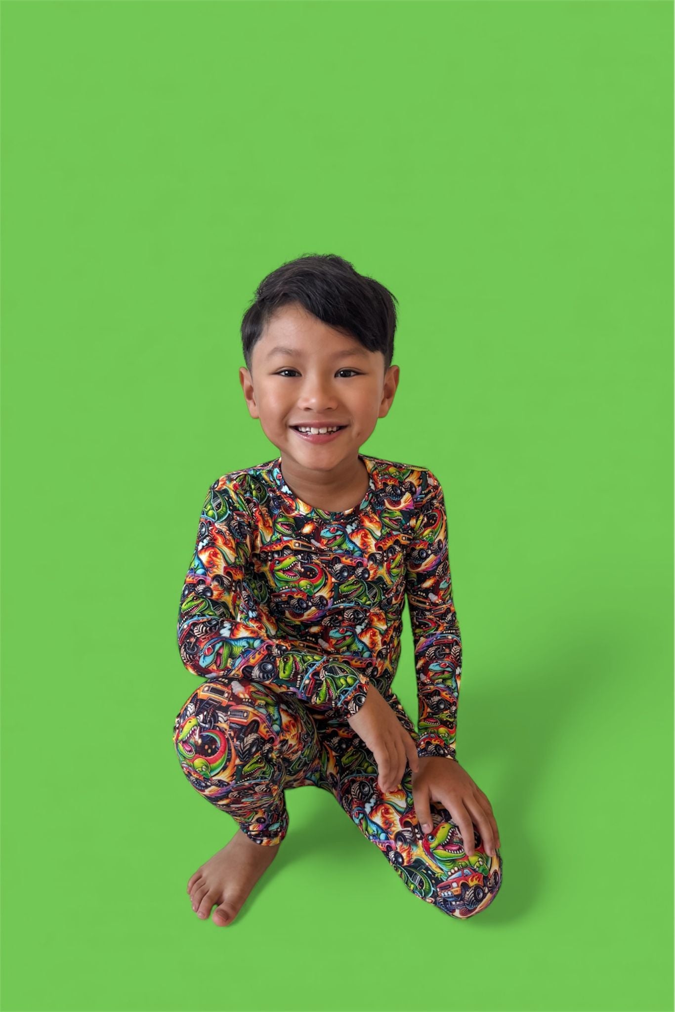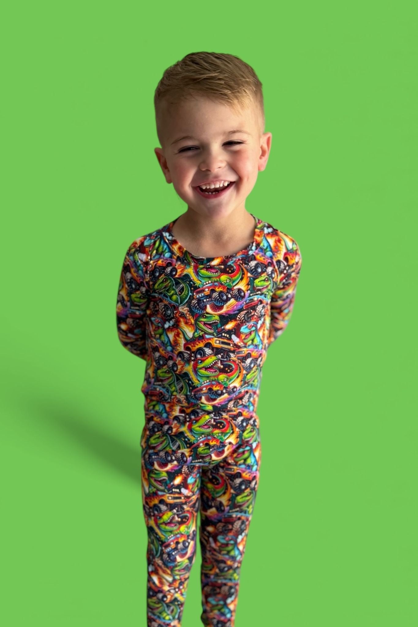 Fun, vibrant print that’s perfect for dino + car lovers