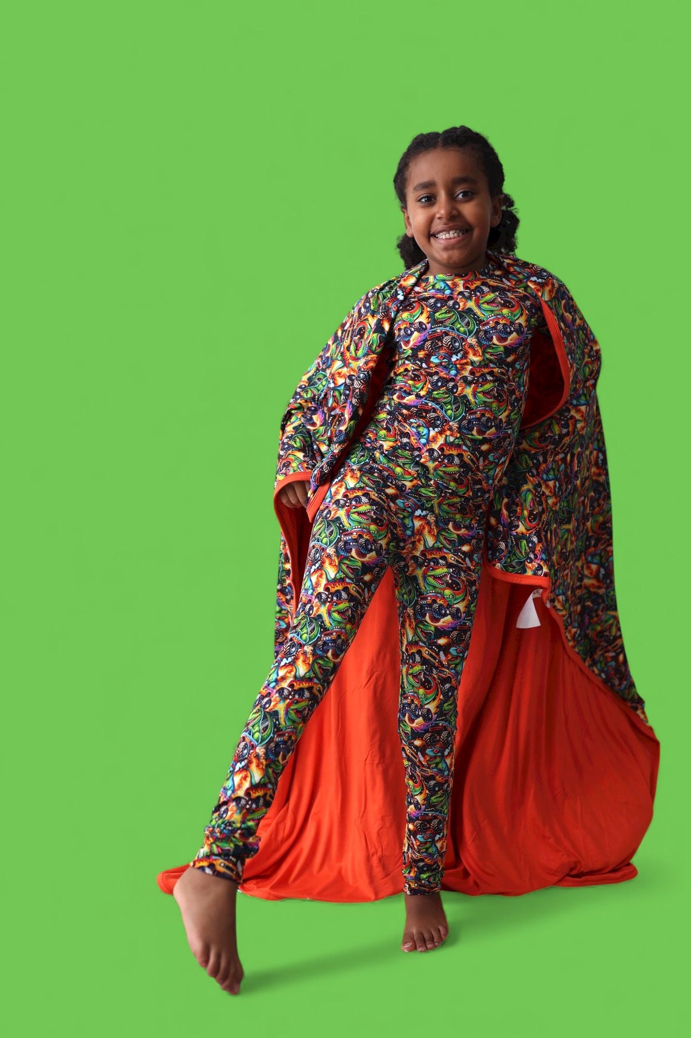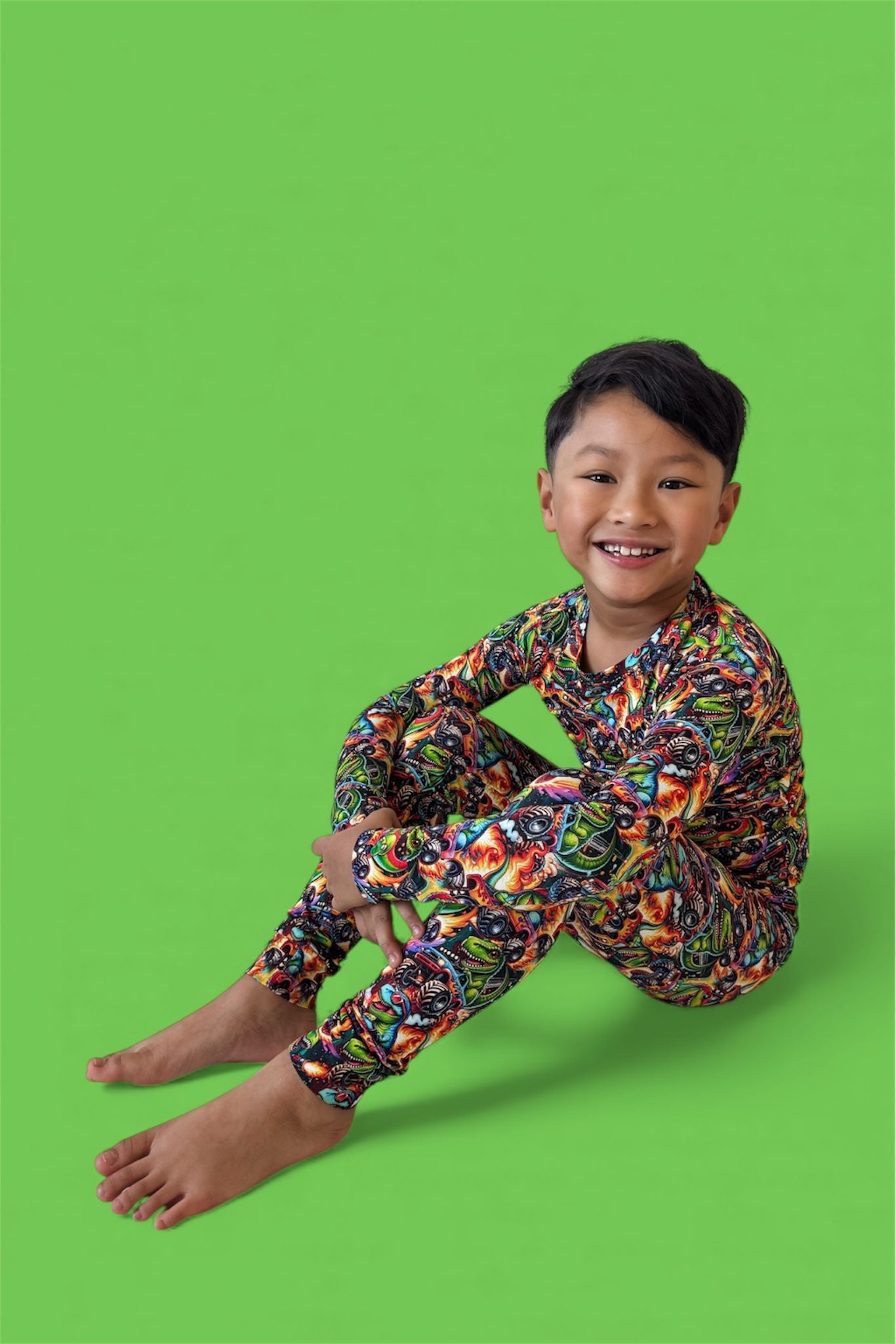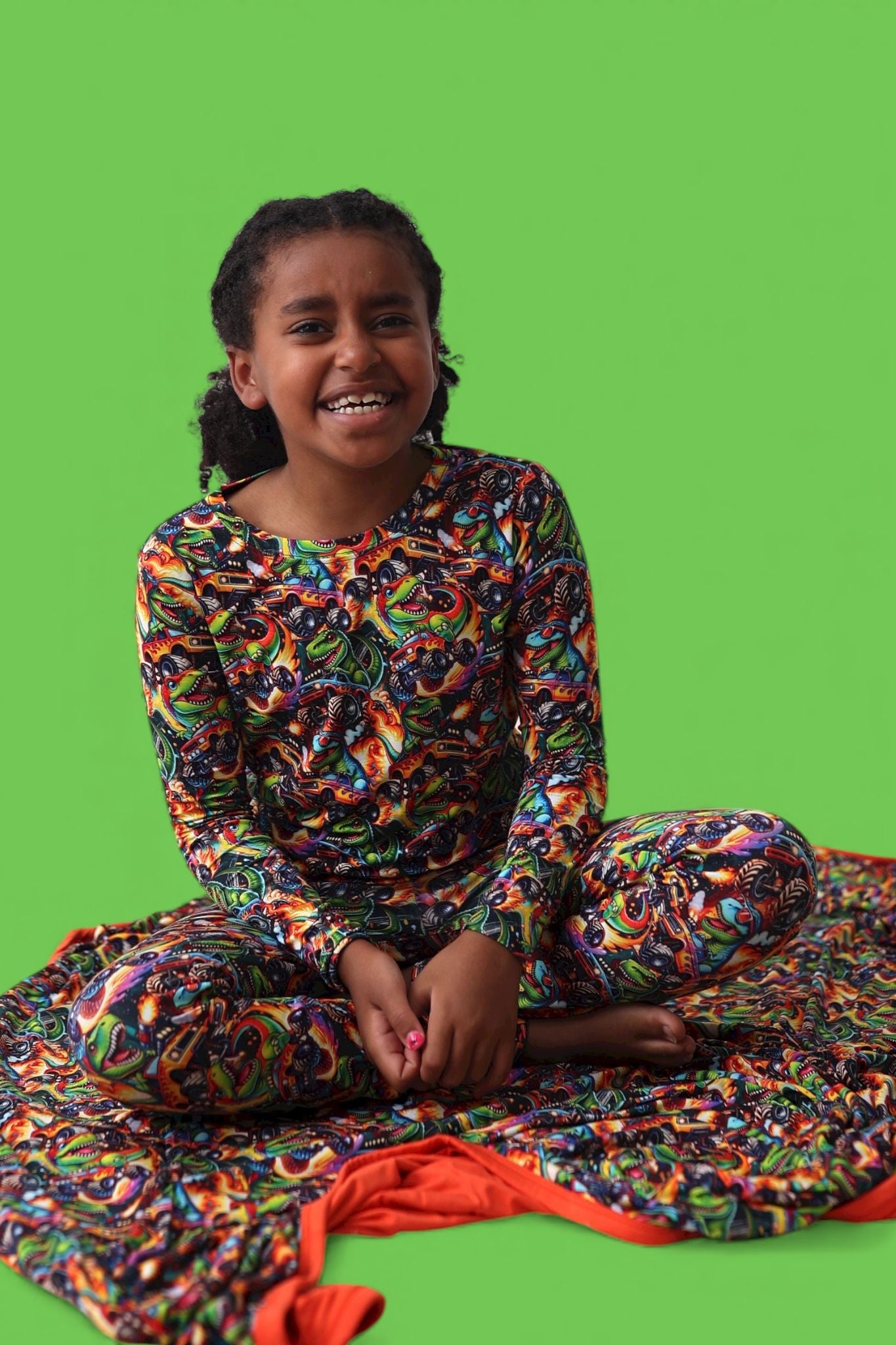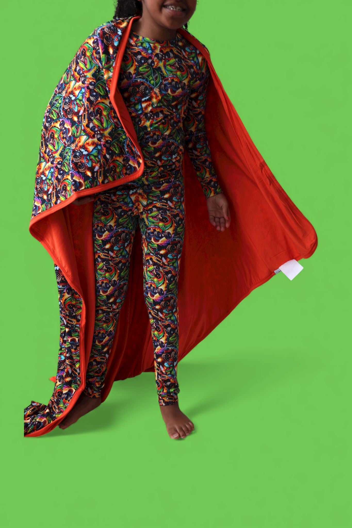 Fun, vibrant print that’s perfect for dino + car lovers