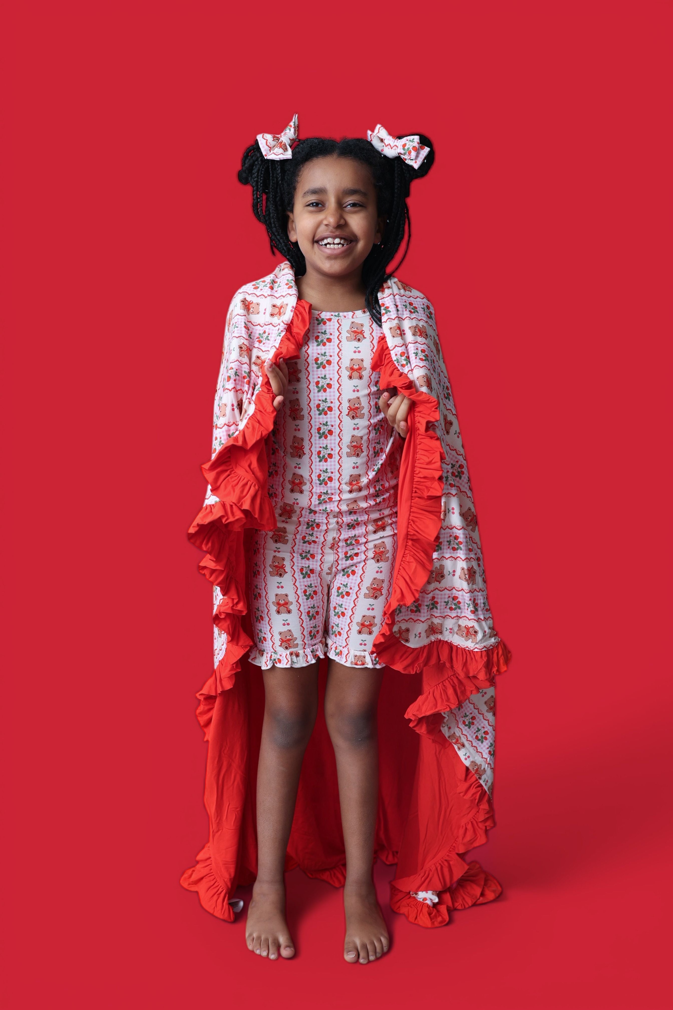 The Berry Bear Bliss Dream Ruffle Blanket wraps your little one in berry-sweet comfort. Featuring our adorable teddy bear and strawberry print with charming ruffle trim, this blanket is crafted from signature buttery-soft bamboo fabric for the coziest cuddles at home or on the go.