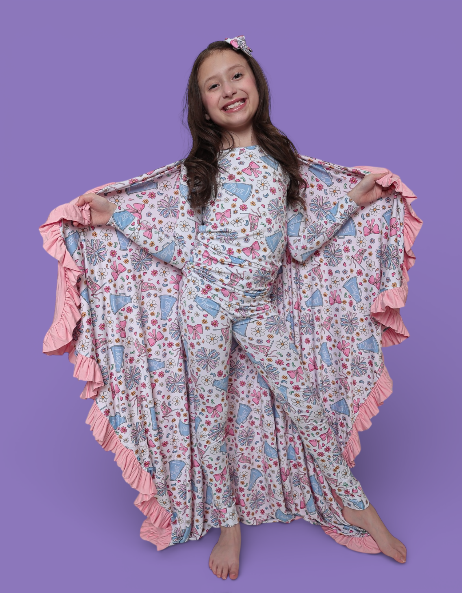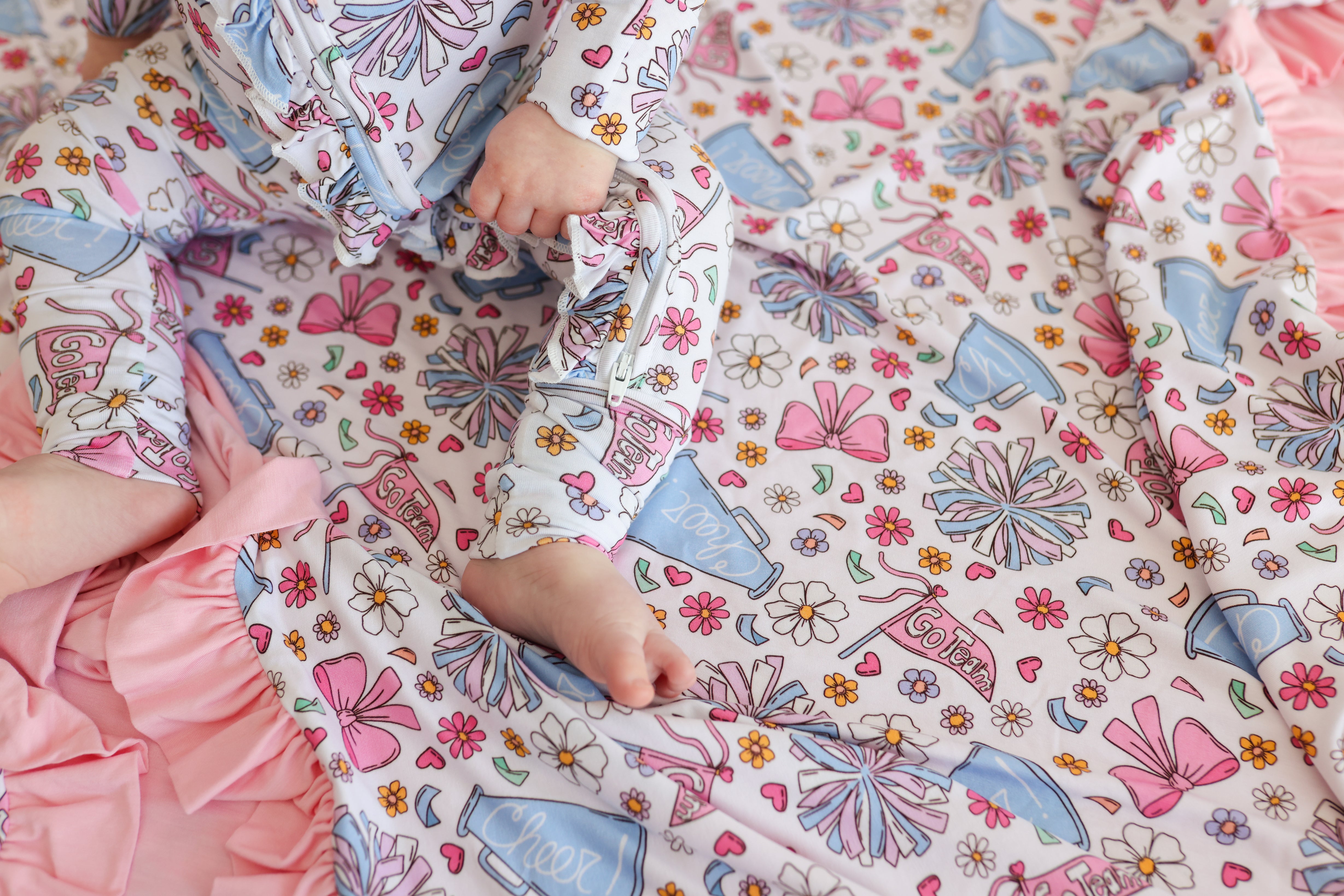 The Pom Power Dream Ruffle Blanket is made for cozy cuddles with a playful pop of fun 💖. Featuring a bright pom-pom, bow, and cheer-inspired print, this blanket is finished with darling ruffle trim for extra charm. Crafted from our signature buttery-soft bamboo fabric, it’s breathable, gentle, and perfect for everyday snuggles at home or on the go ✨.