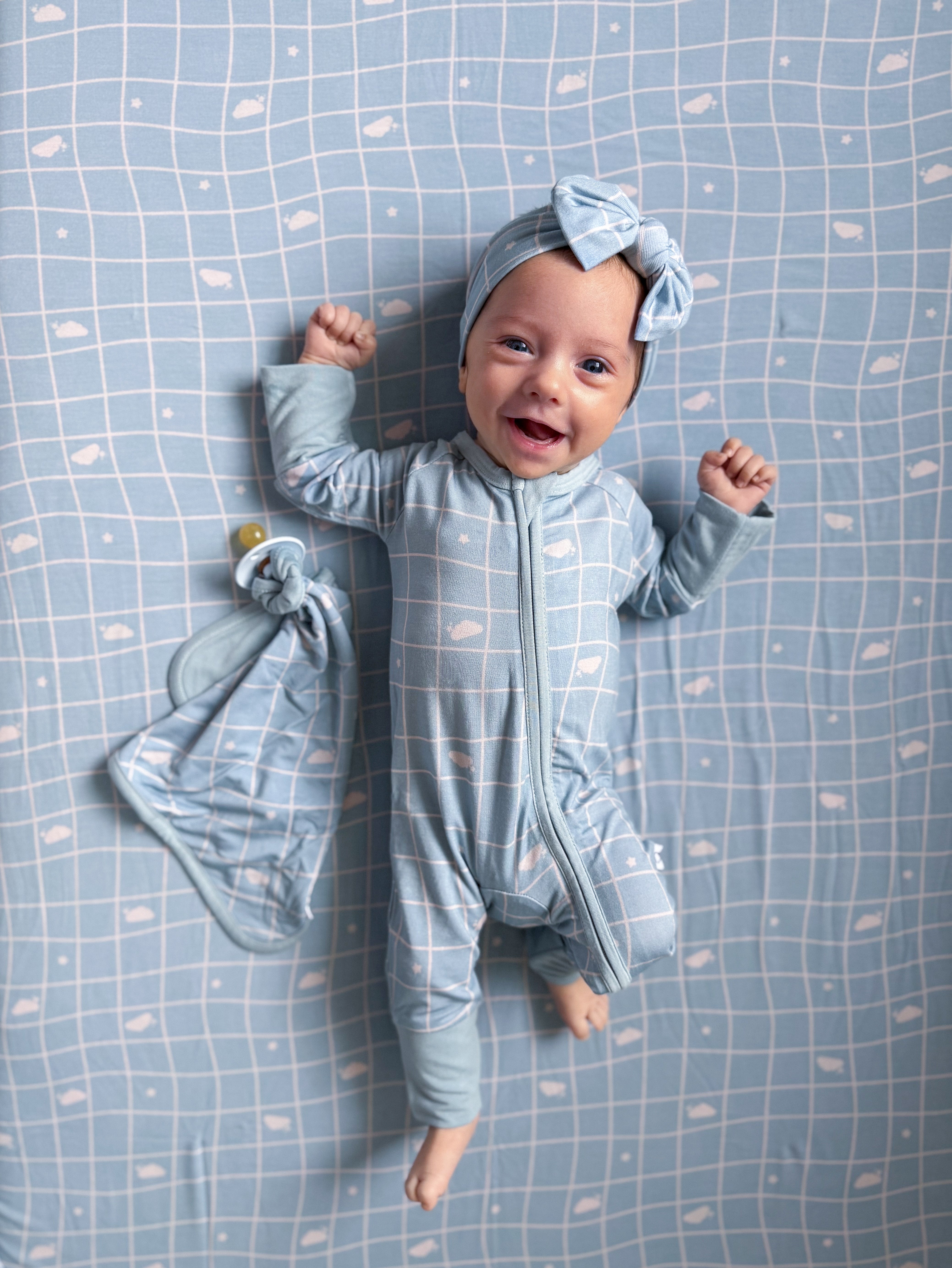 The Sweet Dreams print features a soft blue grid layered with gentle, wavy lines, scattered clouds, and twinkling stars—all inspired by the iconic Dream Big Little Co. logo. It’s a soothing, sky-inspired design that brings whimsical charm to your babe’s wardrobe.