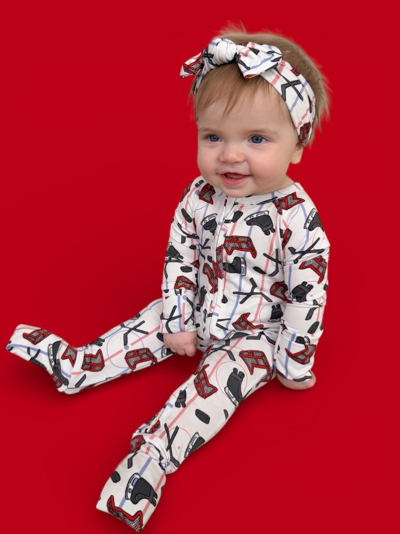 The perfect finishing touch for your little rink star! This adorable bow features our hockey-inspired print—skates, sticks, pucks & nets—on our super soft, stretchy fabric. Cute, comfy, and game-day ready! 🎀🥅
