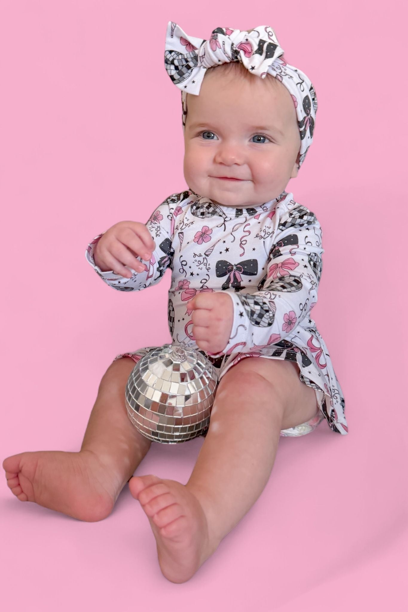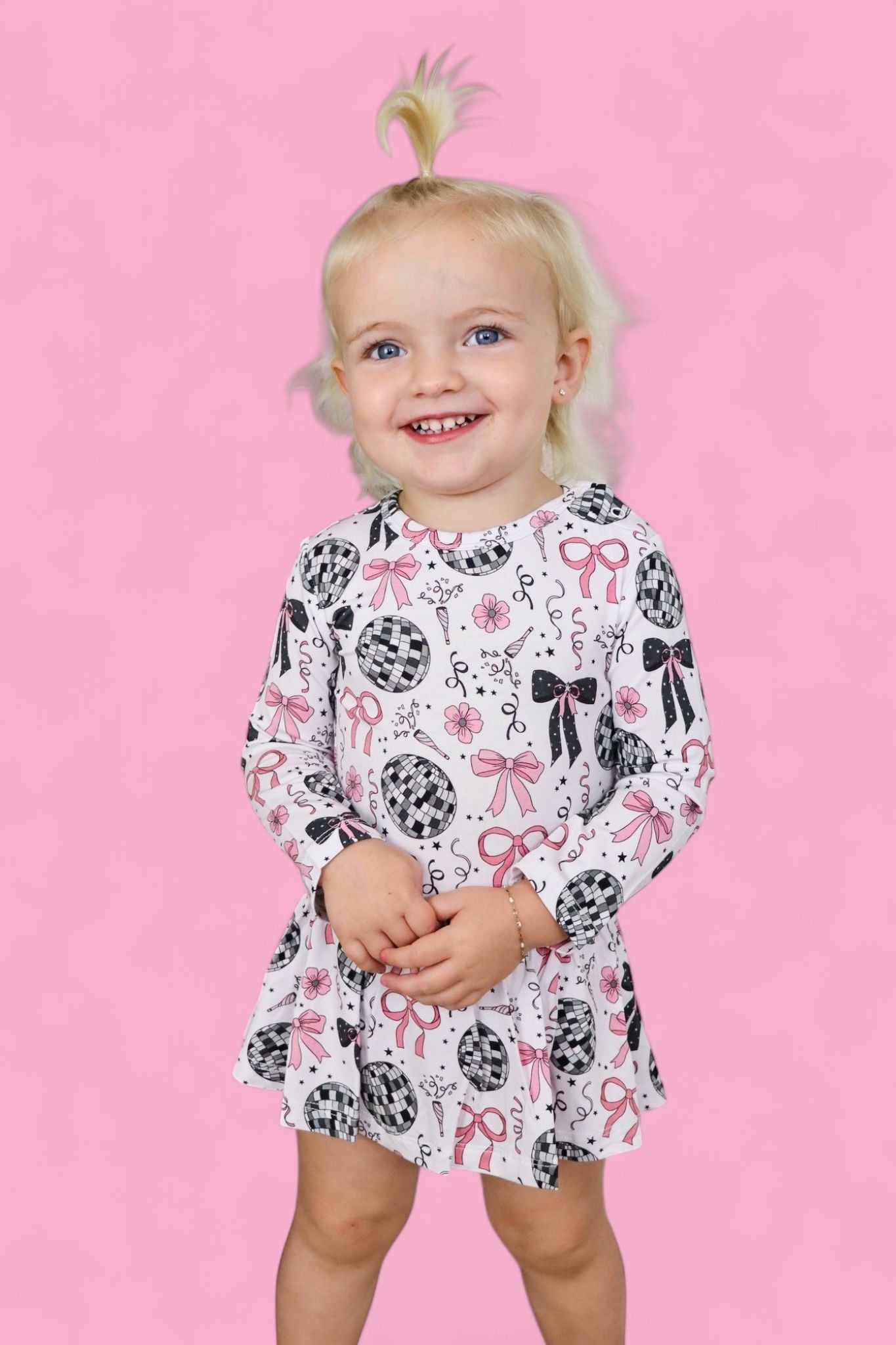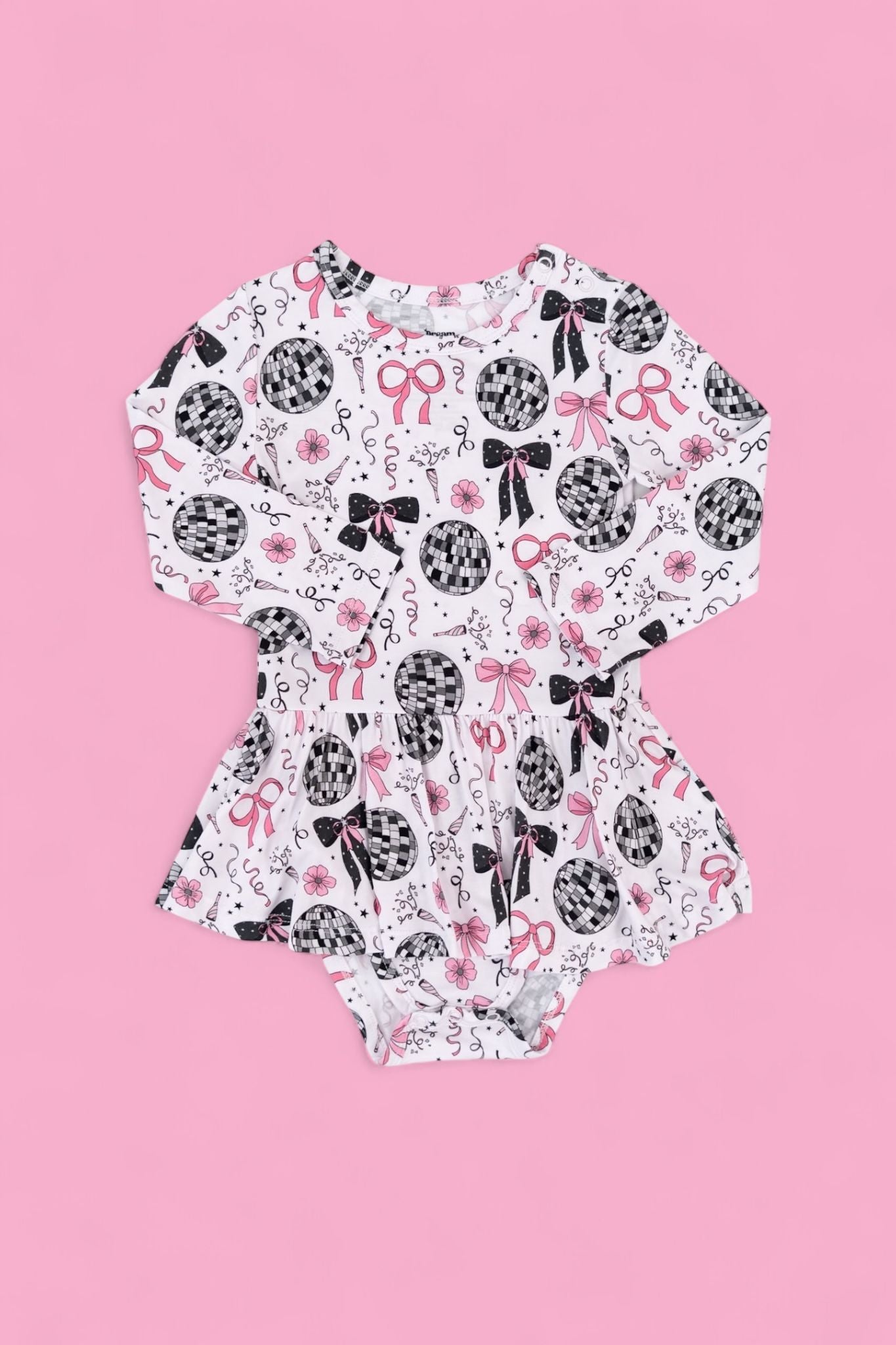 Glitz meets giggles in our Midnight Disco Darling Dream Bodysuit Dress! Featuring a festive print of dazzling disco balls, pink bows, and starry-night sparkle, this dress combines all the glam of a party outfit with the practicality of a built-in bodysuit. Perfect for little ones who love to twirl and stay comfy!
