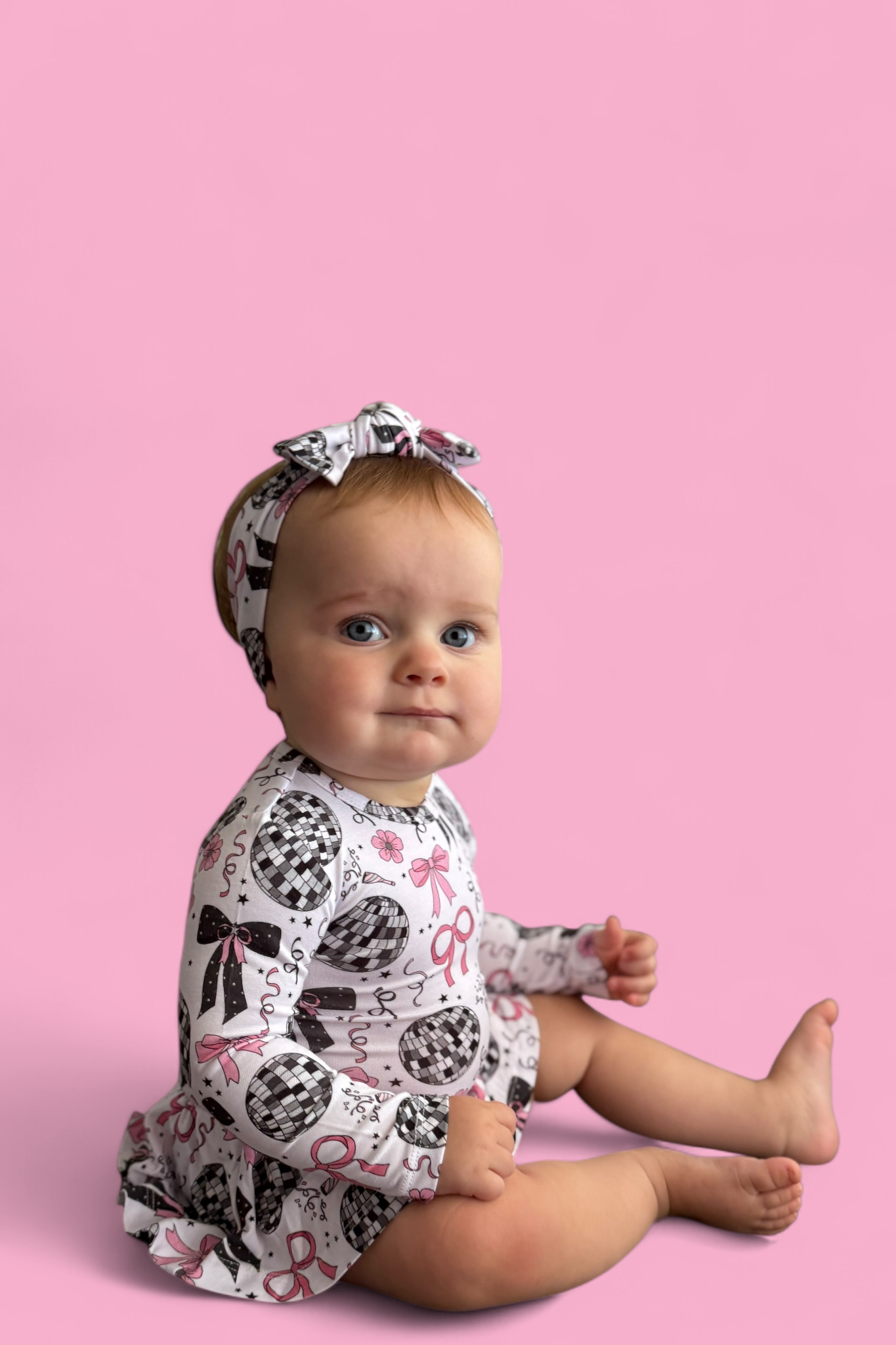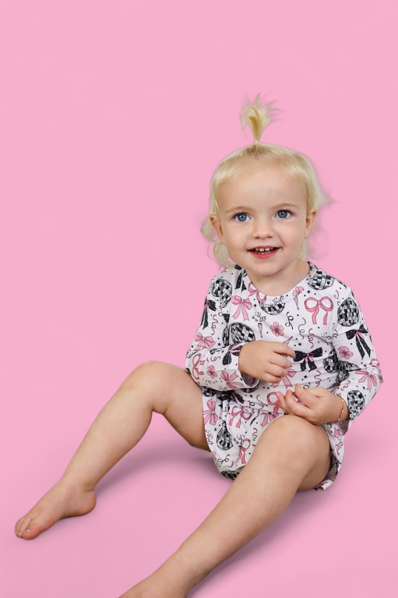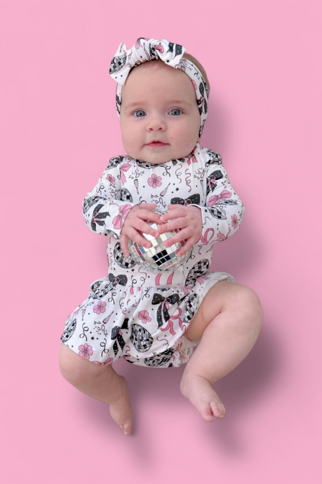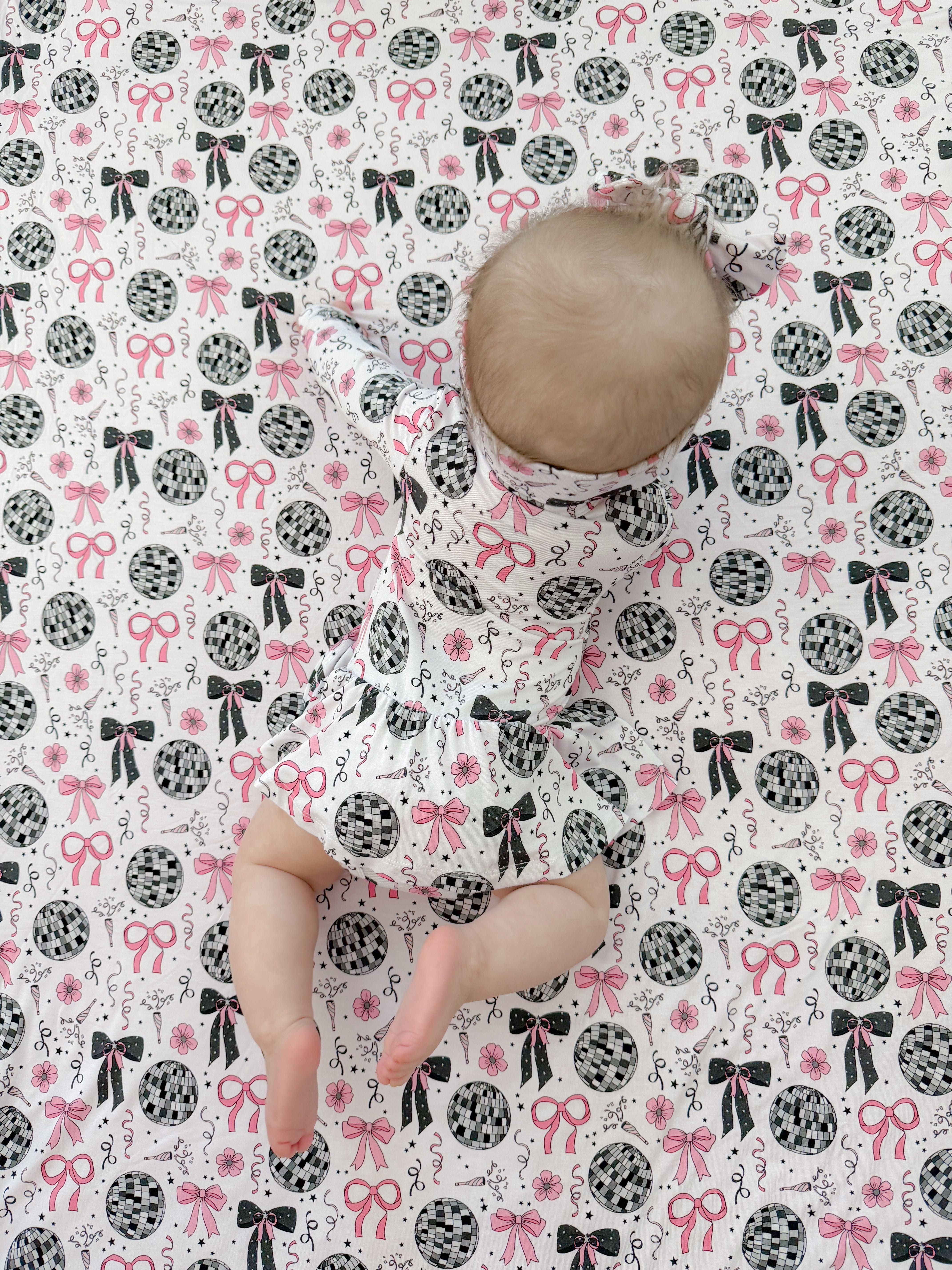 Glitz meets giggles in our Midnight Disco Darling Dream Bodysuit Dress! Featuring a festive print of dazzling disco balls, pink bows, and starry-night sparkle, this dress combines all the glam of a party outfit with the practicality of a built-in bodysuit. Perfect for little ones who love to twirl and stay comfy!