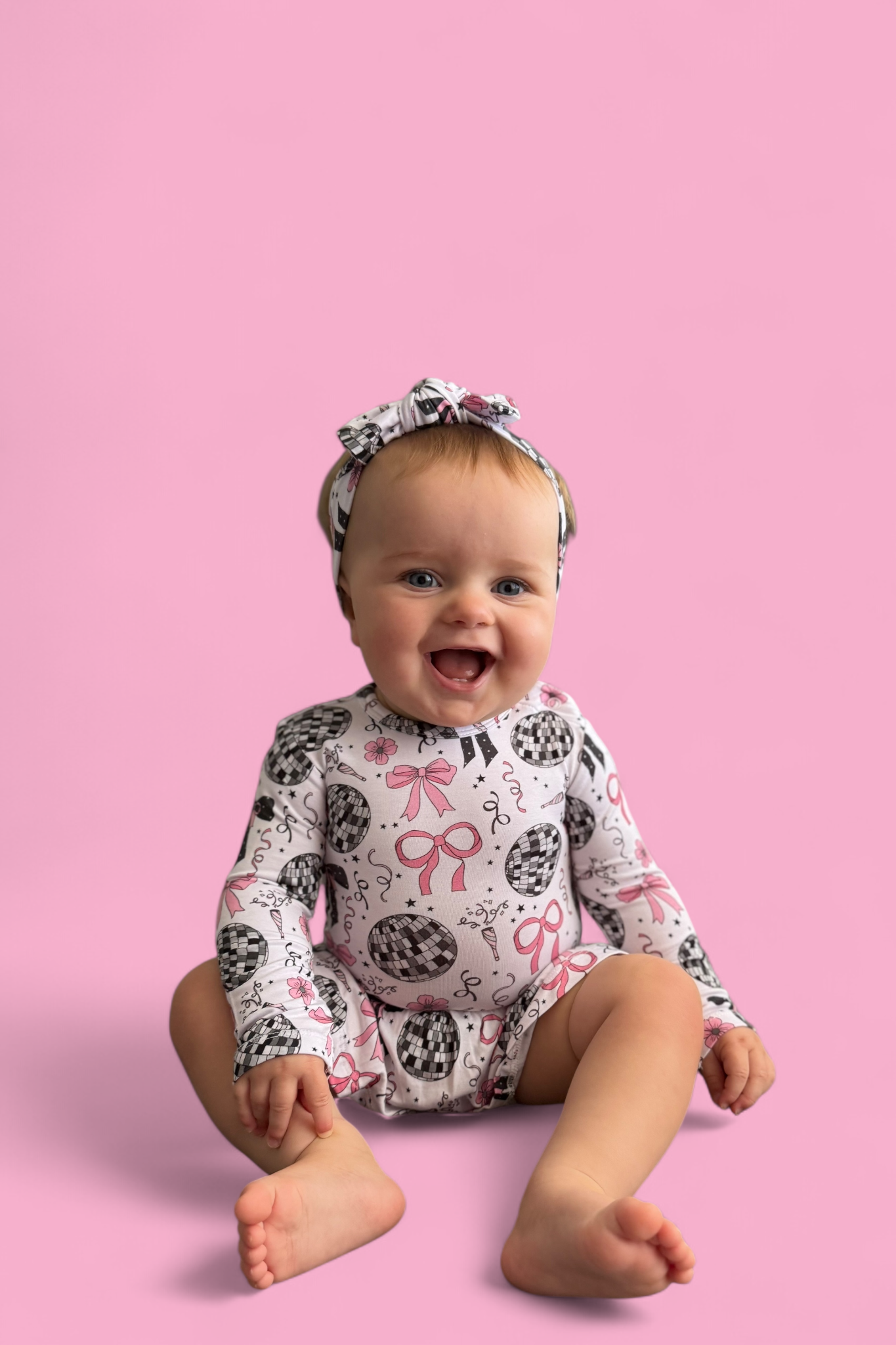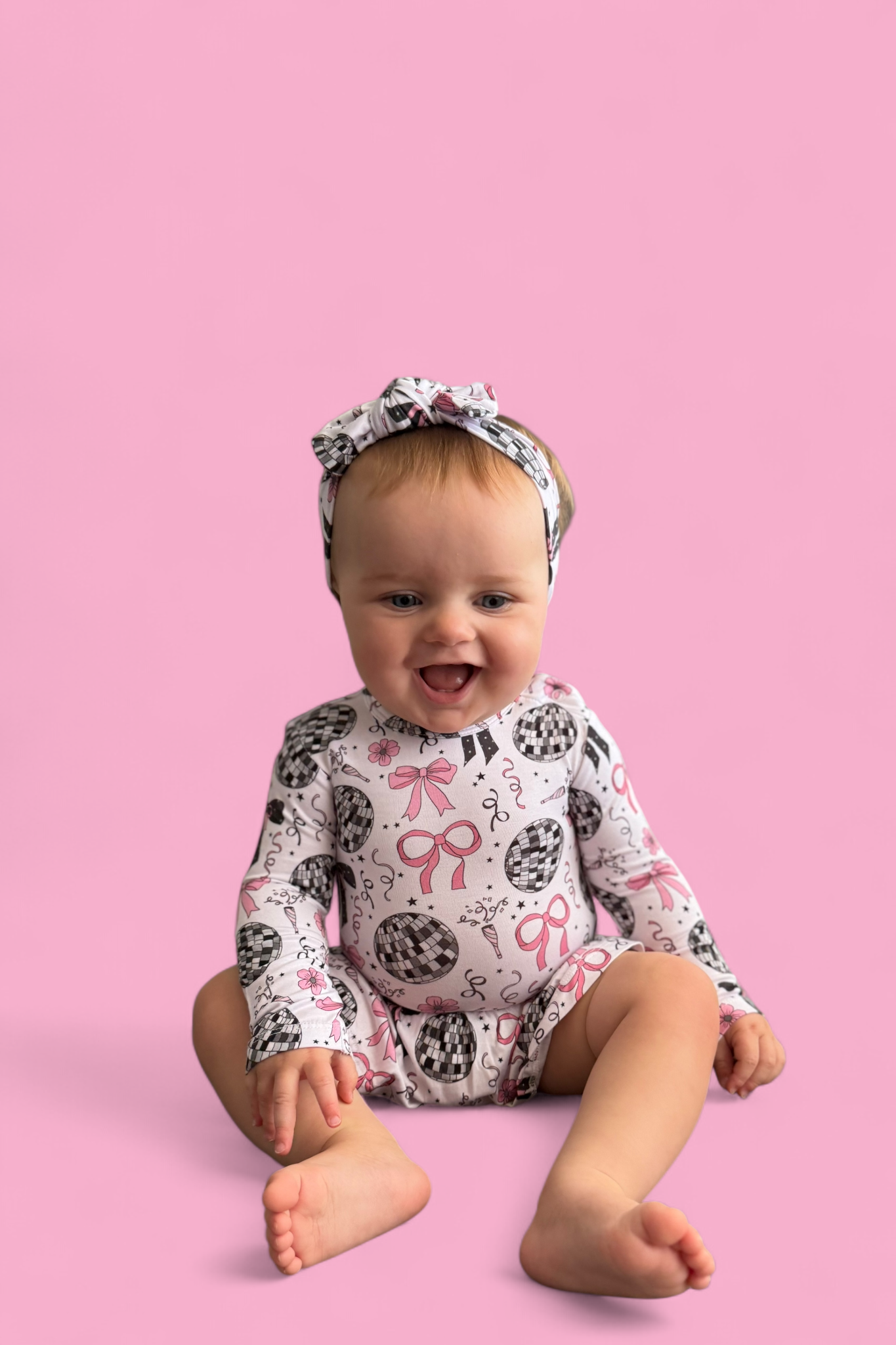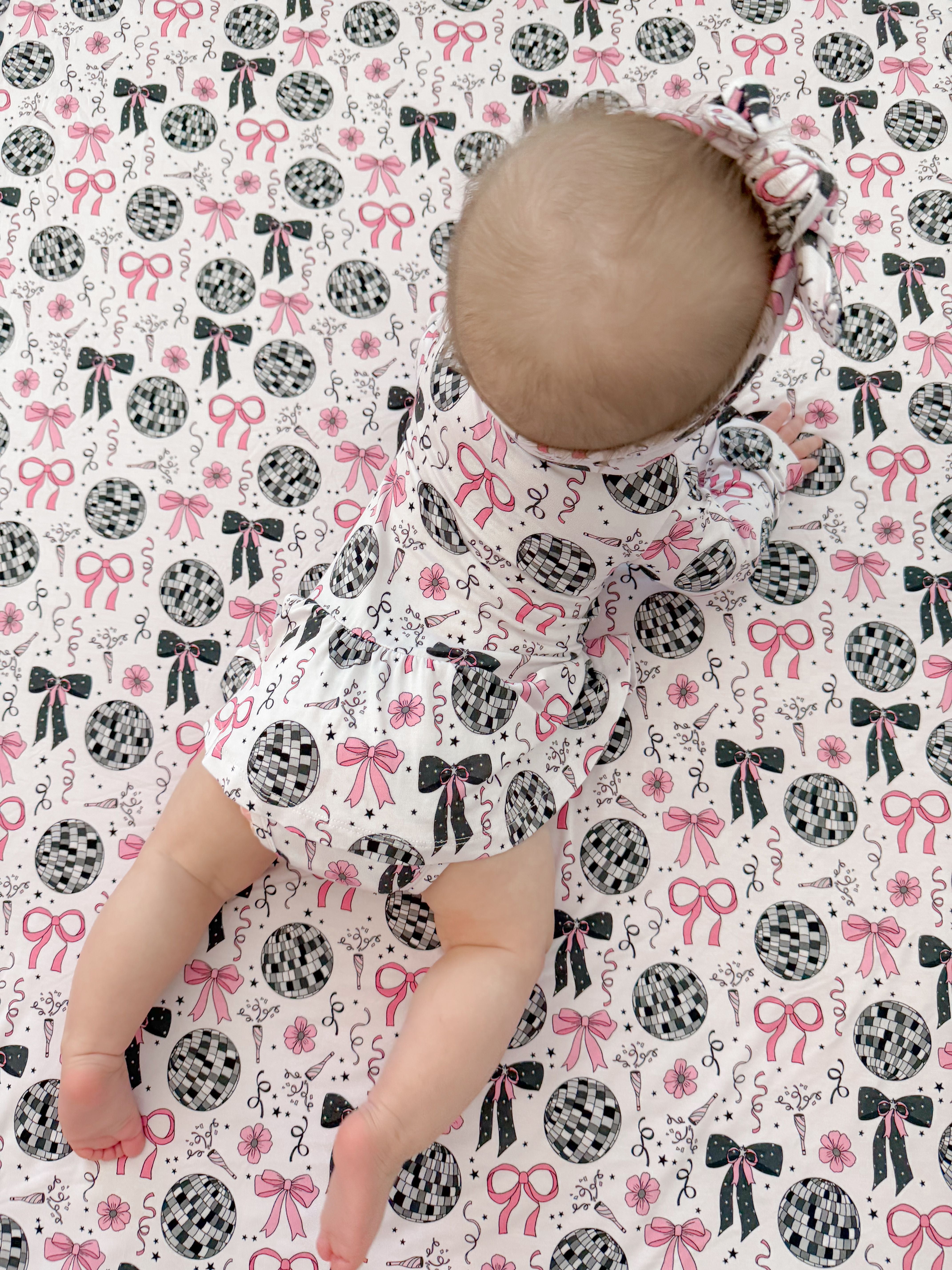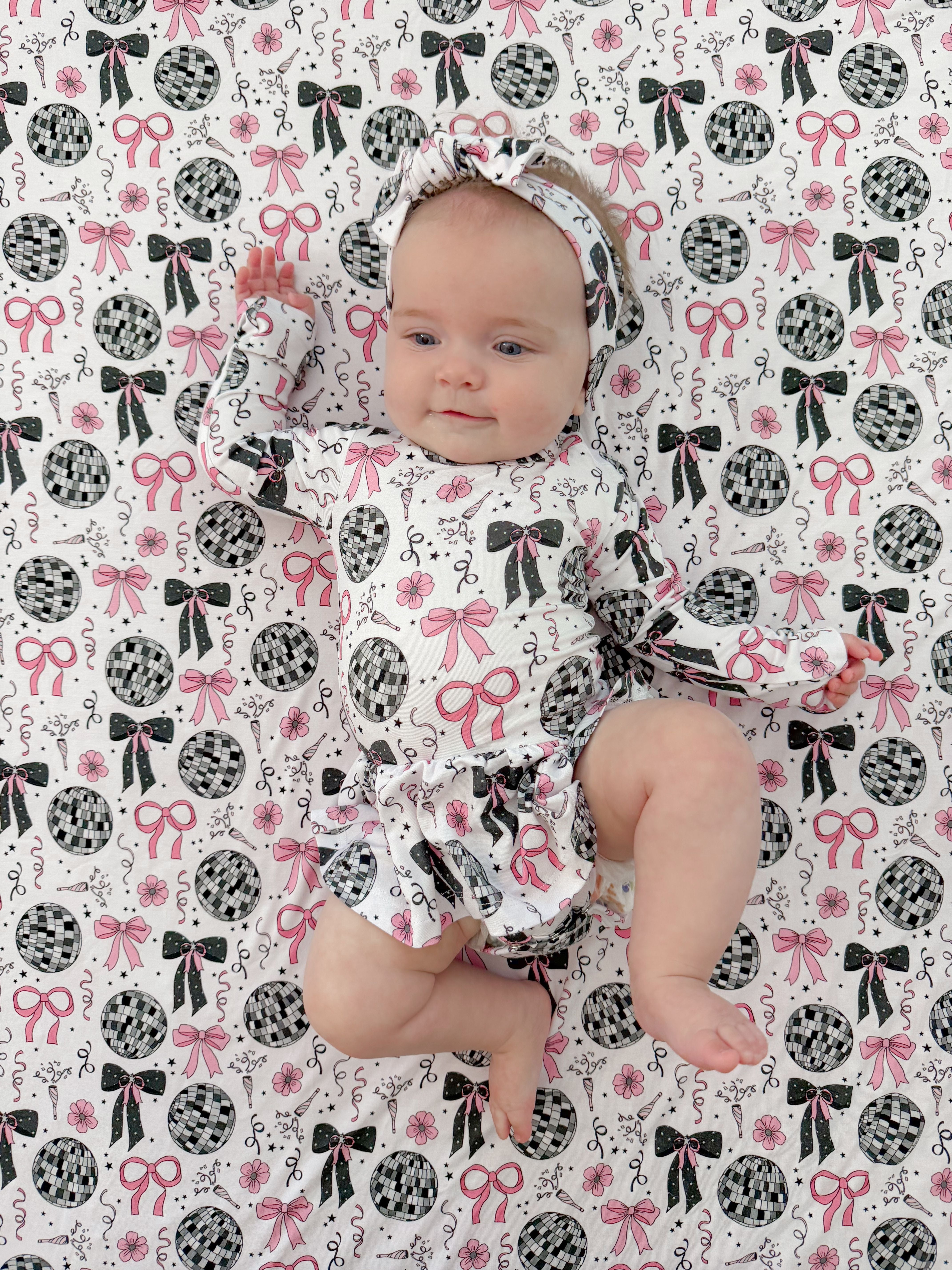 🪩 Party-ready disco print with bows, stars & confetti