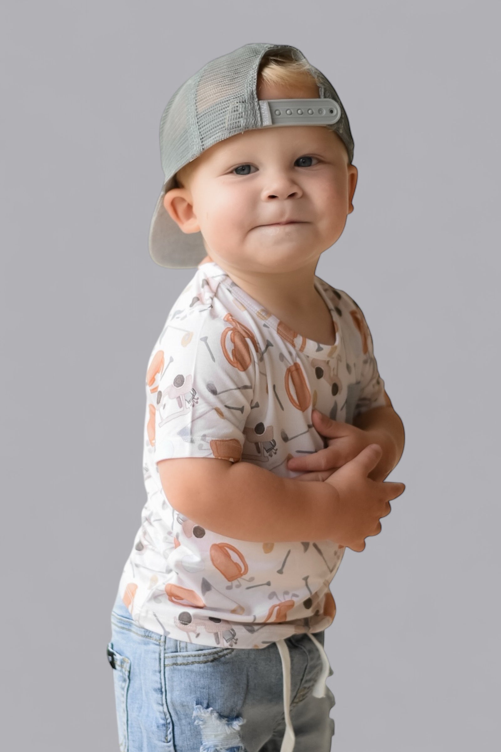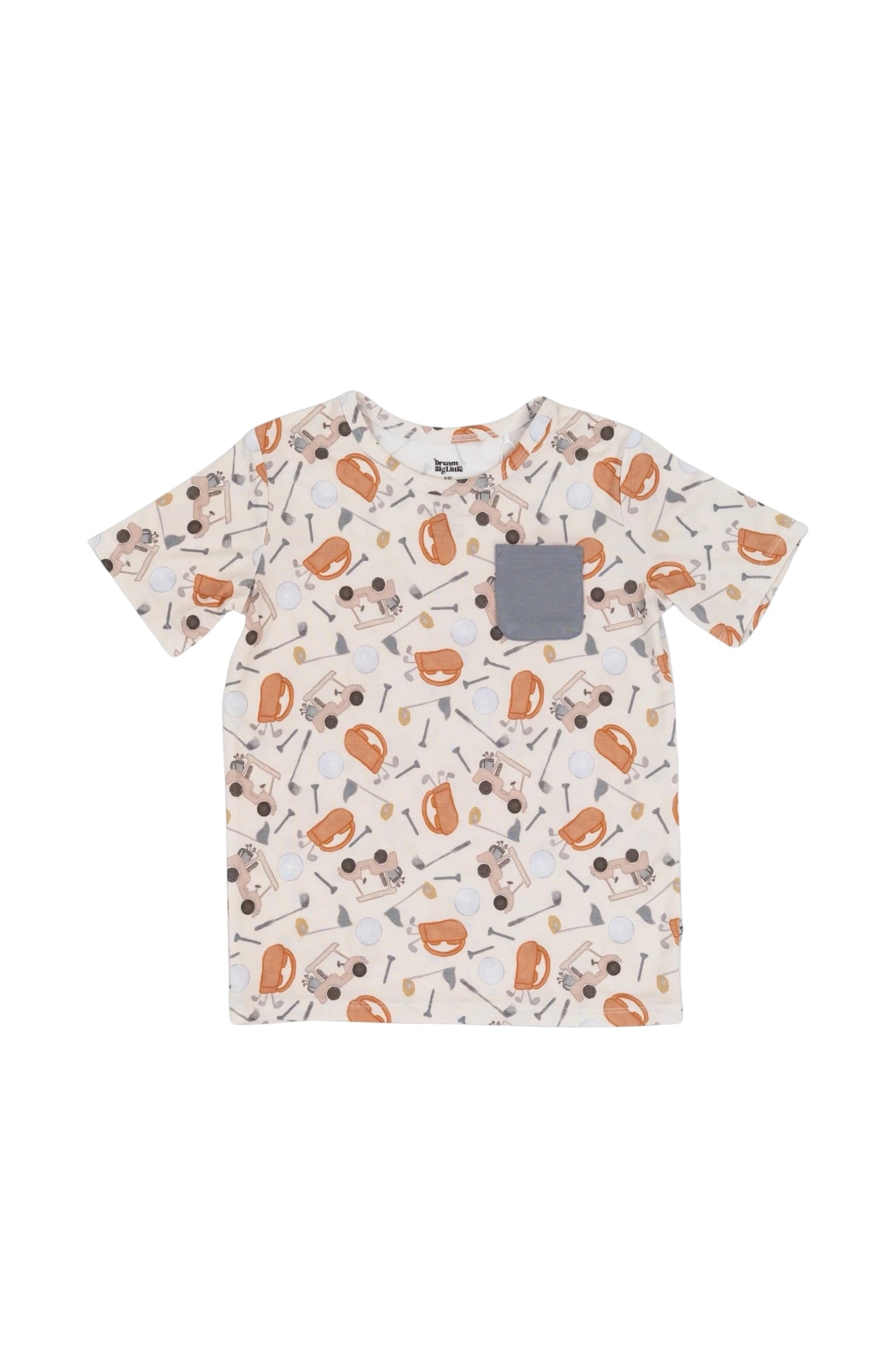 This pocket tee features our charming golf-themed Bedtime Birdie print, with soft illustrations of golf carts, clubs, balls, and caps in warm, neutral tones. Whether your mini golfer is teeing off in the playroom or heading to dreamland, this tee brings laid-back country club vibes to everyday wear.
