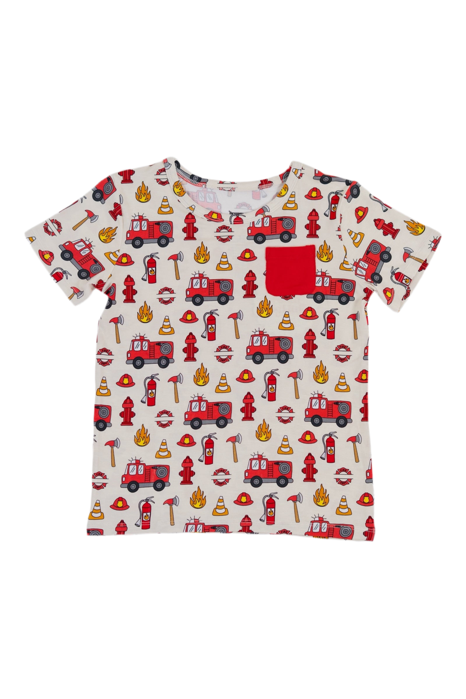 Every little hero needs the right gear! The Firehouse Heroes Dream Pocket Tee is the perfect addition to your junior firefighter’s wardrobe. Featuring an action-packed print of fire trucks, helmets, axes, hydrants, and more, this tee is a bold tribute to the brave men and women of the fire service. The fiery red, orange, and yellow hues bring the heat, making this shirt a must-have for little ones who dream of rushing to the rescue!
