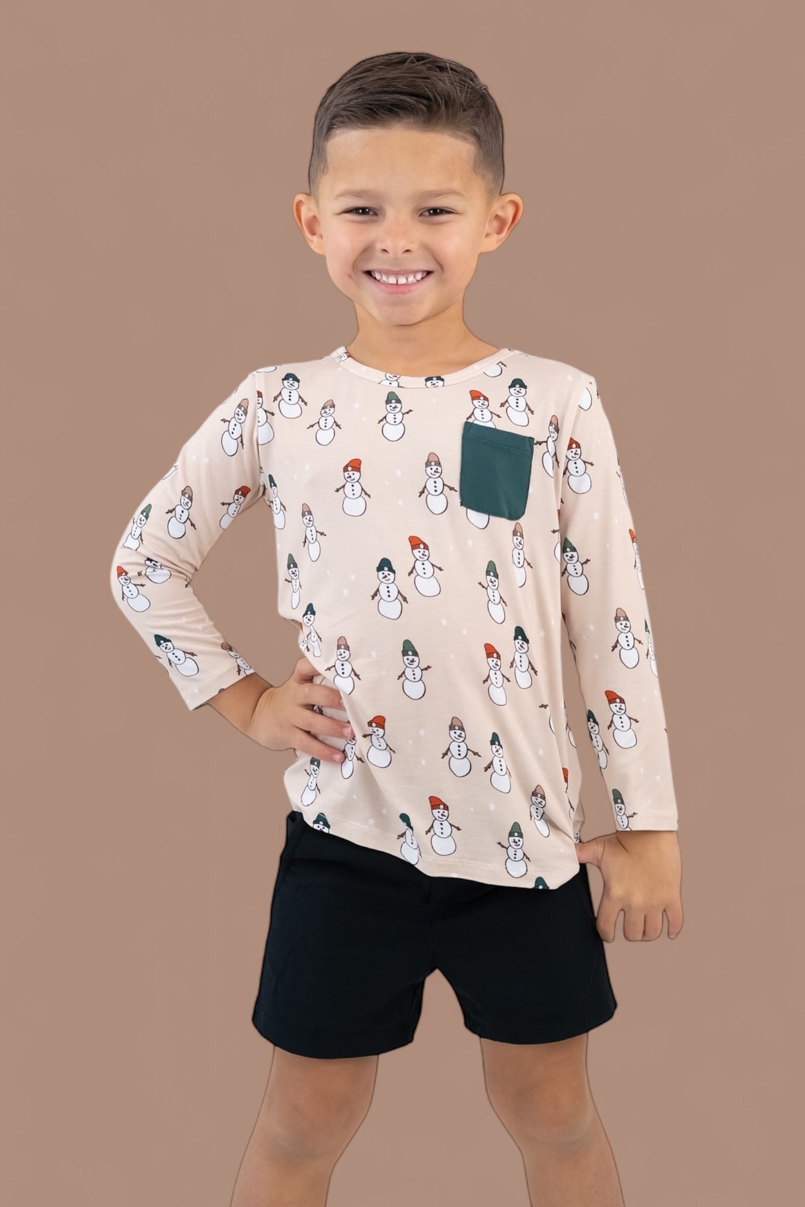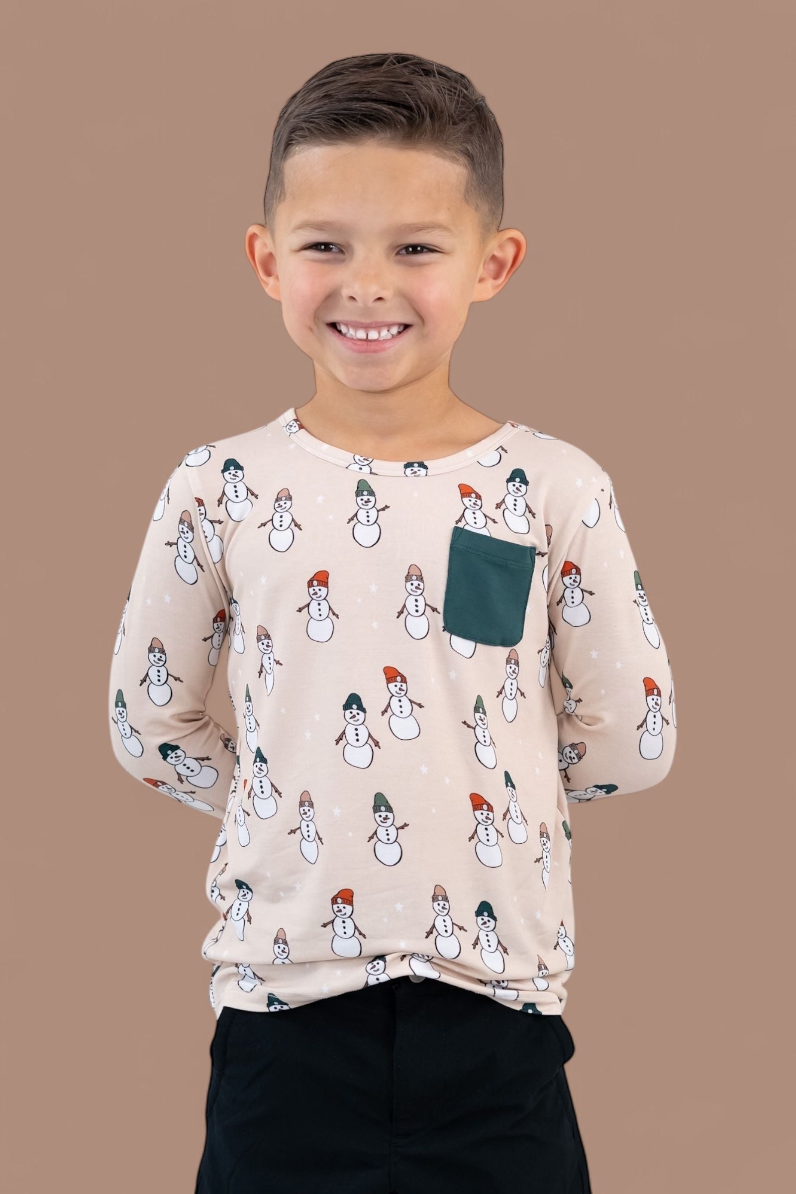Cool, cozy, and winter-ready—the Frosted Friends Dream Pocket Tee is the perfect top for your little snow explorer! Featuring a playful snowman print on a soft beige background and a classic chest pocket for added charm, this tee brings festive fun and everyday comfort together in one adorable package.