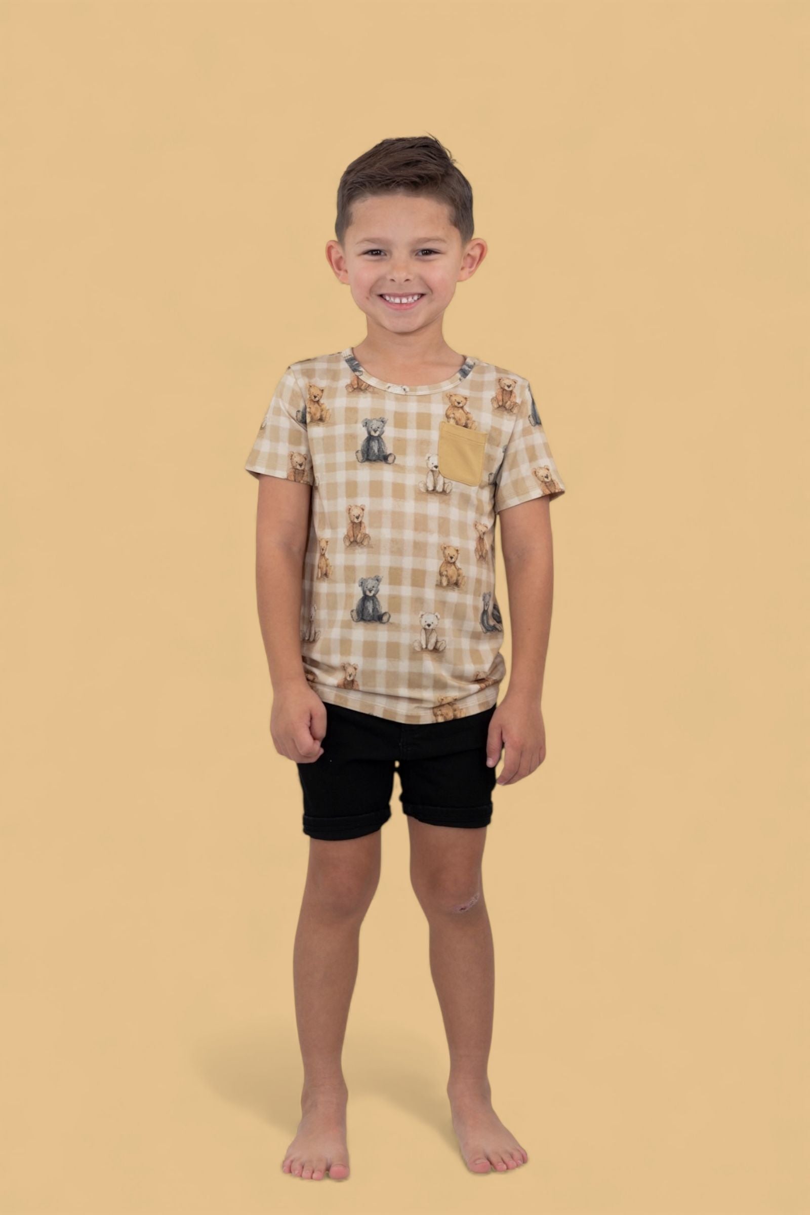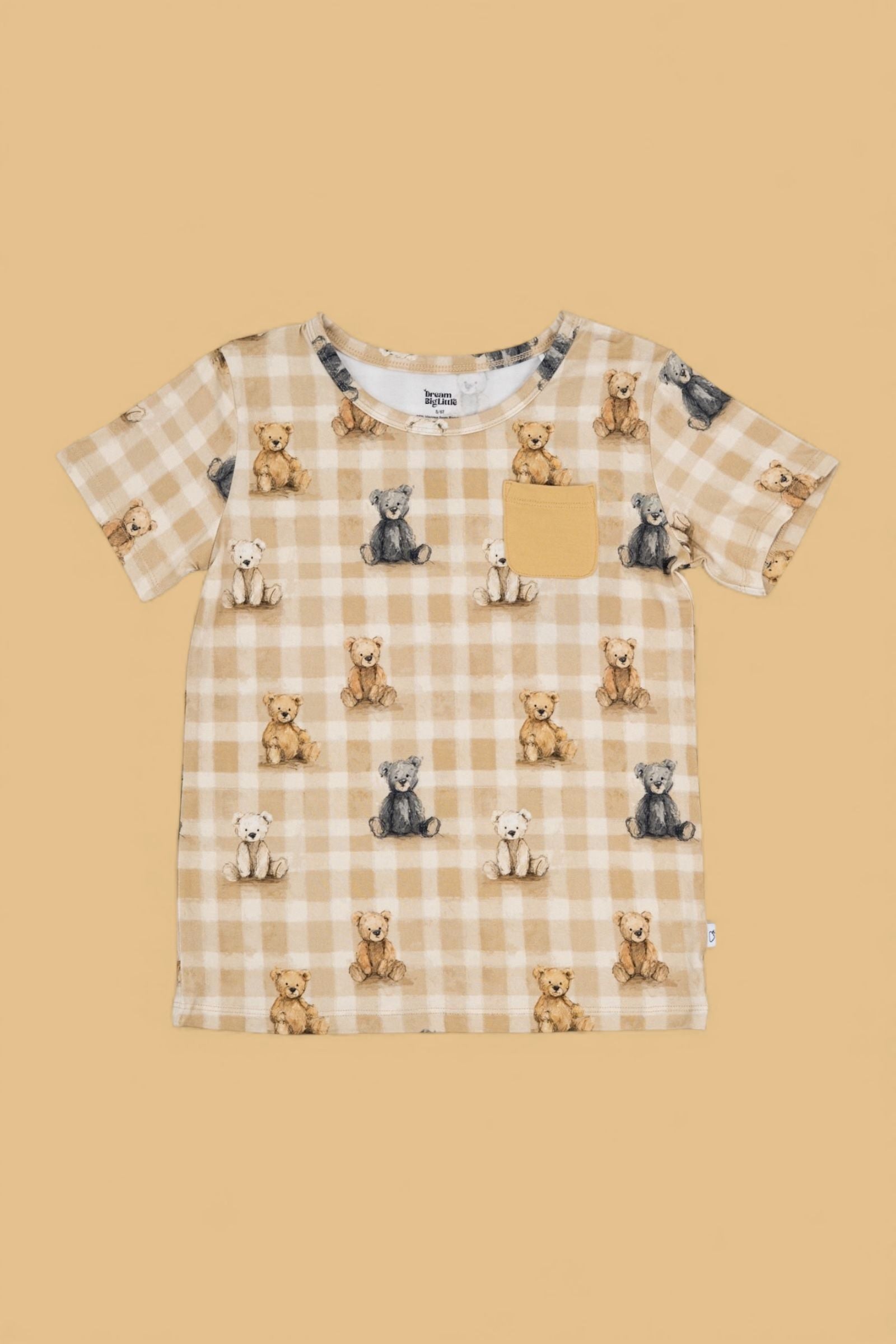 Everyday classic with a cozy twist! The Teddy Check Dream Pocket Tee is made from our buttery-soft bamboo fabric and features a timeless gingham background sprinkled with cuddly teddy bears. Finished with a functional chest pocket, it’s the perfect mix of style and comfort for play, lounge, or layering.