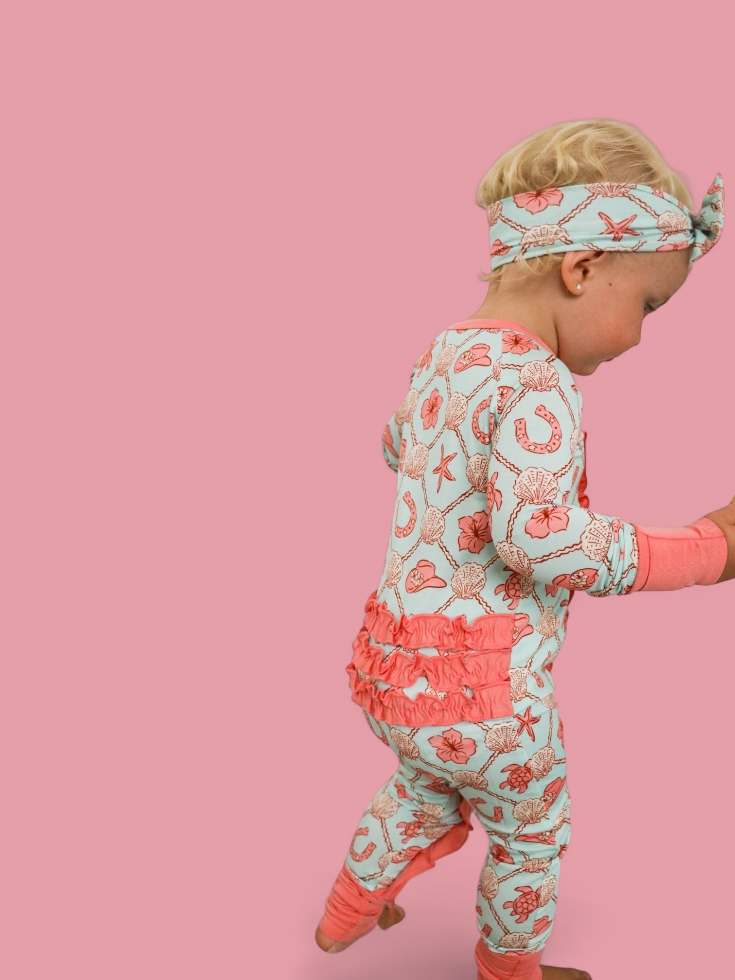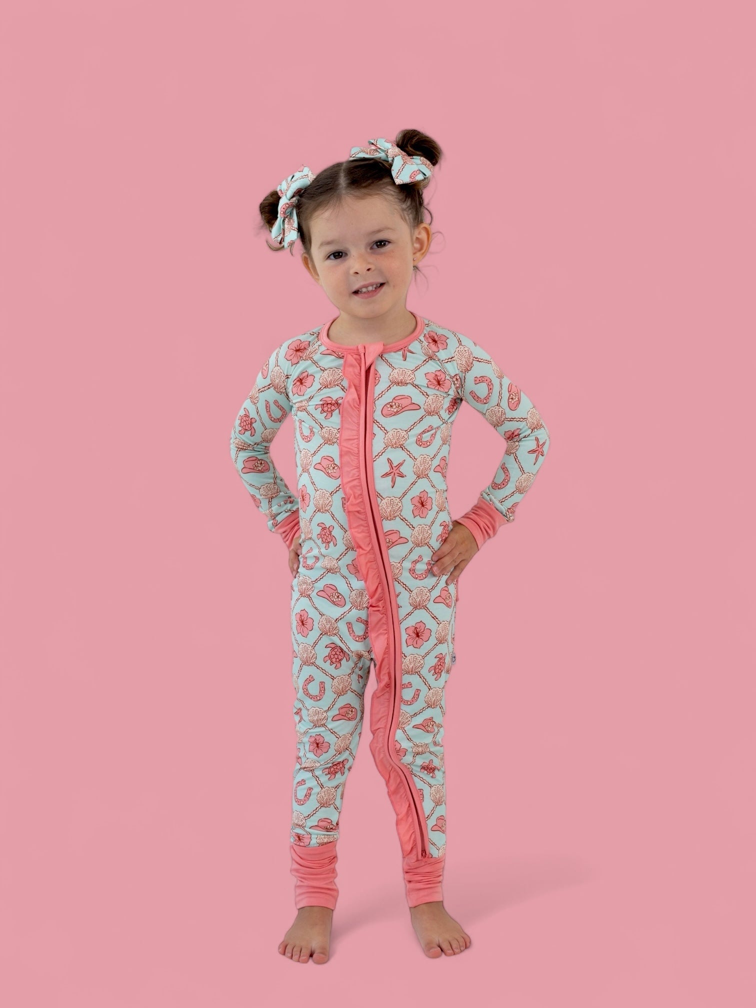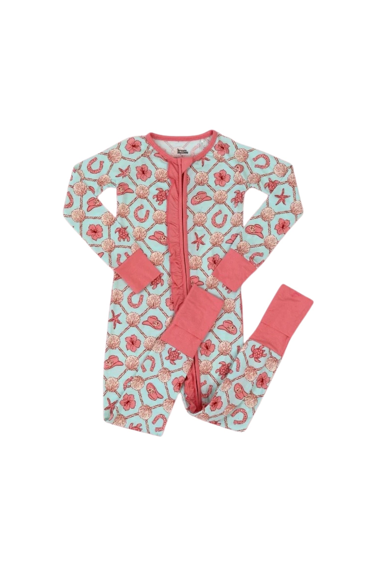 The Coastal Cowgirl Dream Ruffle Romper brings together seaside sparkle and country flair in the sweetest way. Set against a soft, airy blue backdrop, this playful print features a mix of coral and pink-toned icons—think floral cowgirl hats, lucky horseshoes, hibiscus blooms, starfish, sea turtles, and scallop shells. A lasso-style rope lattice ties it all together, creating a patchwork of coastal cowgirl magic.