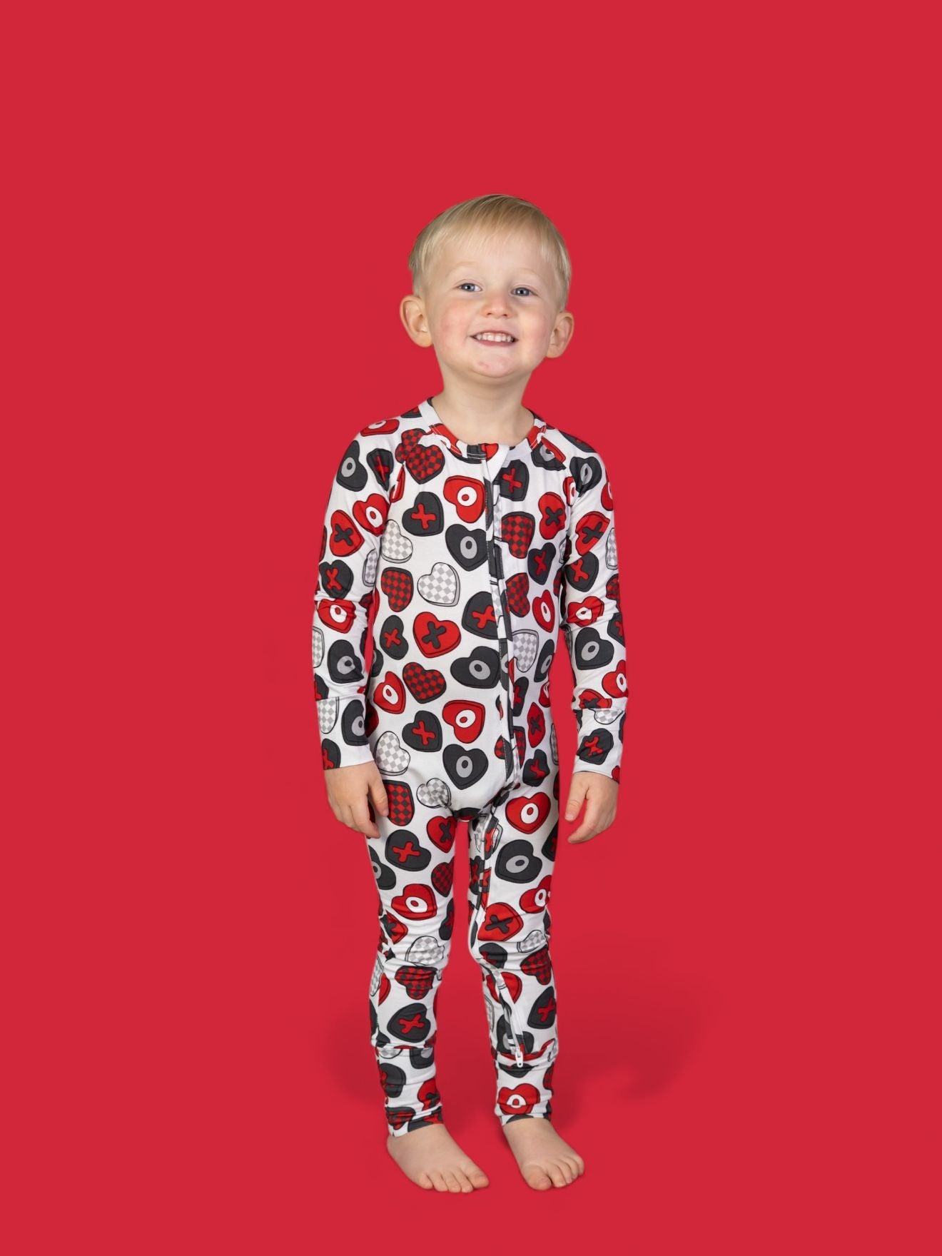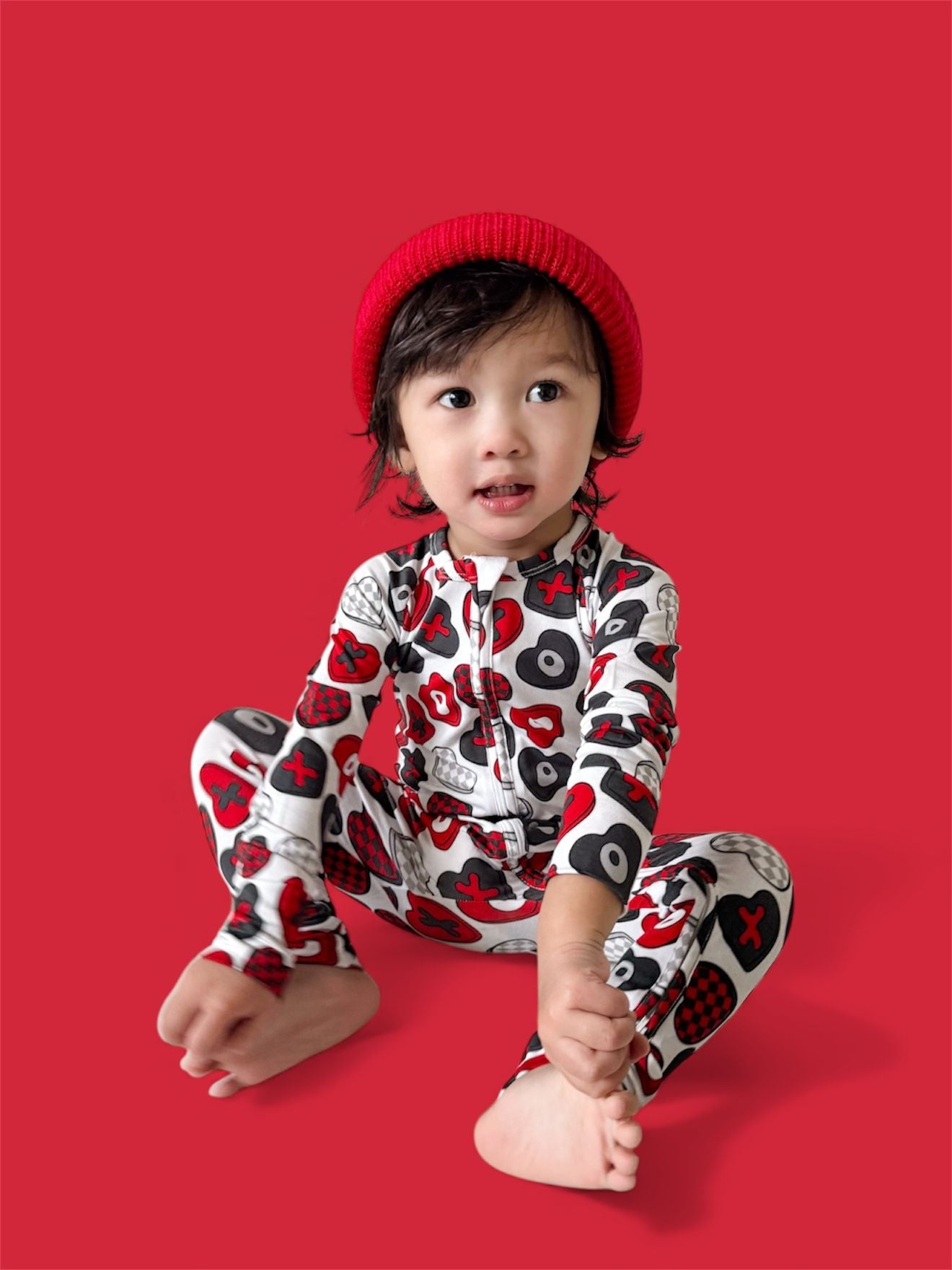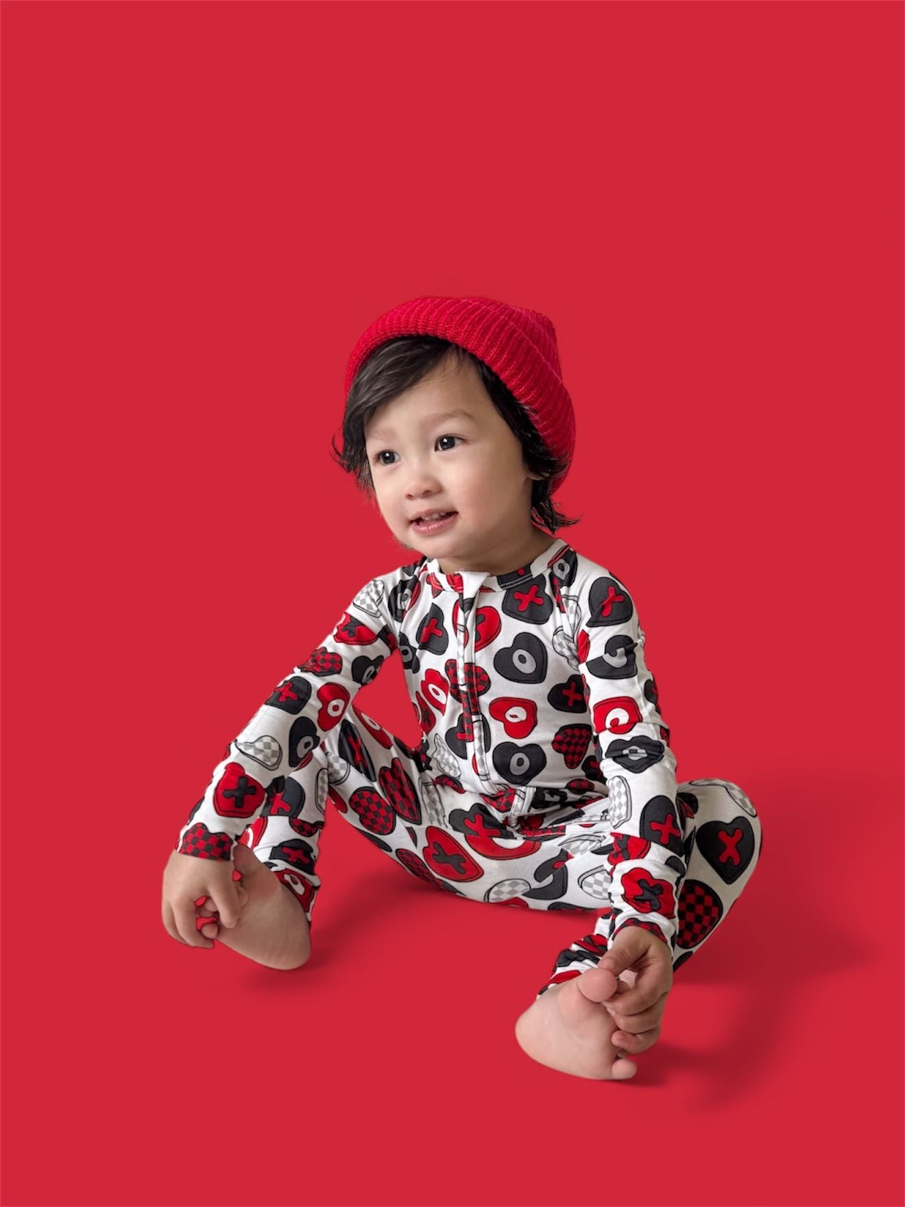 Playful hearts, cozy dreams! The Cross My Heart Dream Romper features a fun all-over print of hearts and X’s in shades of red, black, and white. Made from our signature buttery-soft bamboo fabric, it’s stretchy, breathable, and perfect for cuddles, naps, and playtime. With a two-way zipper for quick changes and a snug fit for all-day comfort, it’s as practical as it is adorable.