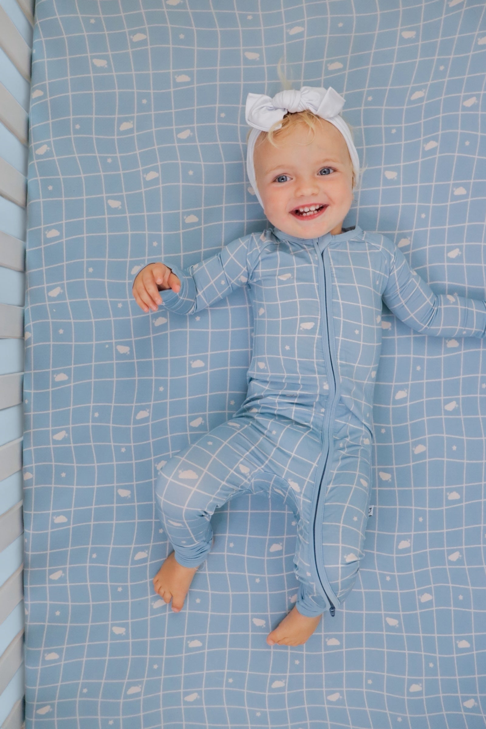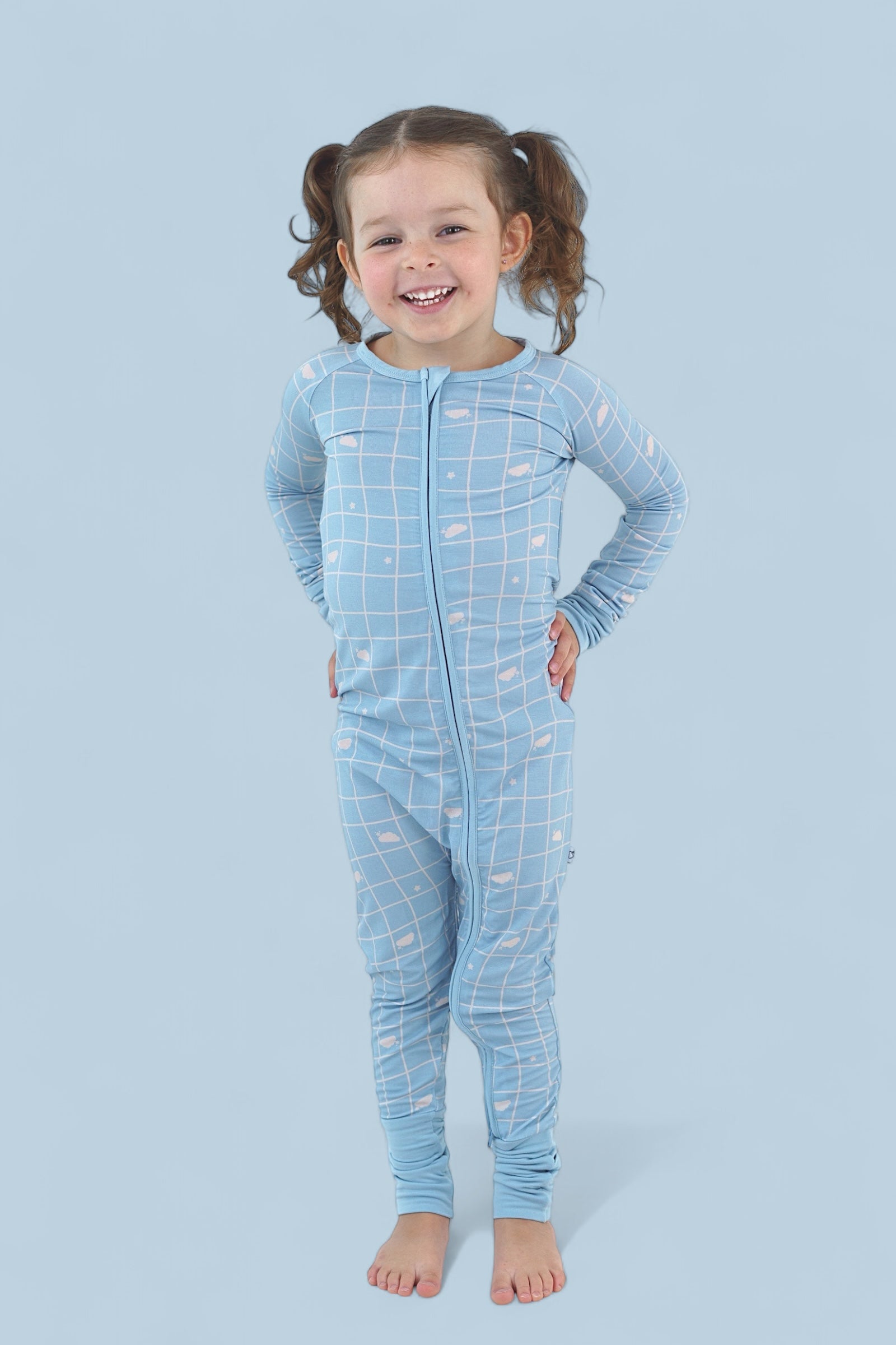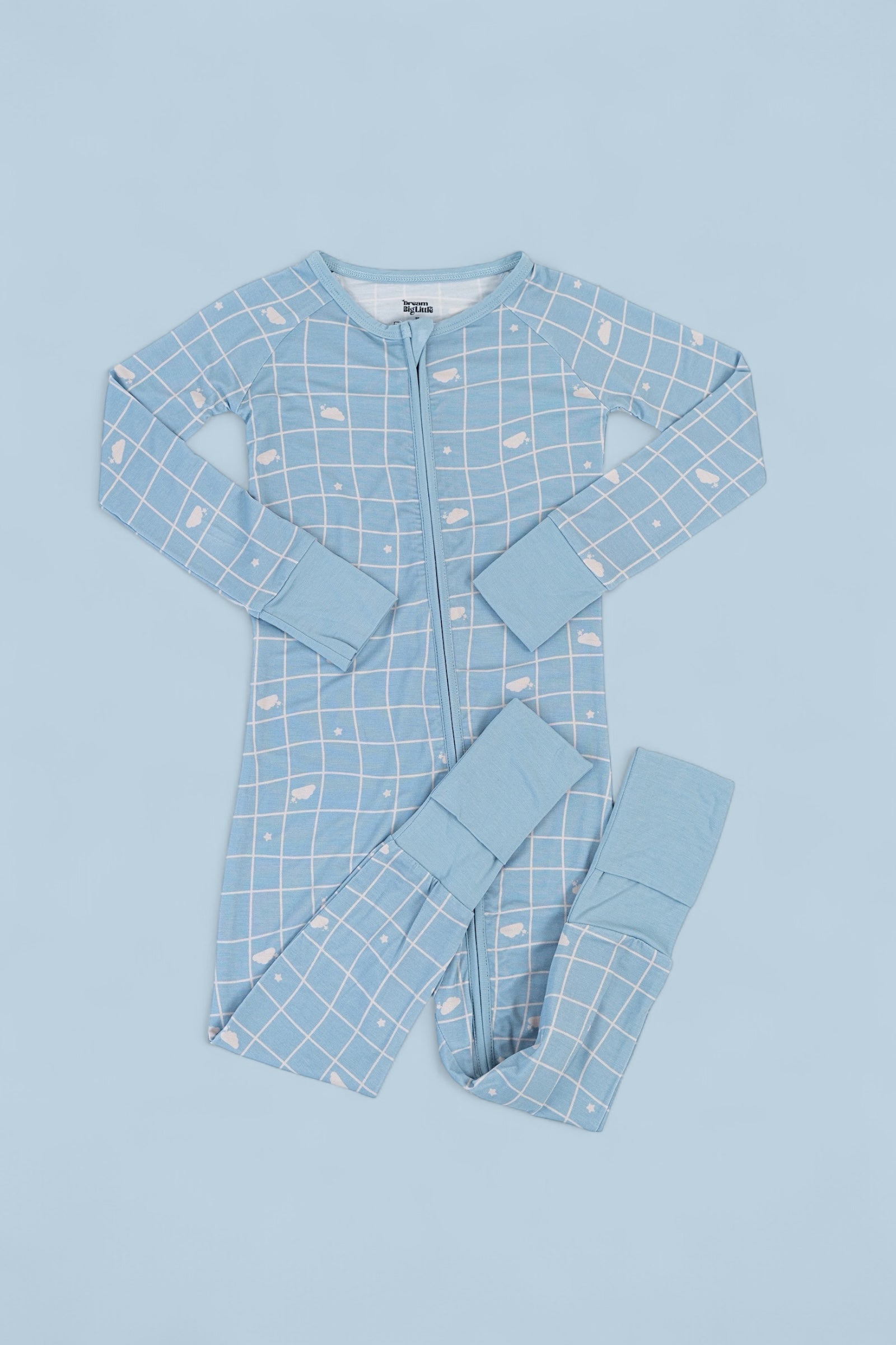 This exclusive print features a soft blue grid with wavy lines and scattered clouds and stars, inspired by the iconic DBLC logo. It’s a sky-kissed design that brings calm, whimsy, and a touch of magic to your little one’s wardrobe.