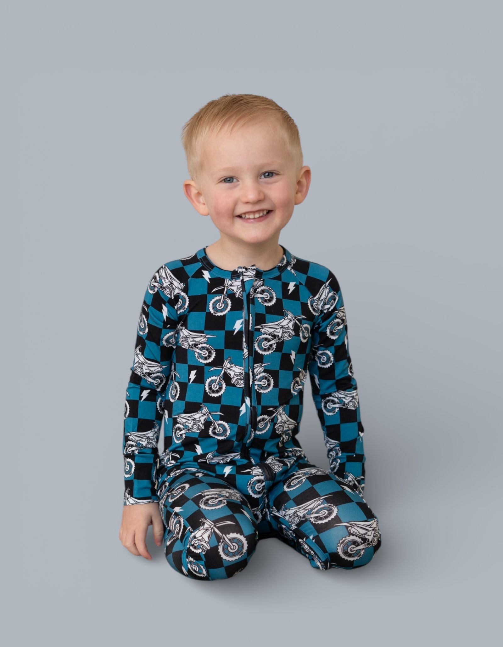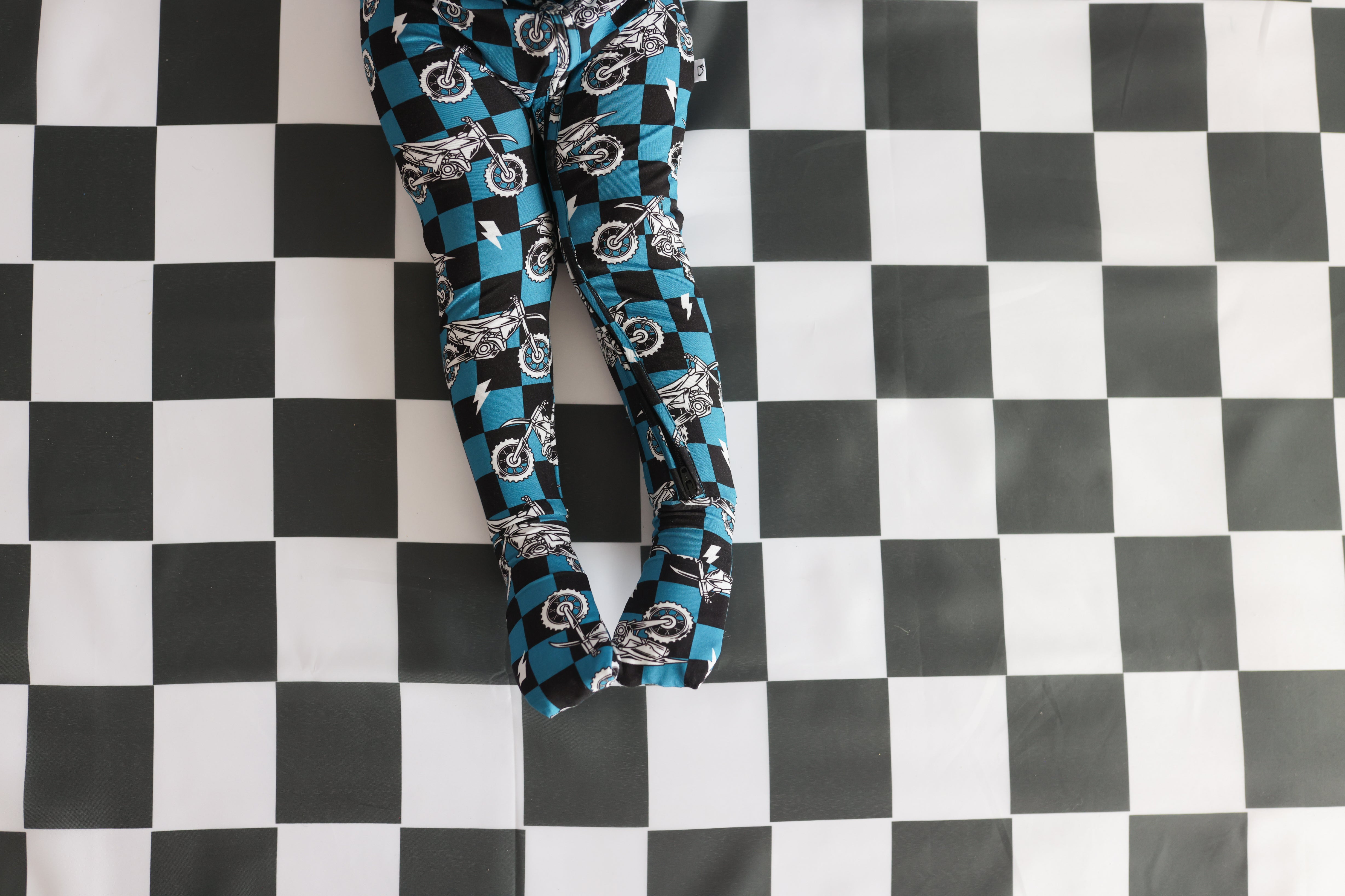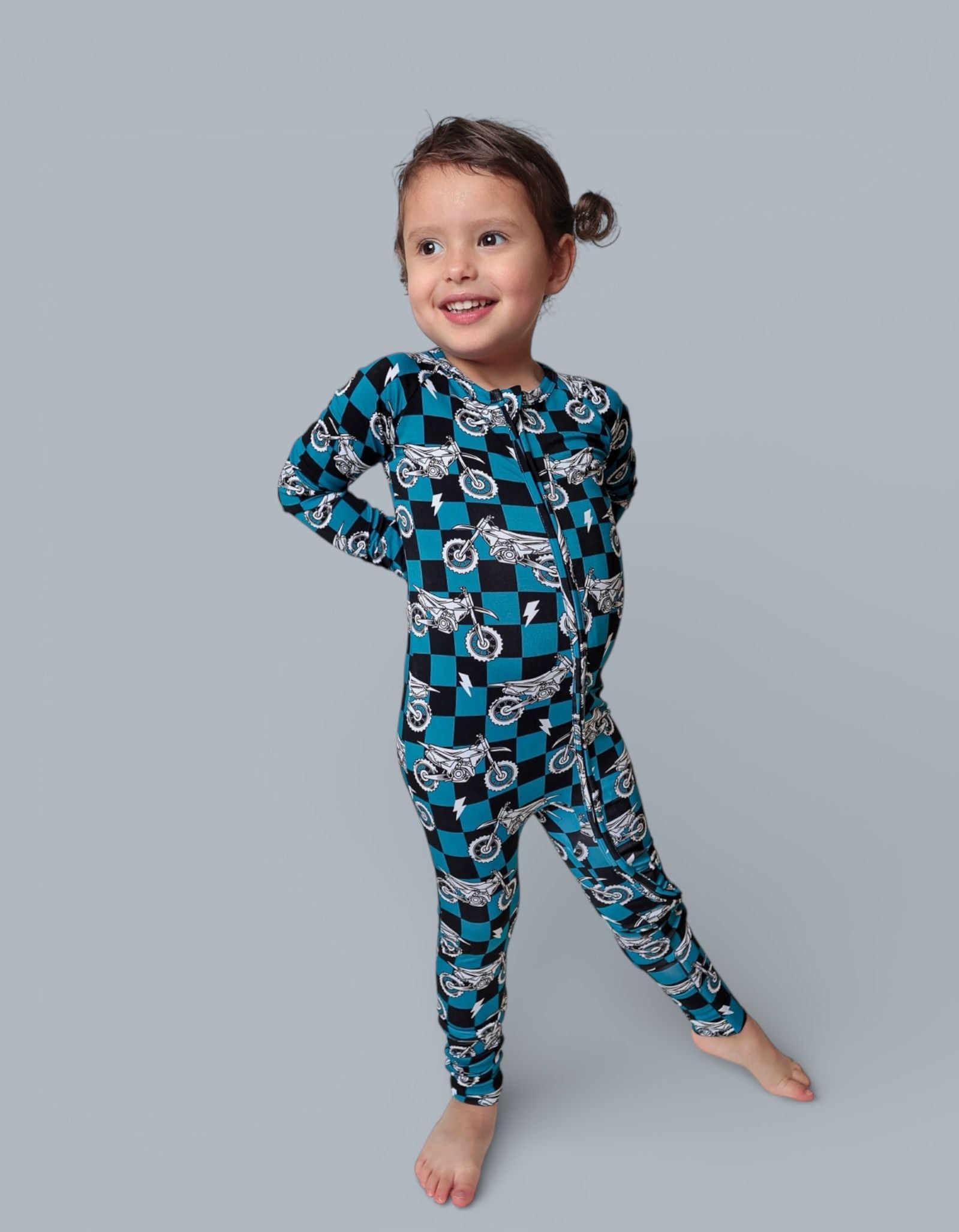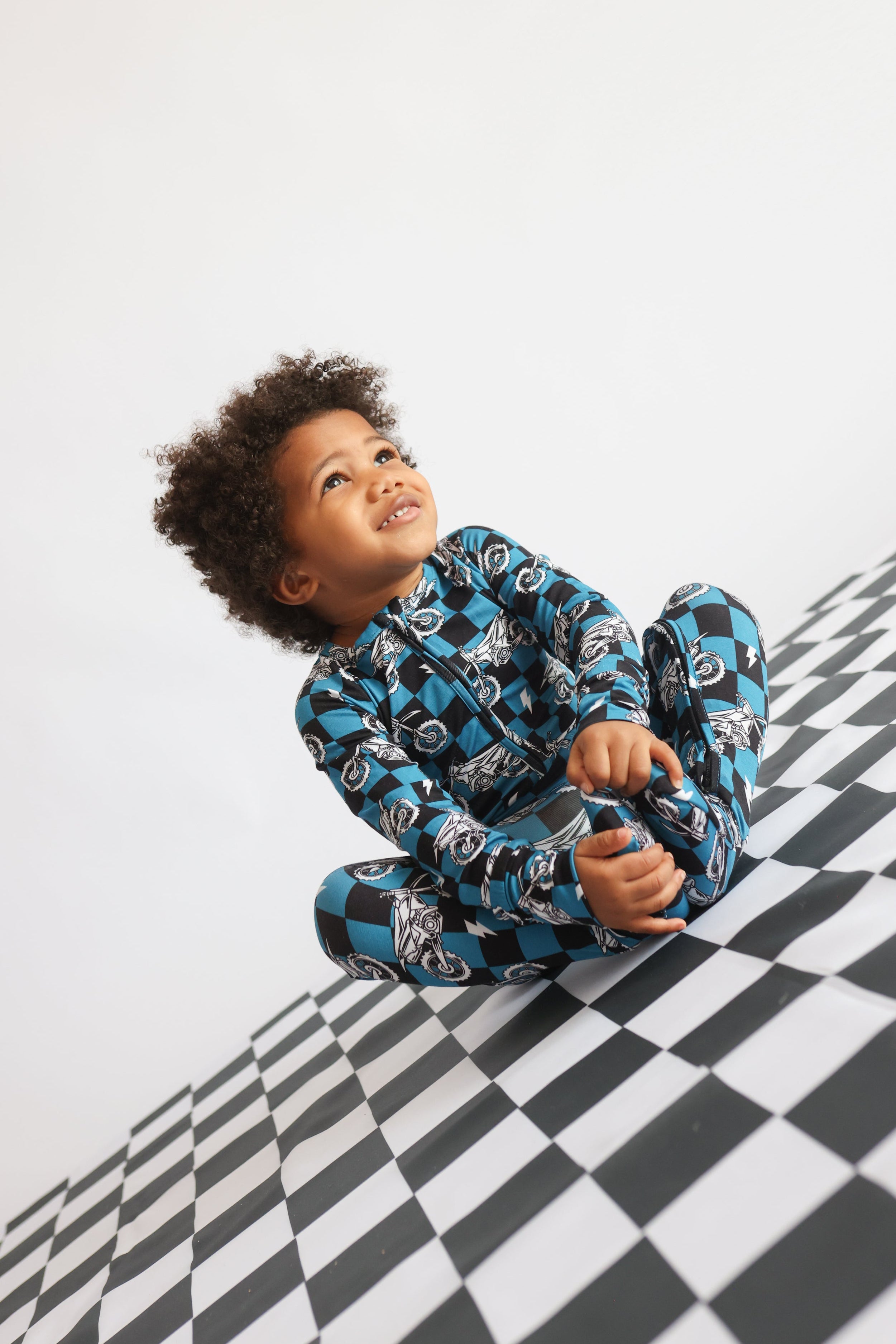 The Moto Mayhem Dream Romper is made for babies with a need for speed (and serious comfort). Featuring a bold checkered print with edgy motorbike details and lightning bolts, this one-piece romper is crafted from our signature buttery-soft bamboo fabric to keep little racers cozy, breathable, and comfy all day and night.