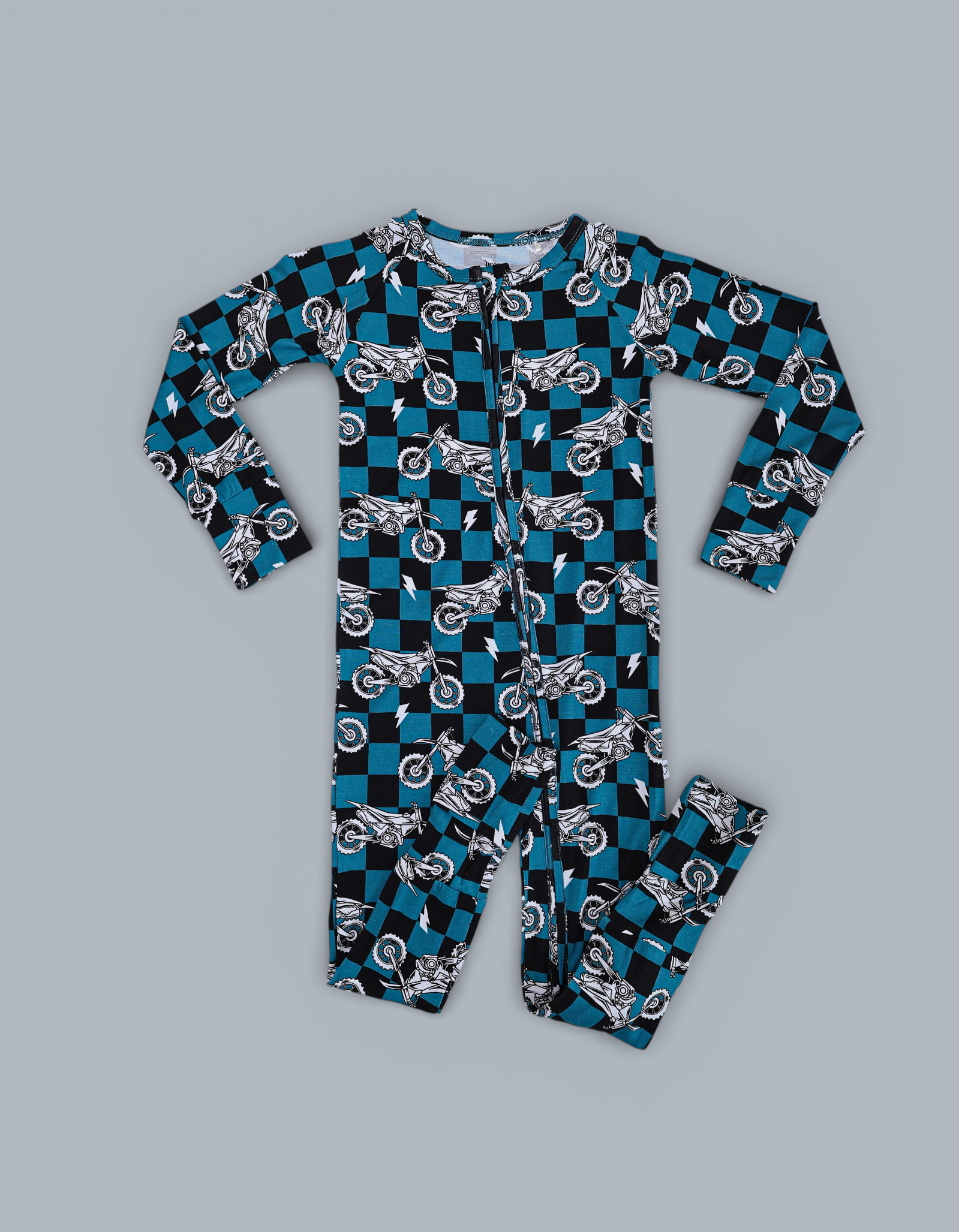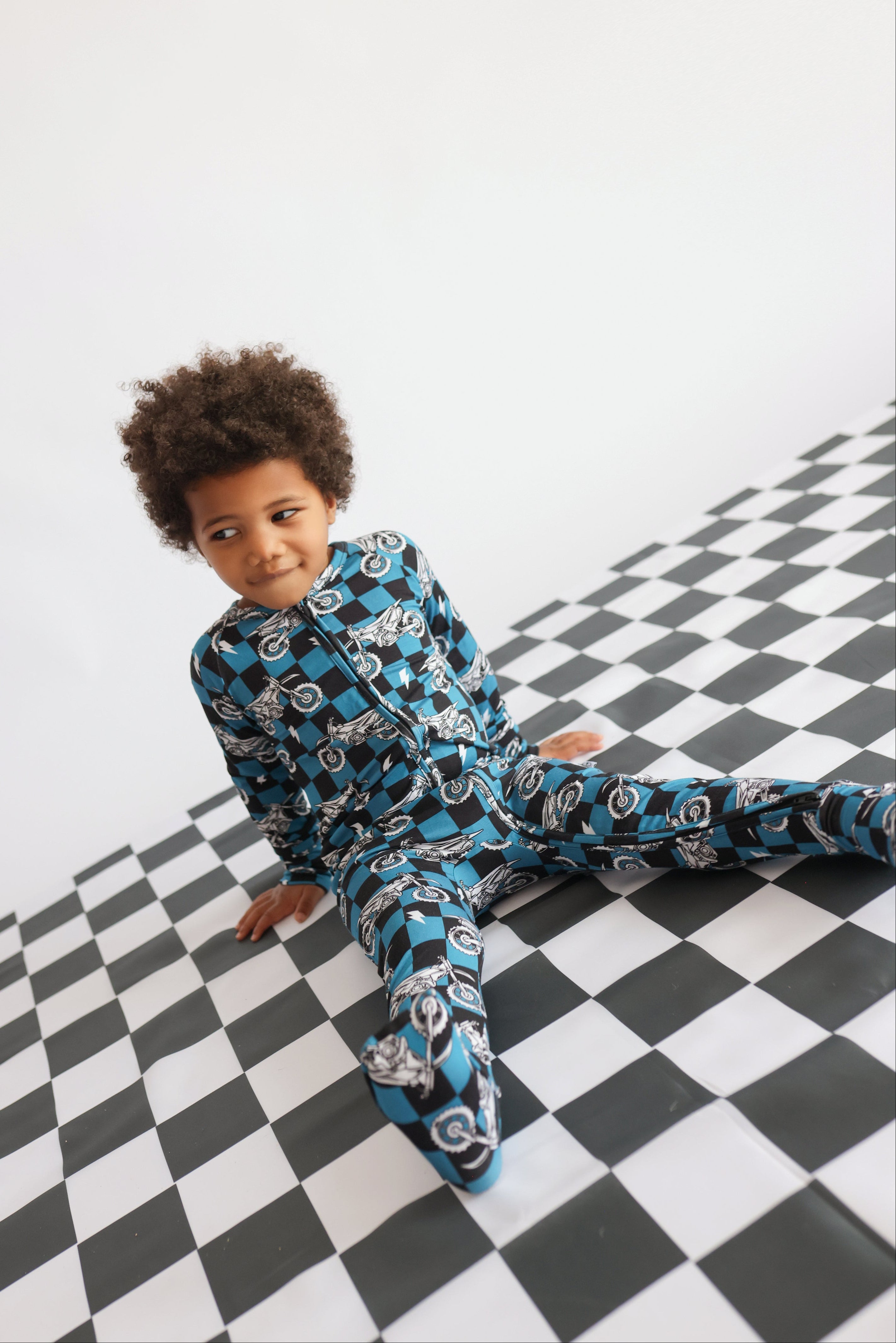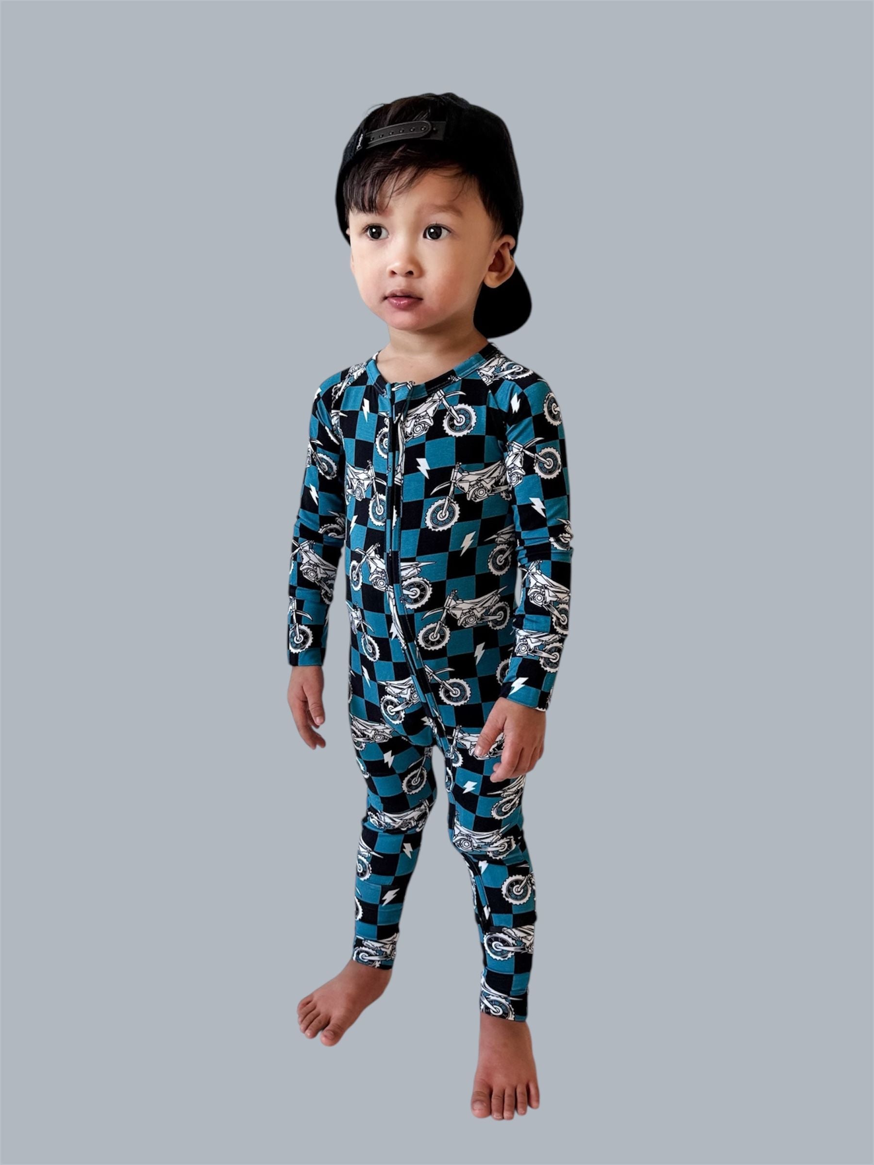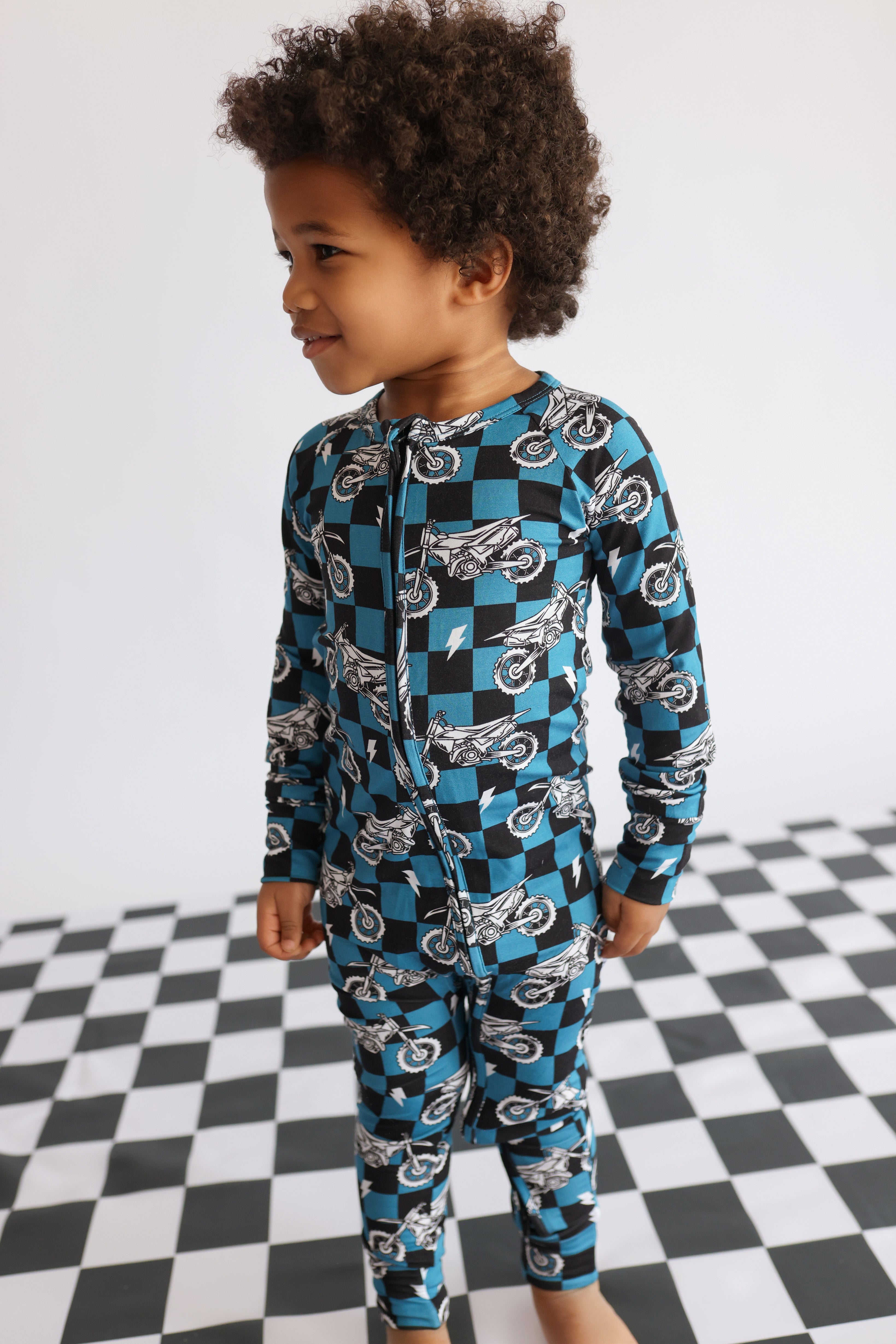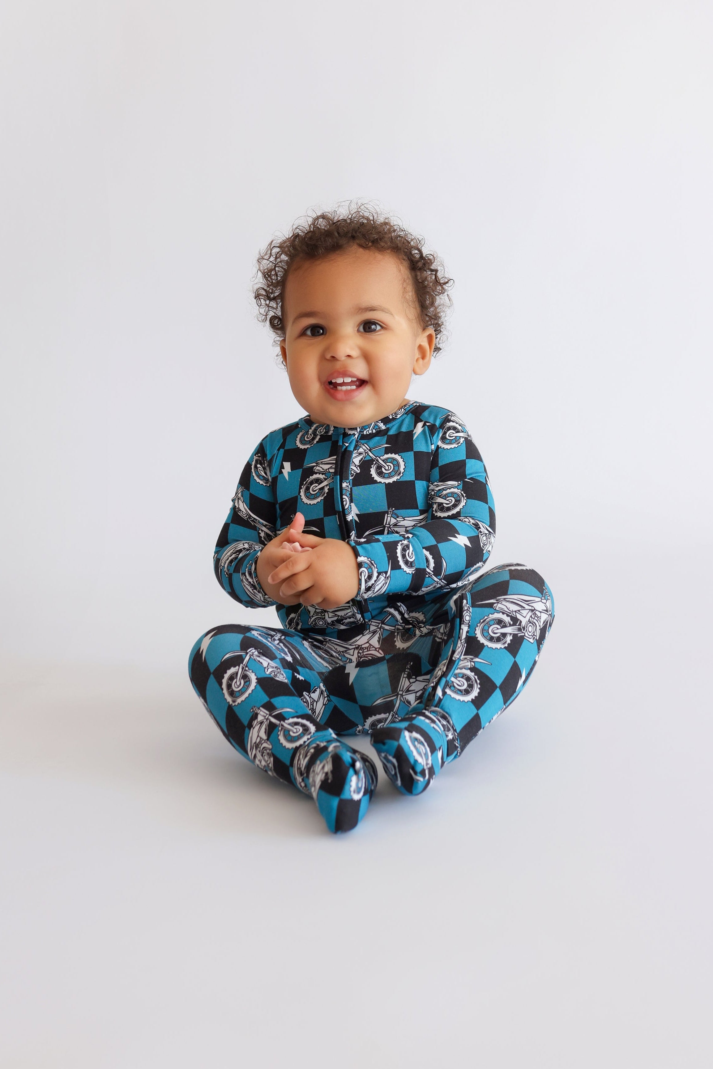 The Moto Mayhem Dream Romper is made for babies with a need for speed (and serious comfort). Featuring a bold checkered print with edgy motorbike details and lightning bolts, this one-piece romper is crafted from our signature buttery-soft bamboo fabric to keep little racers cozy, breathable, and comfy all day and night.