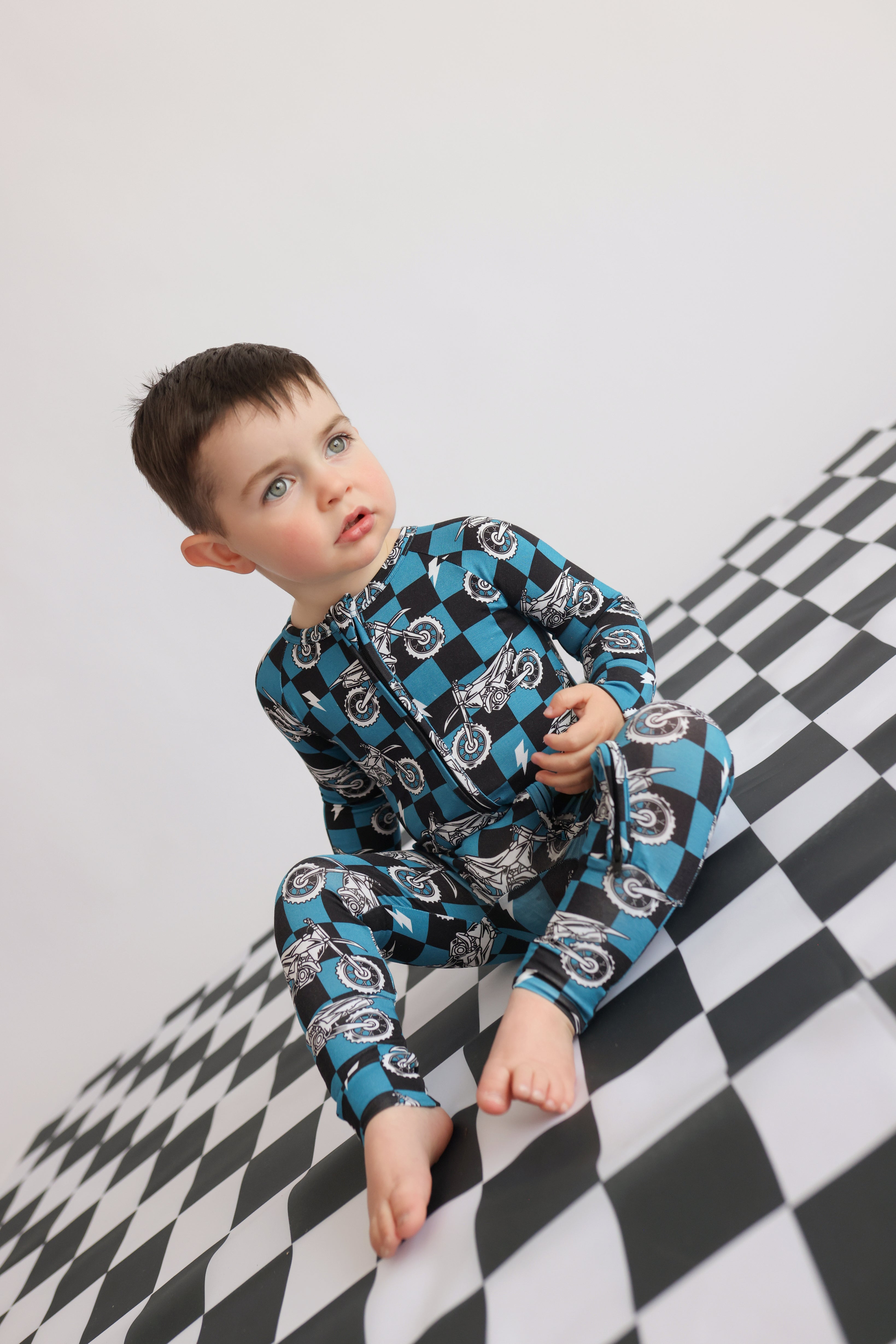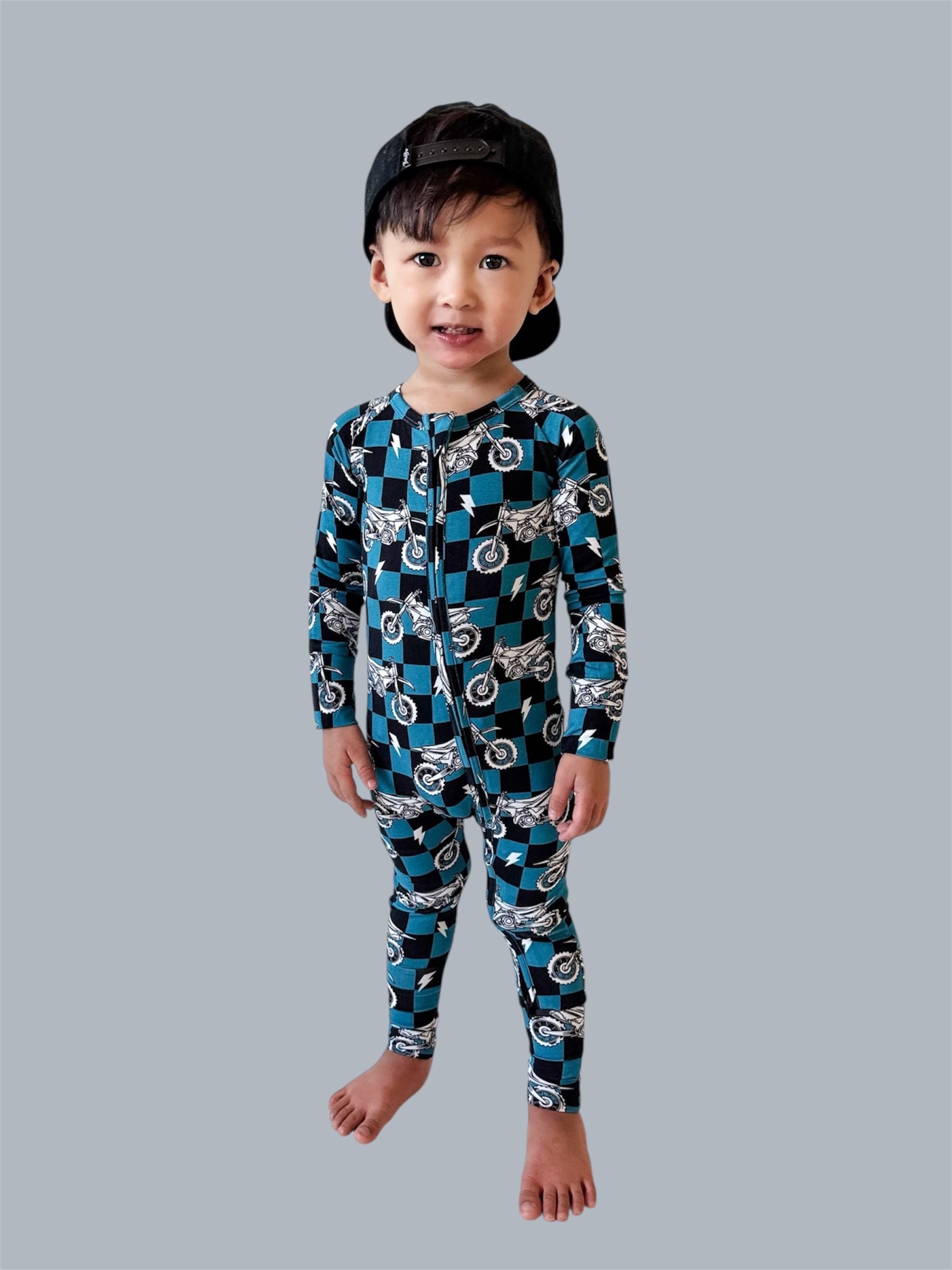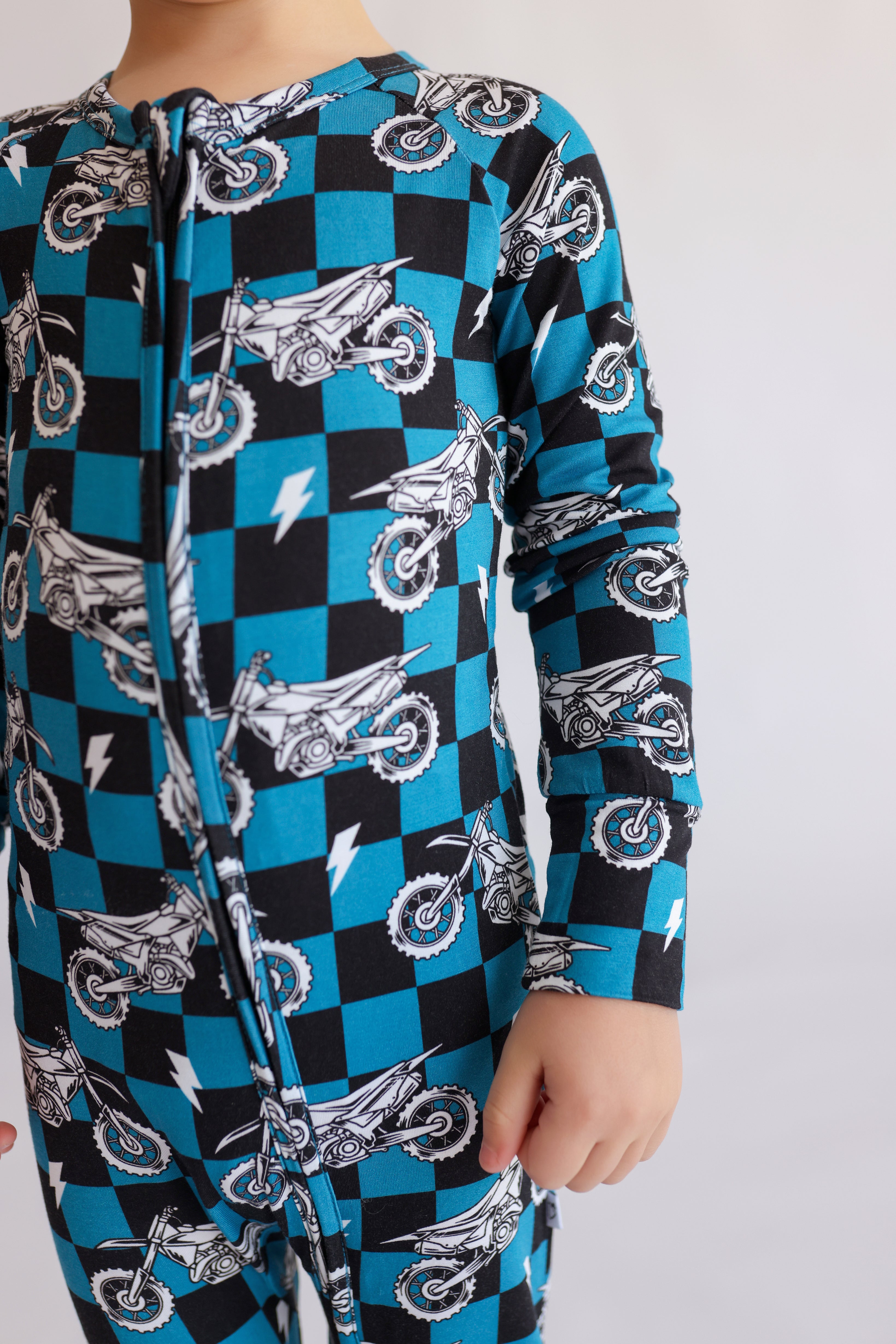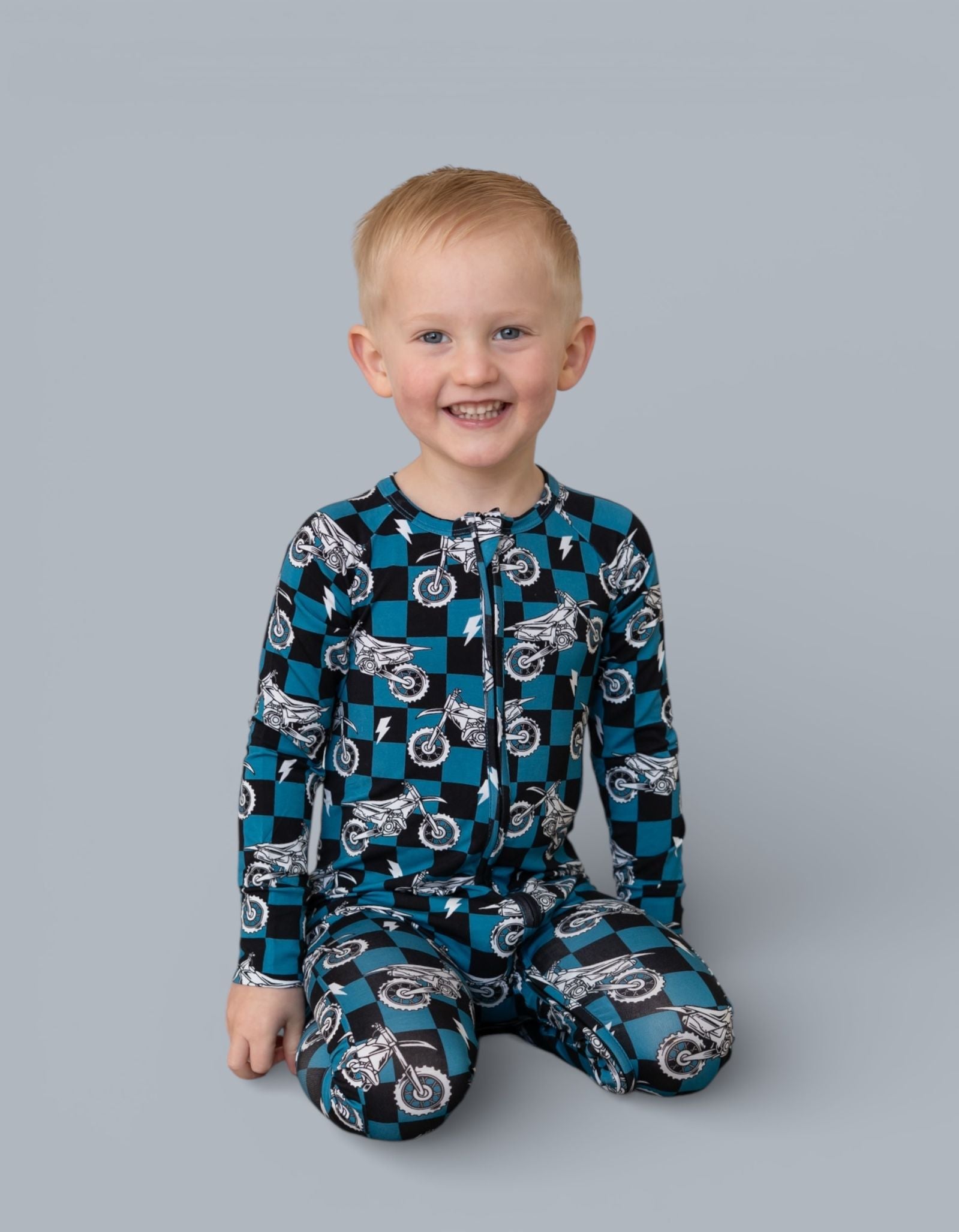 The Moto Mayhem Dream Romper is made for babies with a need for speed (and serious comfort). Featuring a bold checkered print with edgy motorbike details and lightning bolts, this one-piece romper is crafted from our signature buttery-soft bamboo fabric to keep little racers cozy, breathable, and comfy all day and night.