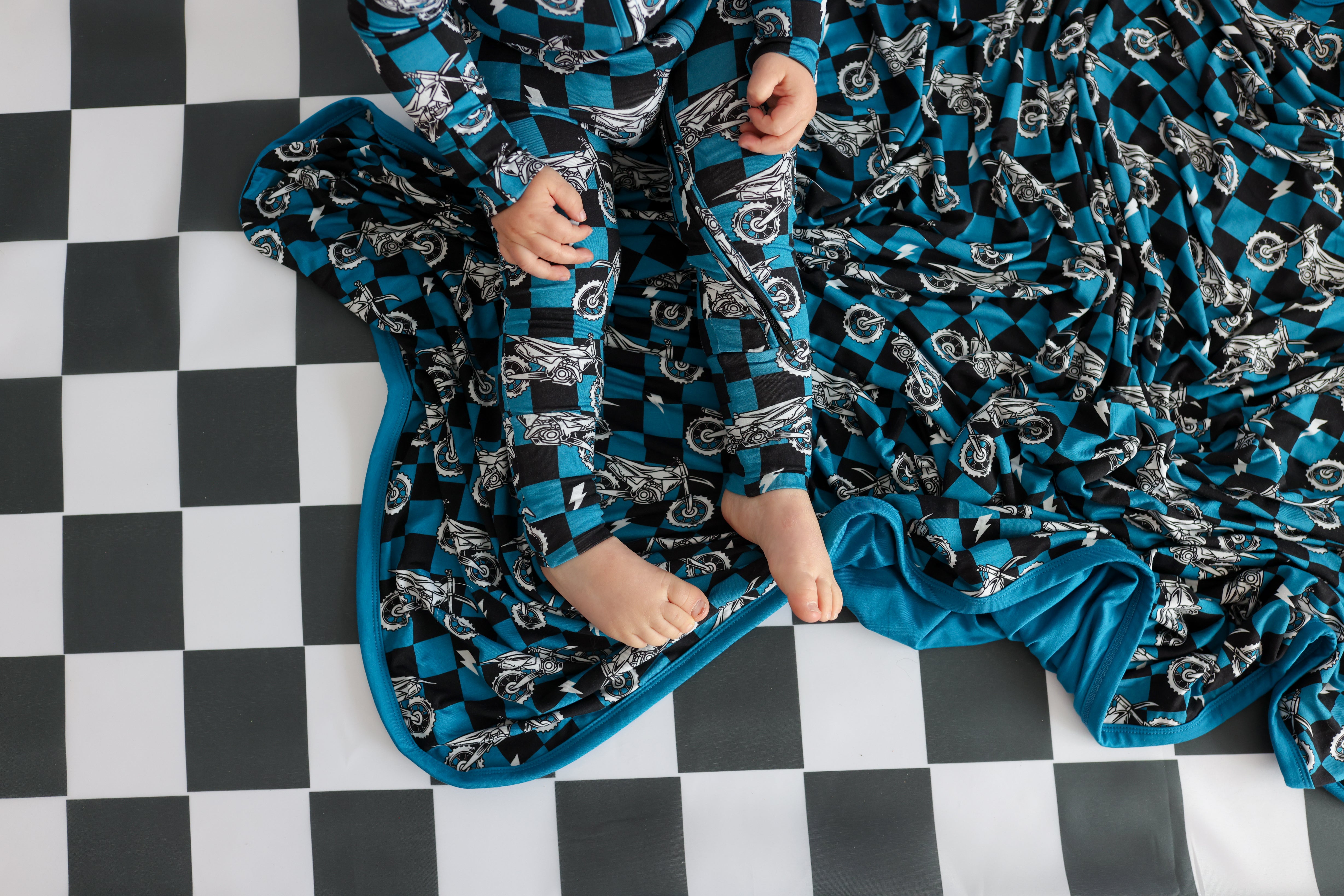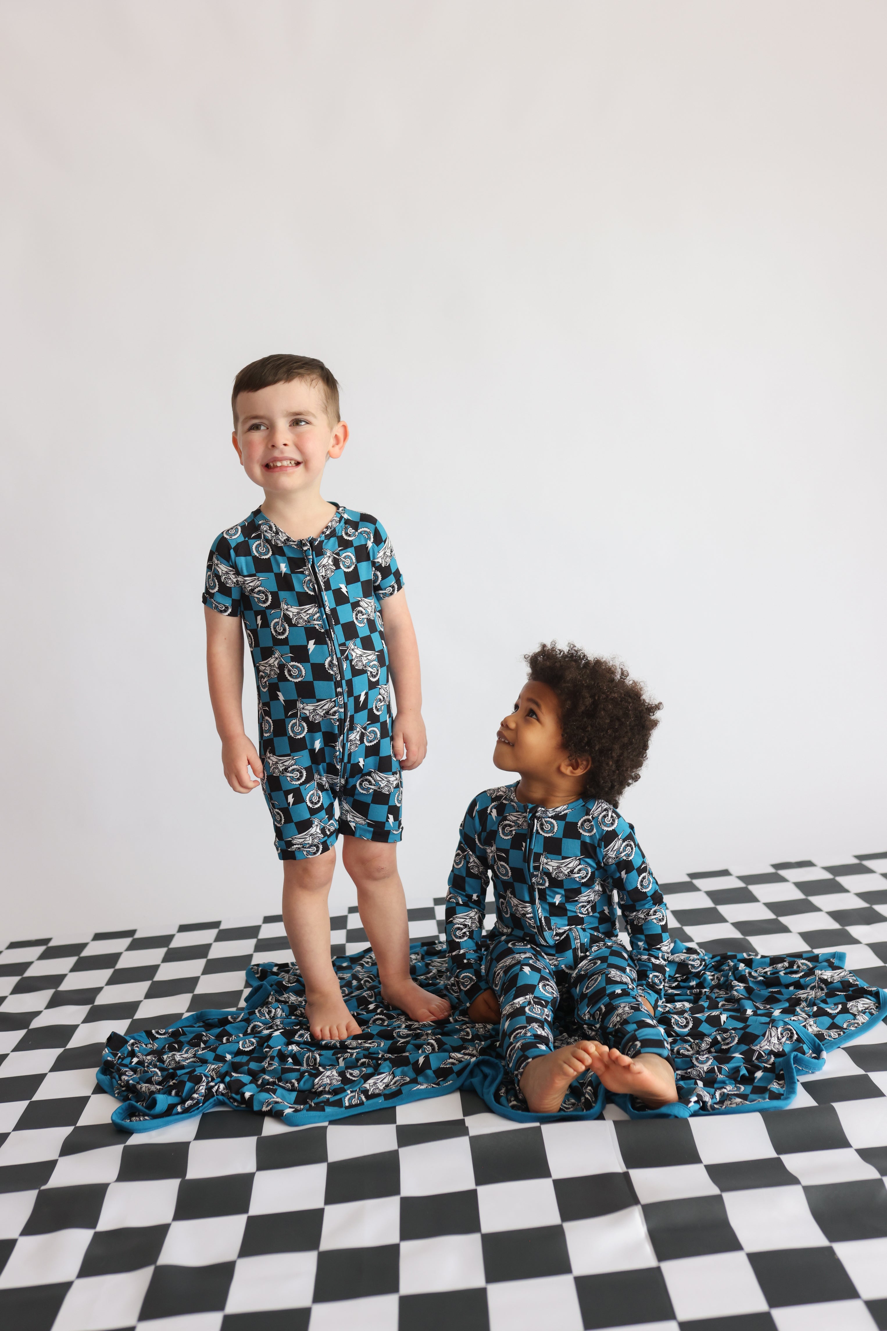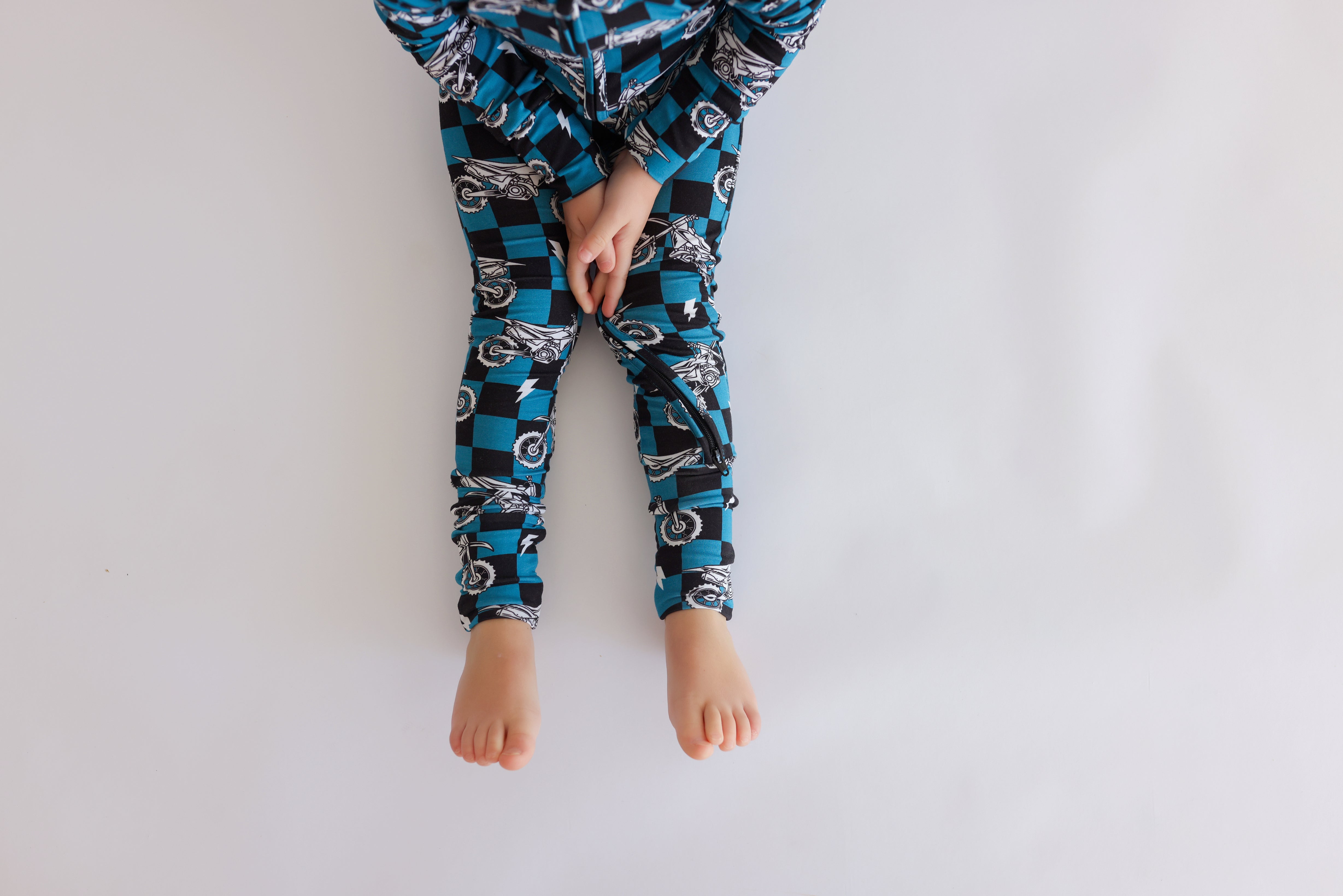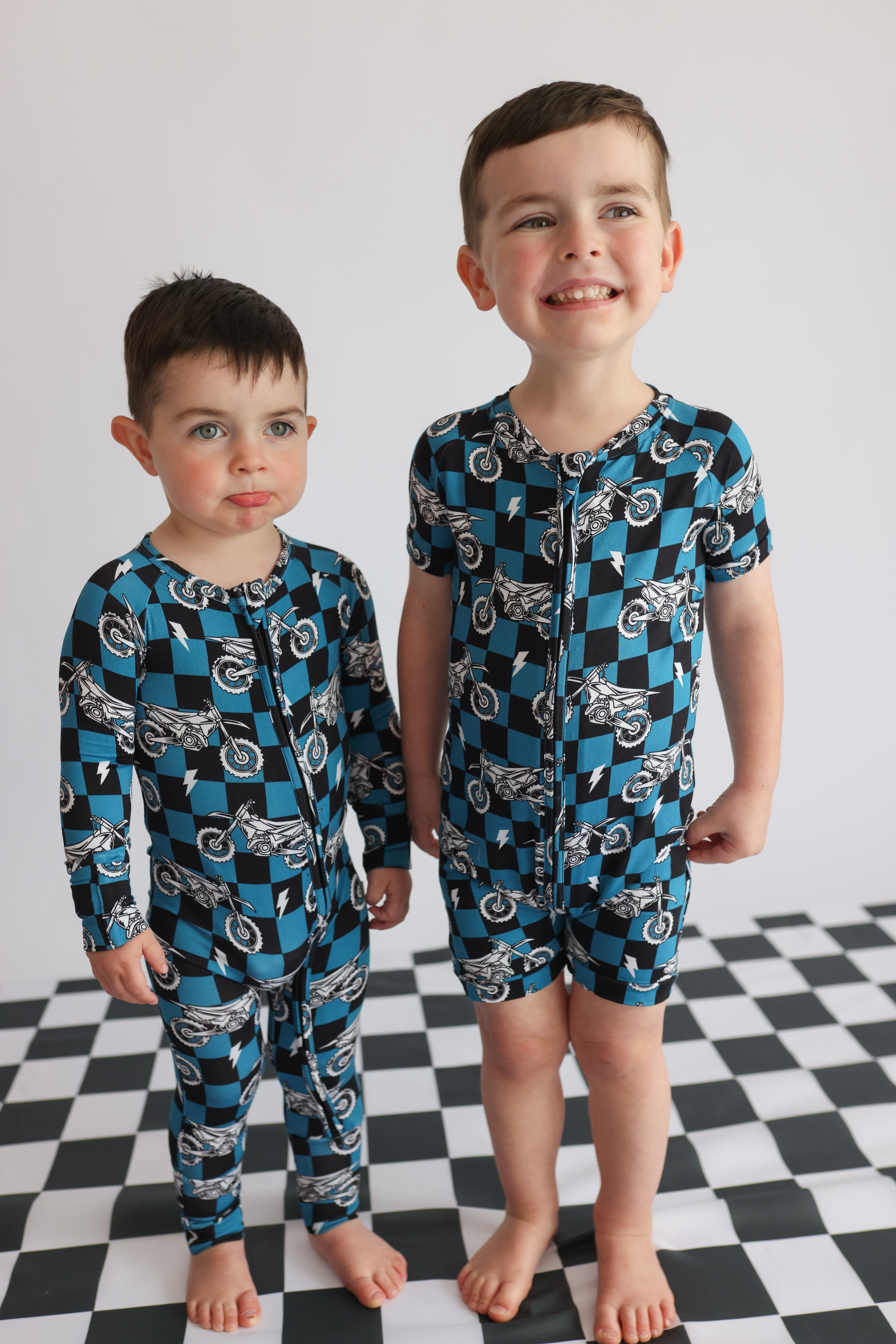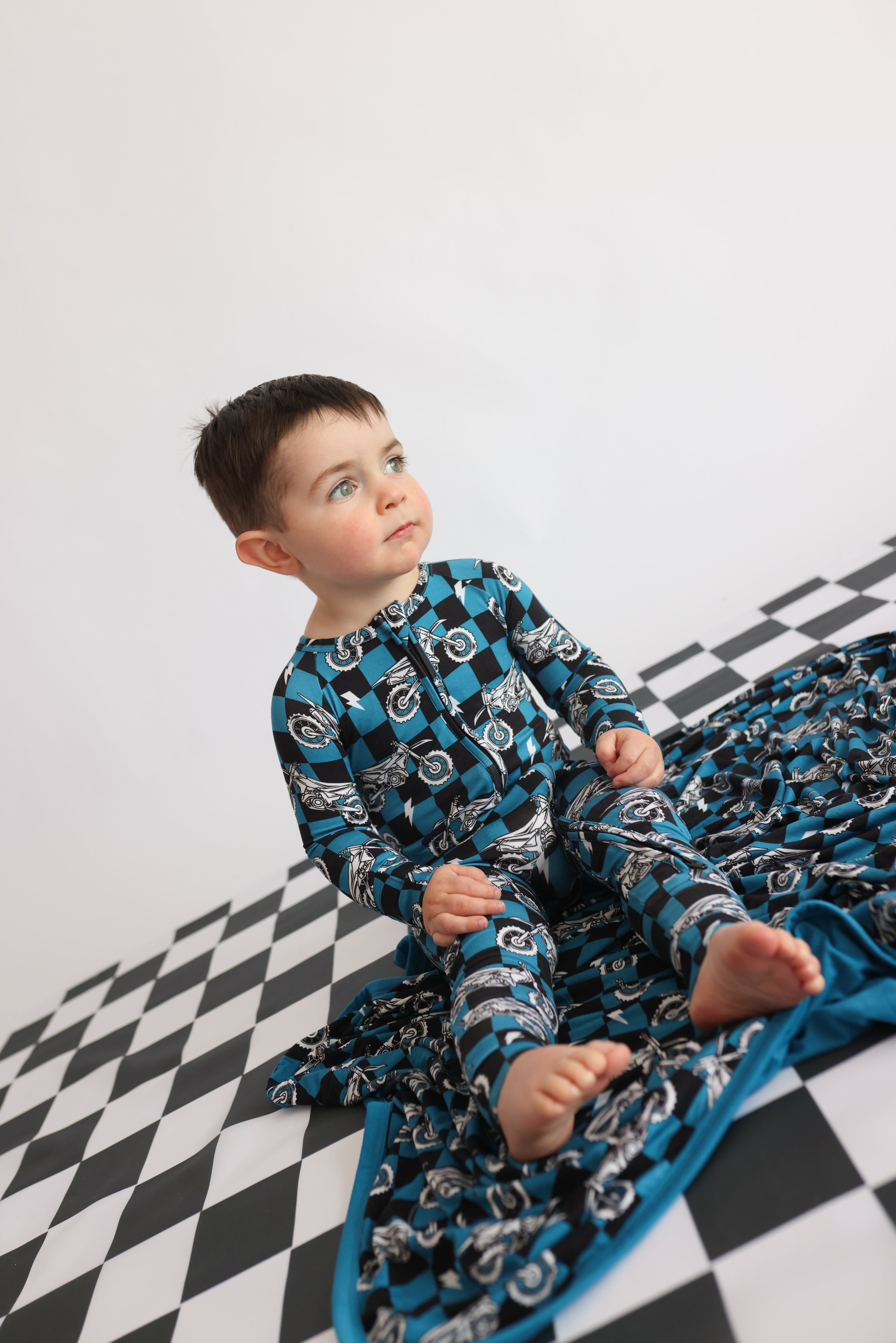 The Moto Mayhem Dream Romper is made for babies with a need for speed (and serious comfort). Featuring a bold checkered print with edgy motorbike details and lightning bolts, this one-piece romper is crafted from our signature buttery-soft bamboo fabric to keep little racers cozy, breathable, and comfy all day and night.