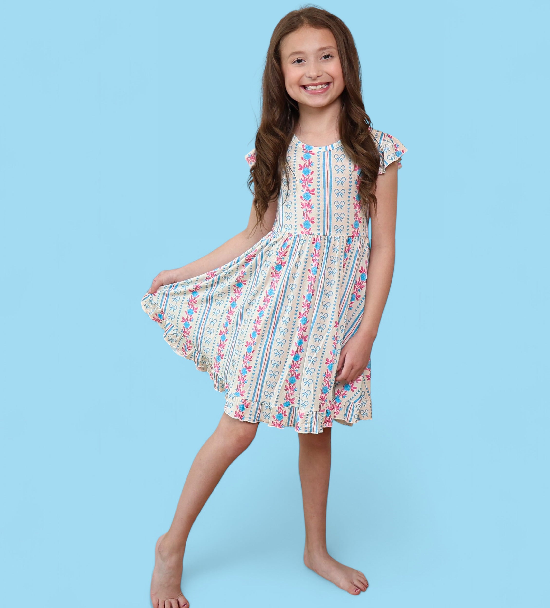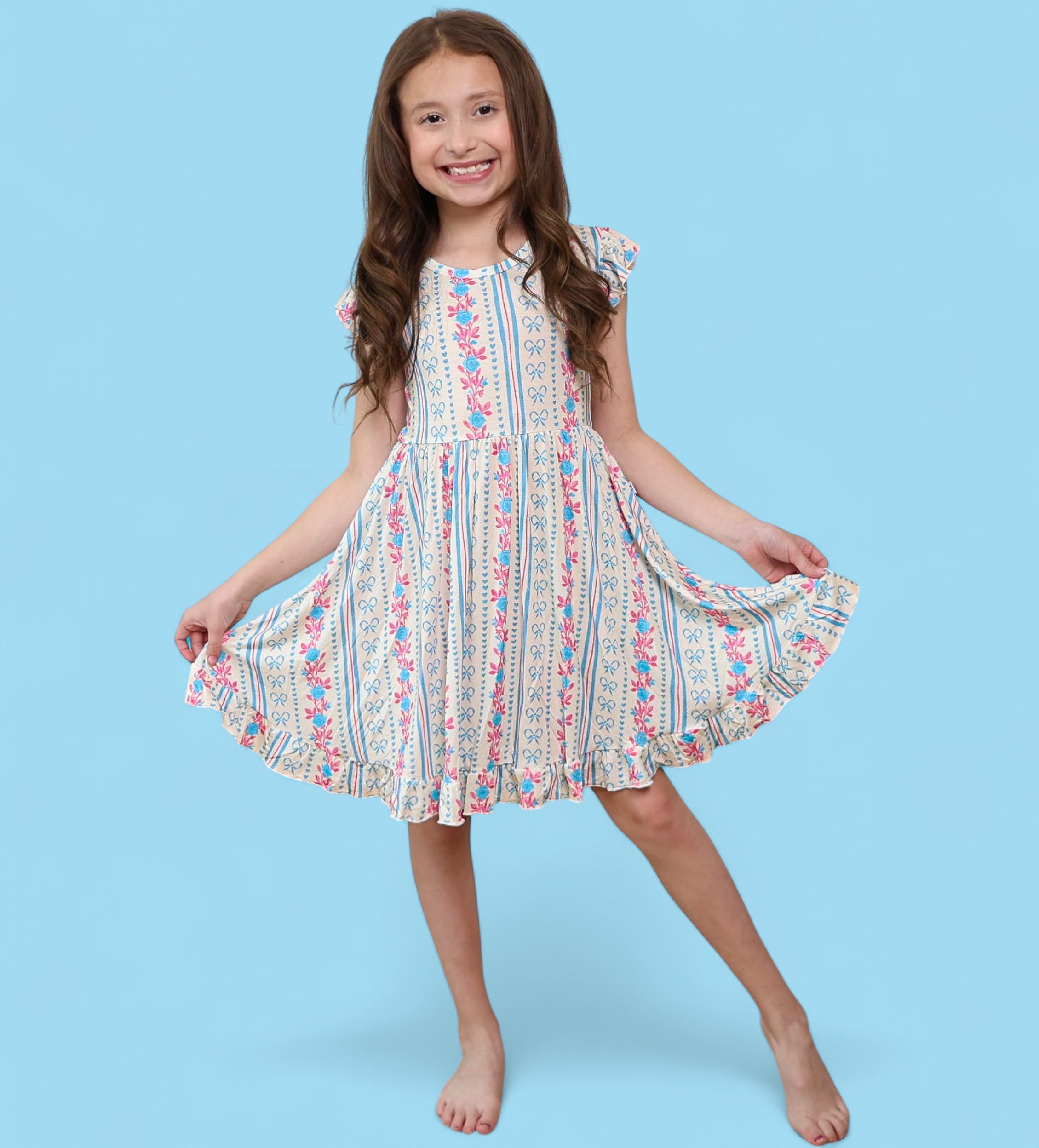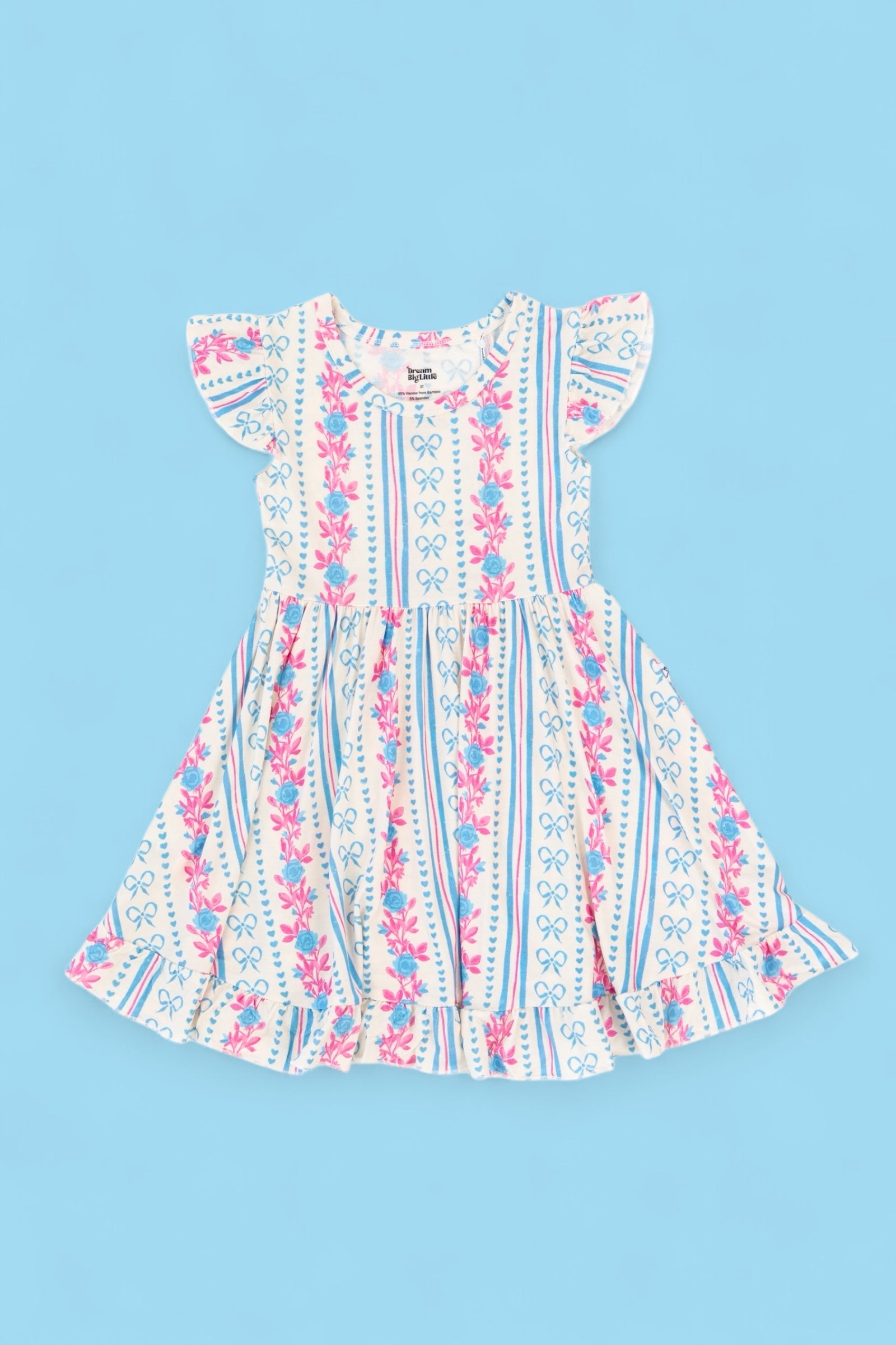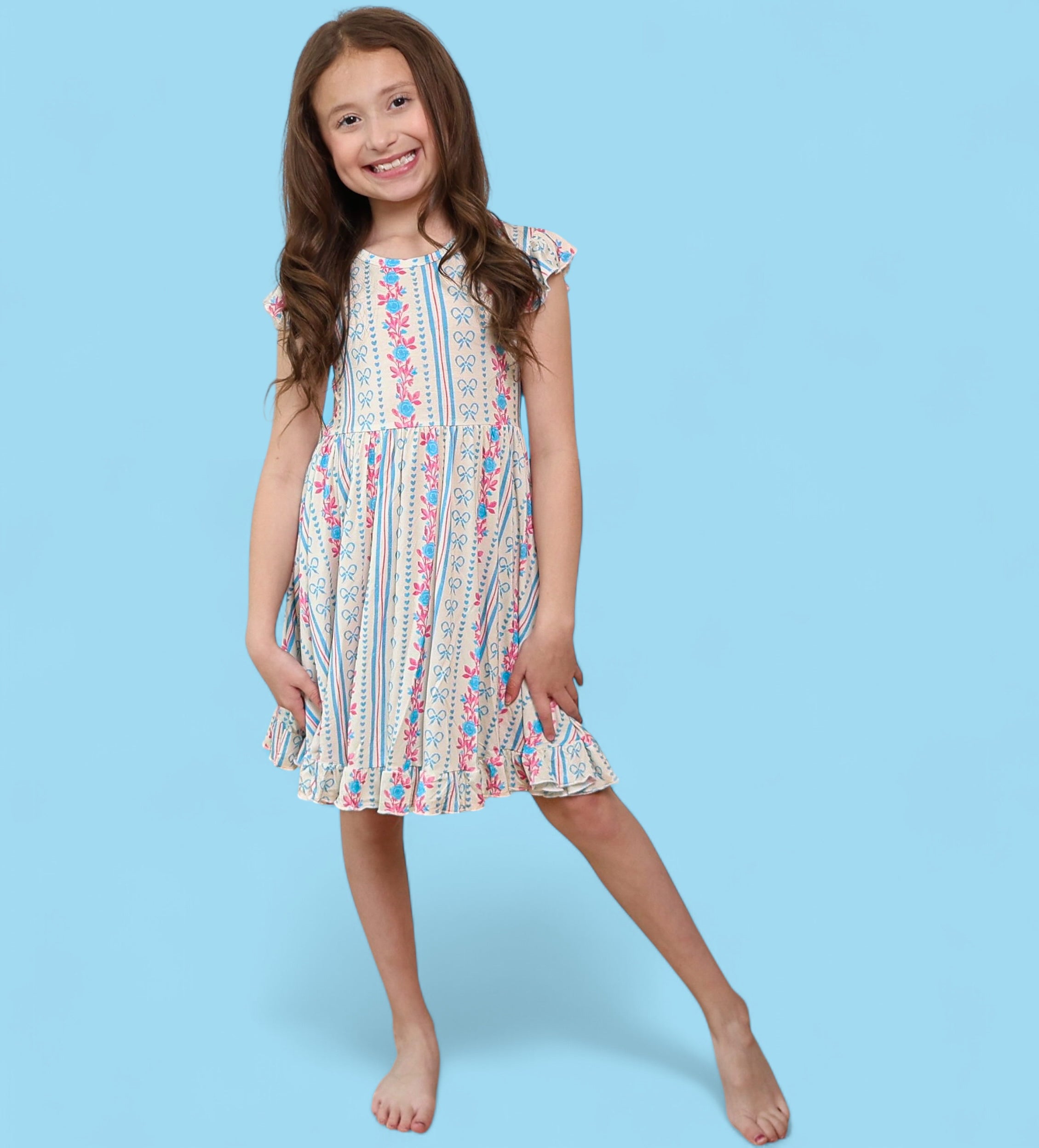 Crafted from the softest and most breathable bamboo viscose material, this dreamy dress is made for all-day comfort, play, and photo-worthy twirls. Featuring our delicate Petite Posie print—soft pink florals, tiny hearts, and subtle stripes—it brings timeless elegance to everyday adventures.