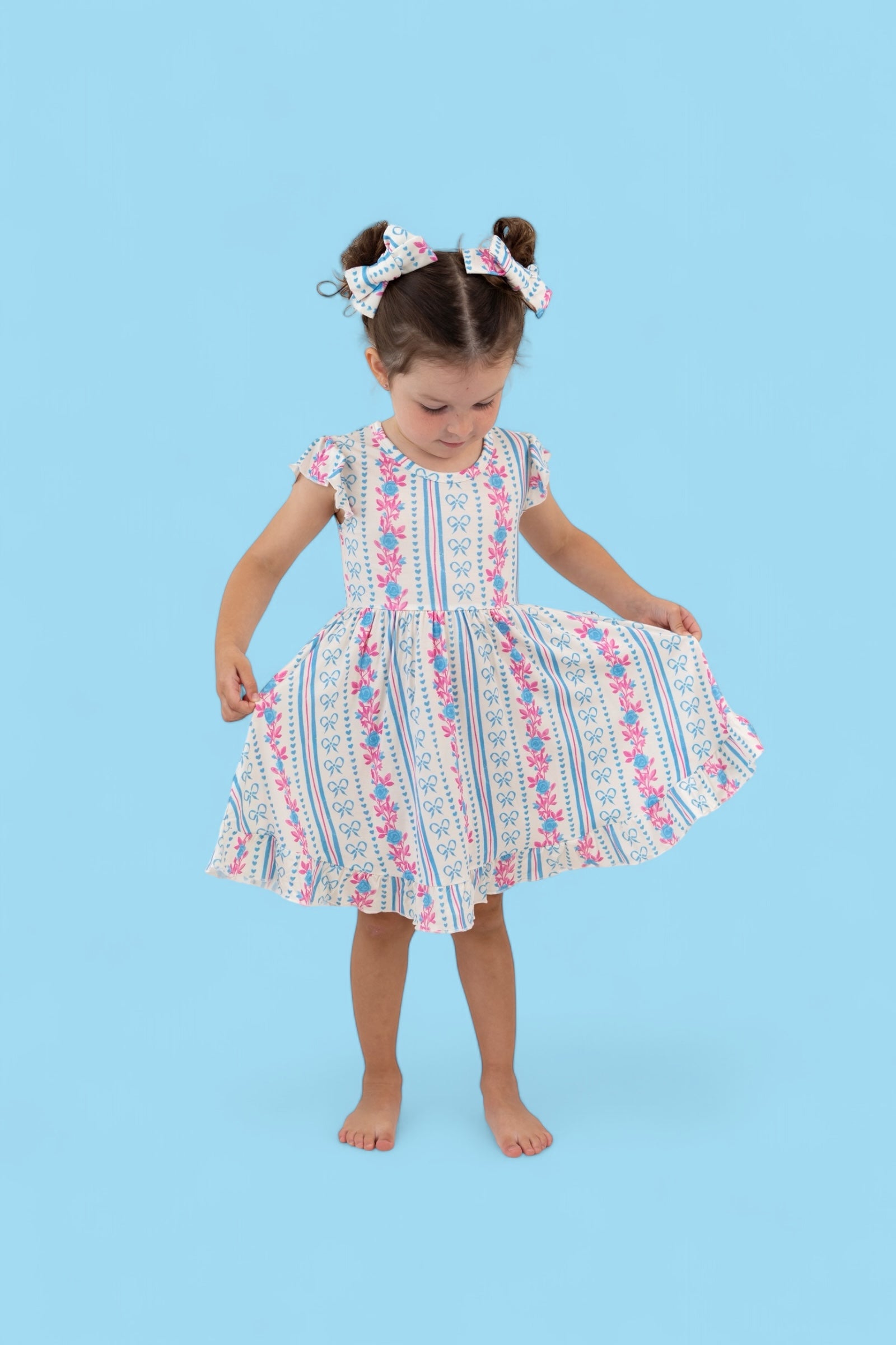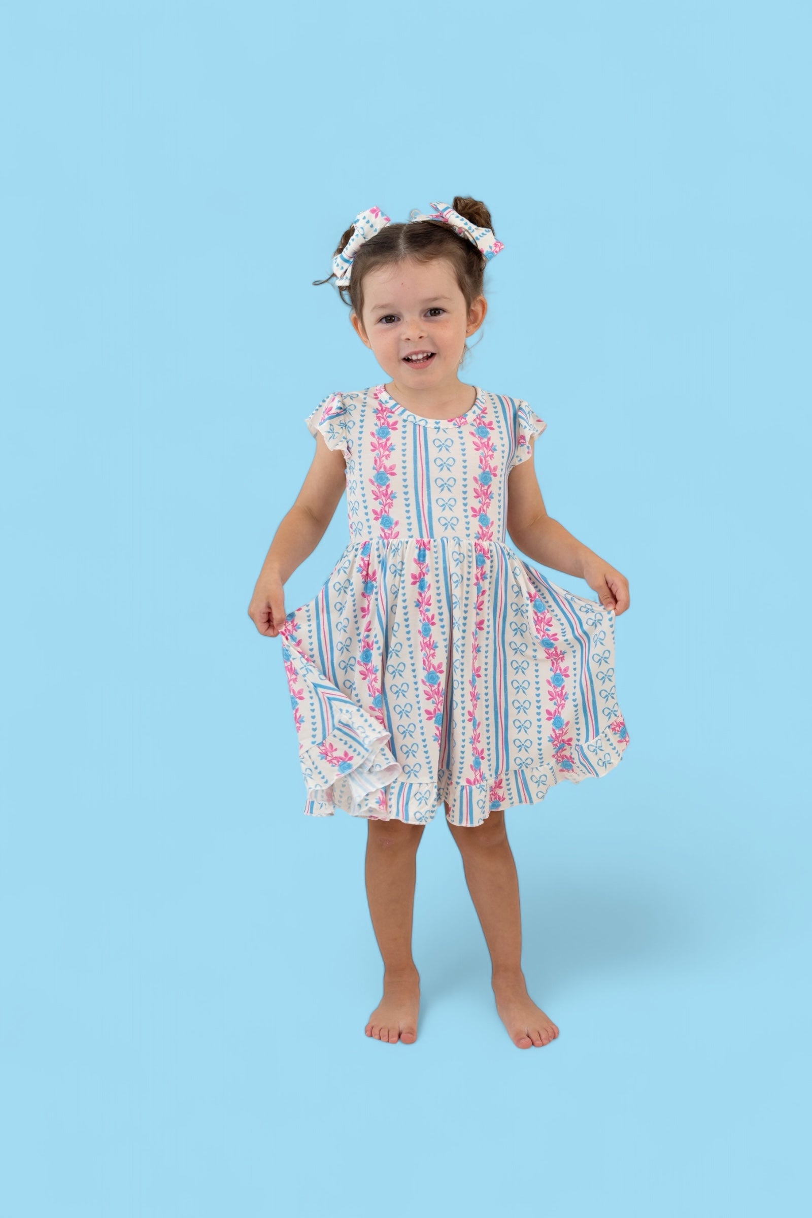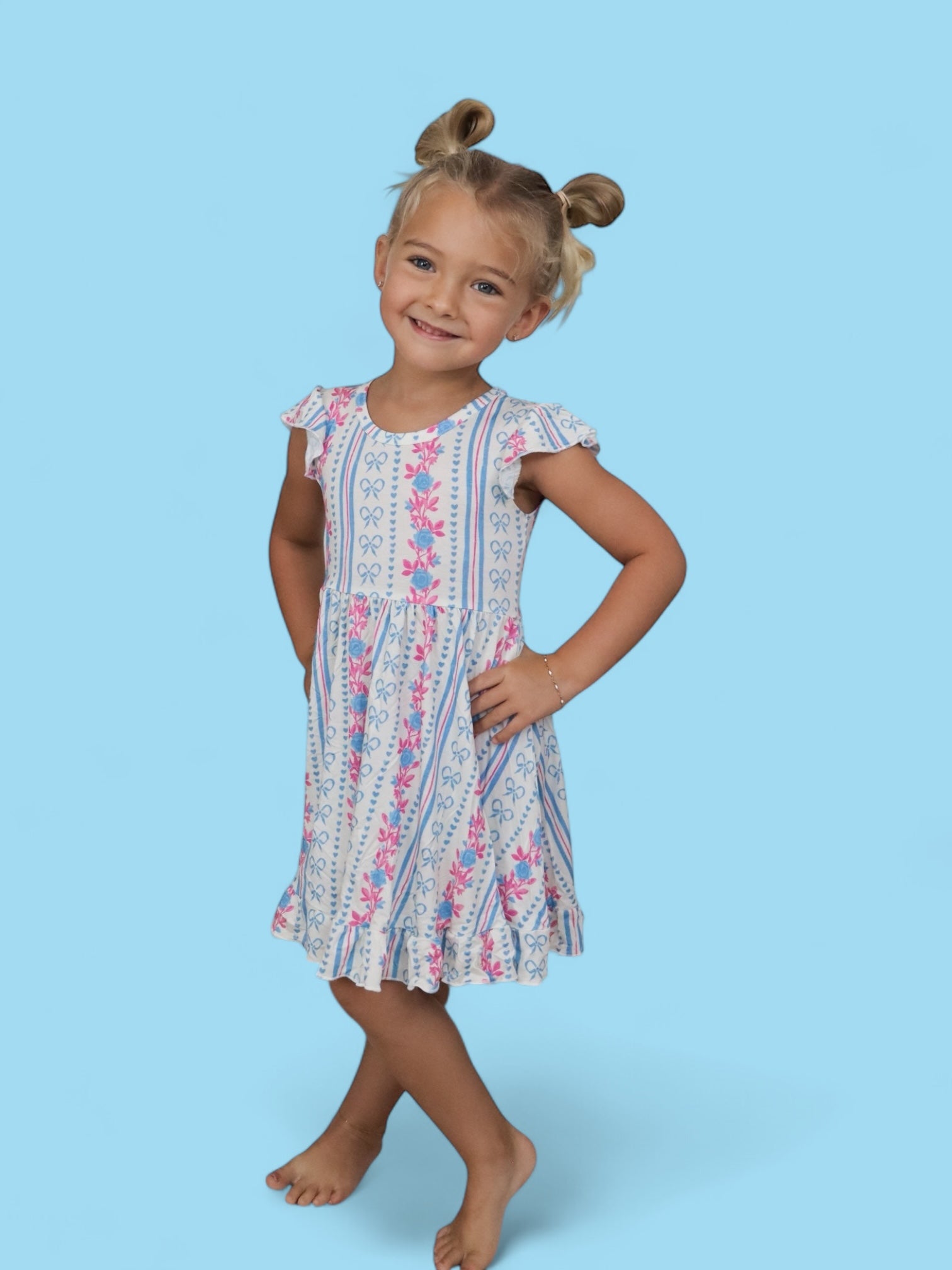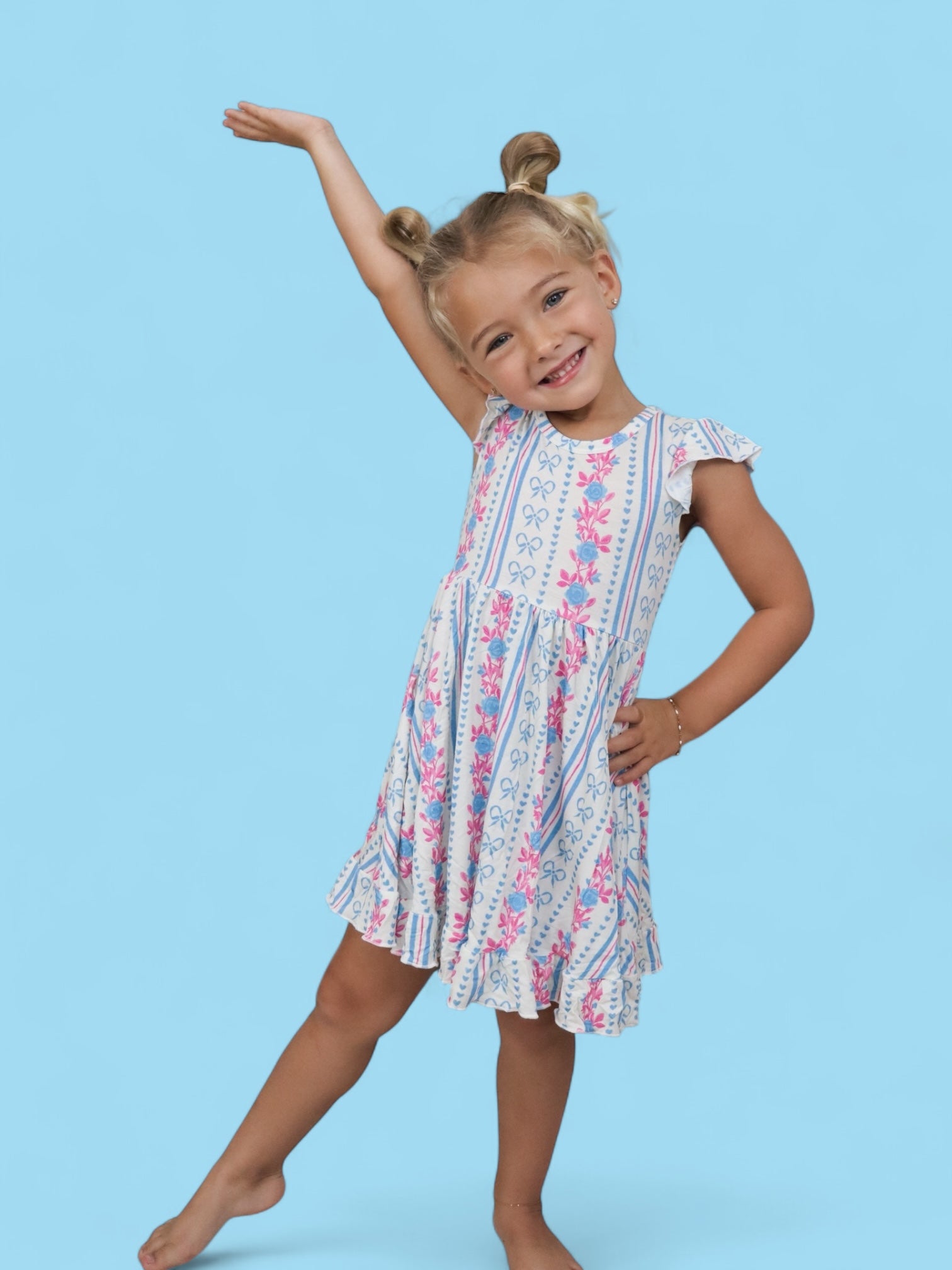 Crafted from the softest and most breathable bamboo viscose material, this dreamy dress is made for all-day comfort, play, and photo-worthy twirls. Featuring our delicate Petite Posie print—soft pink florals, tiny hearts, and subtle stripes—it brings timeless elegance to everyday adventures.