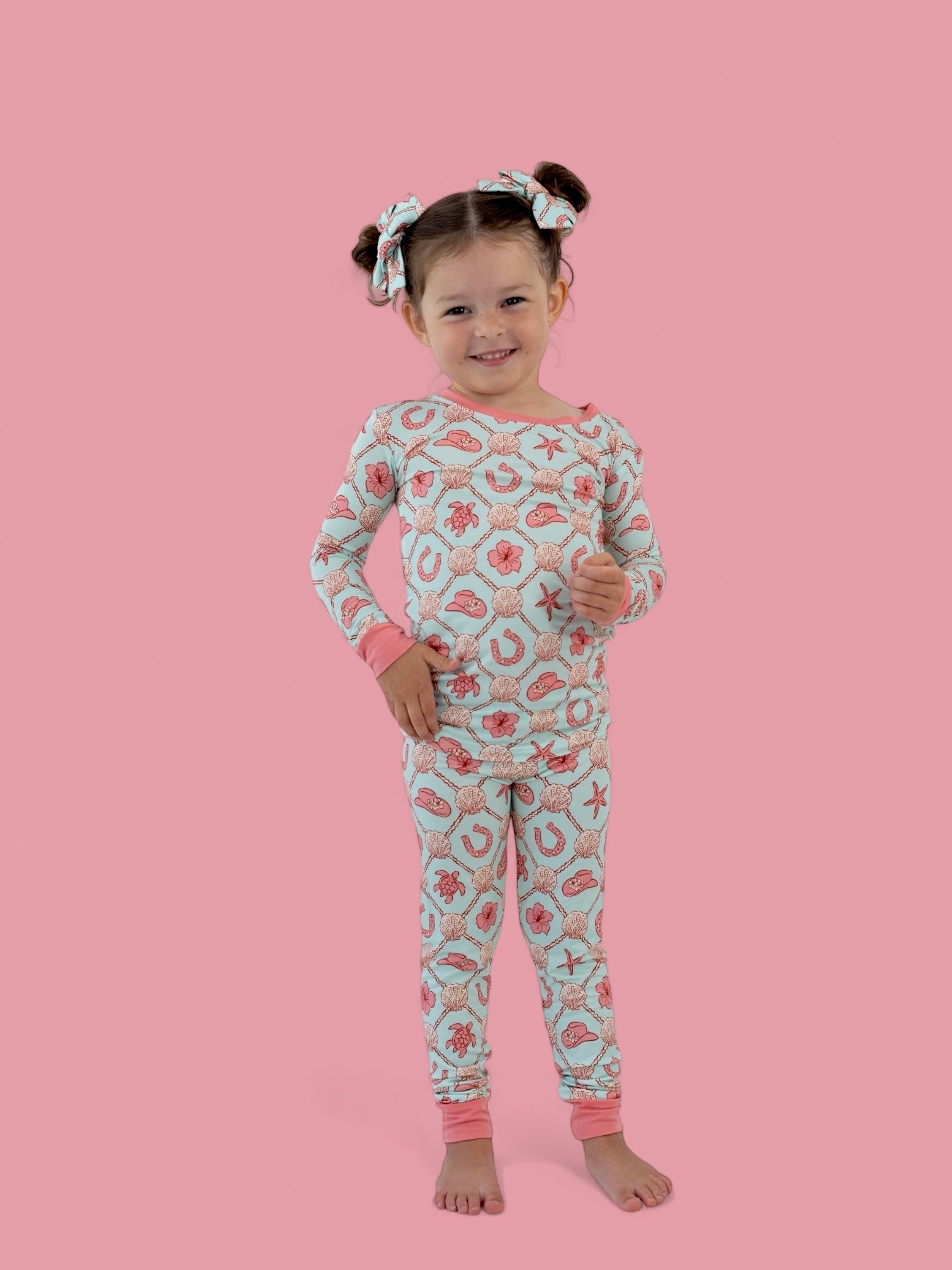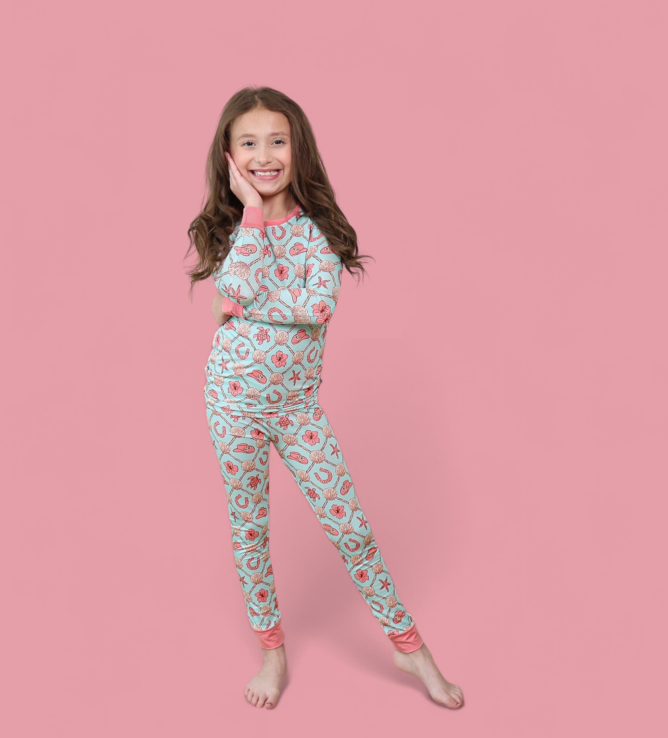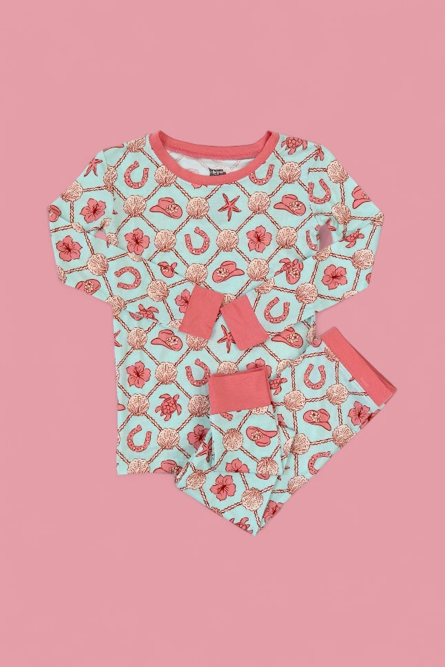 The Coastal Cowgirl Dream Set brings all the comfort of our signature bamboo pajamas with a playful twist of seaside cowgirl charm. Featuring a soft, airy blue base and a vibrant mix of floral cowgirl hats, lucky horseshoes, starfish, hibiscus blooms, and sea creatures—this set is perfect for little adventurers who dream of starry skies and sandy trails.