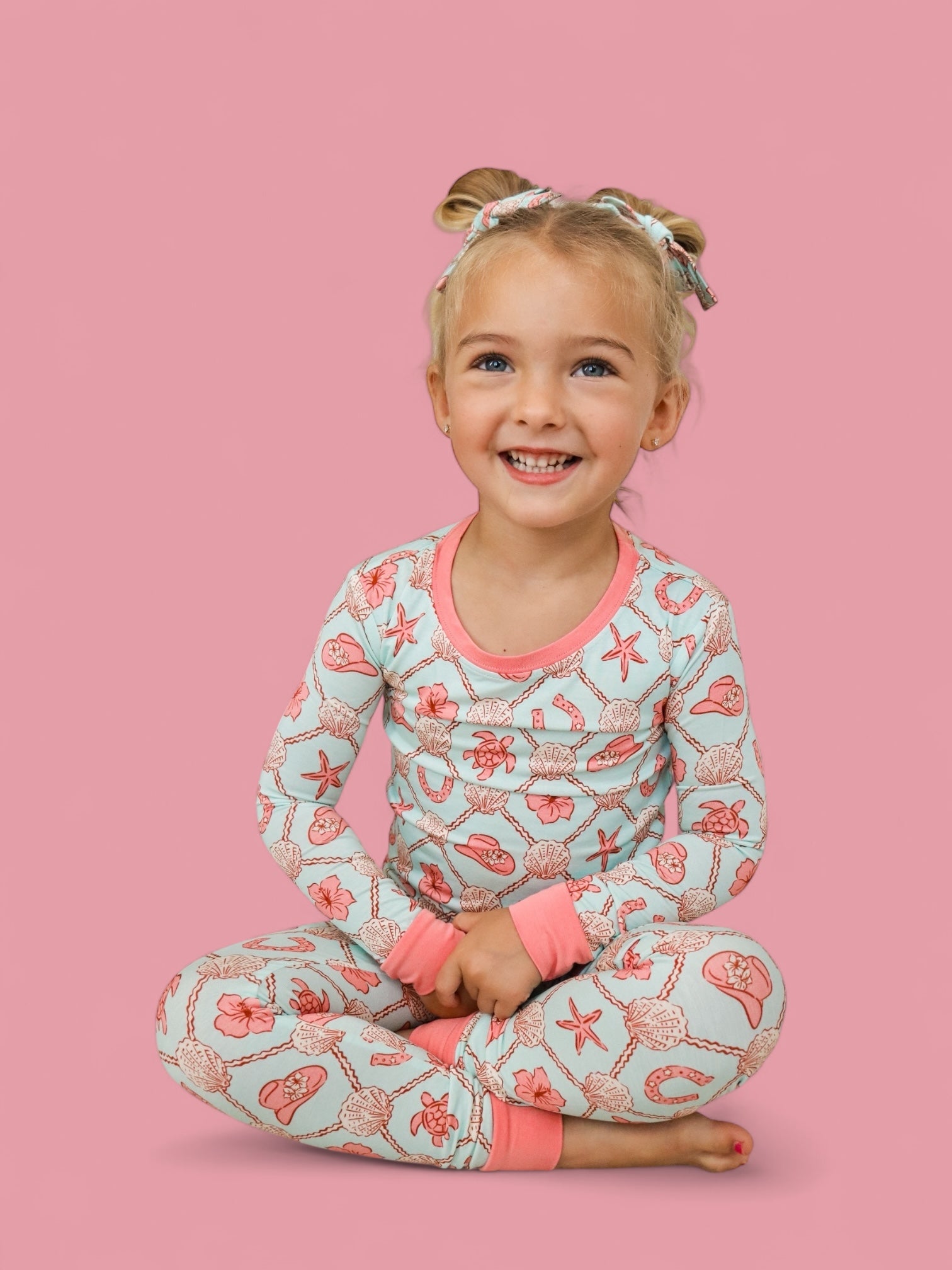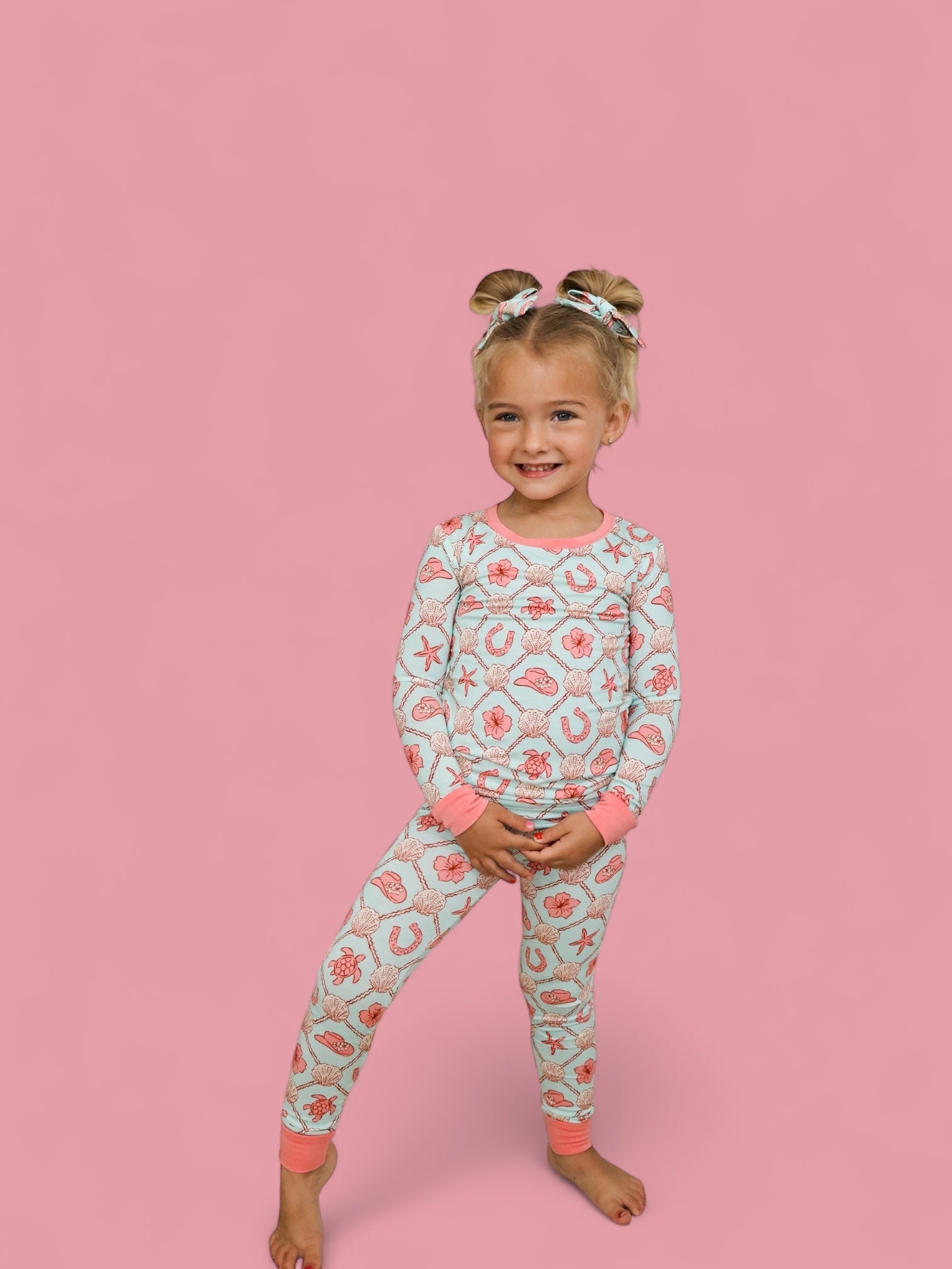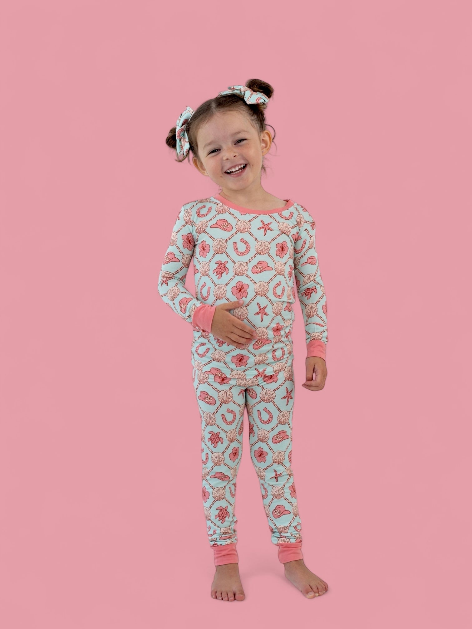 The Coastal Cowgirl Dream Set brings all the comfort of our signature bamboo pajamas with a playful twist of seaside cowgirl charm. Featuring a soft, airy blue base and a vibrant mix of floral cowgirl hats, lucky horseshoes, starfish, hibiscus blooms, and sea creatures—this set is perfect for little adventurers who dream of starry skies and sandy trails.