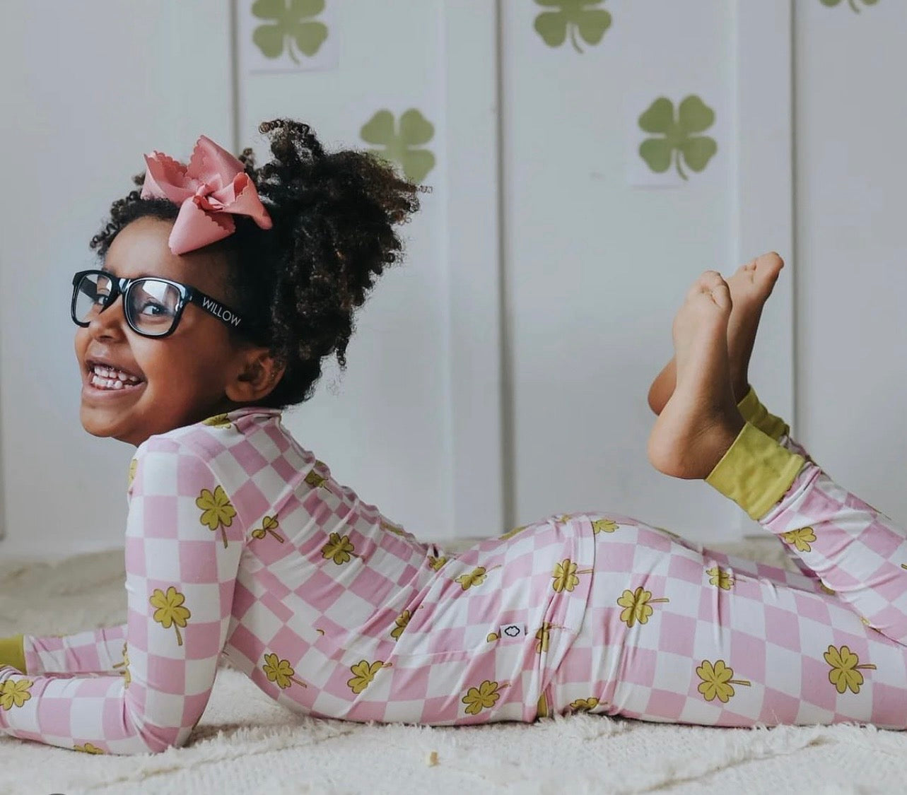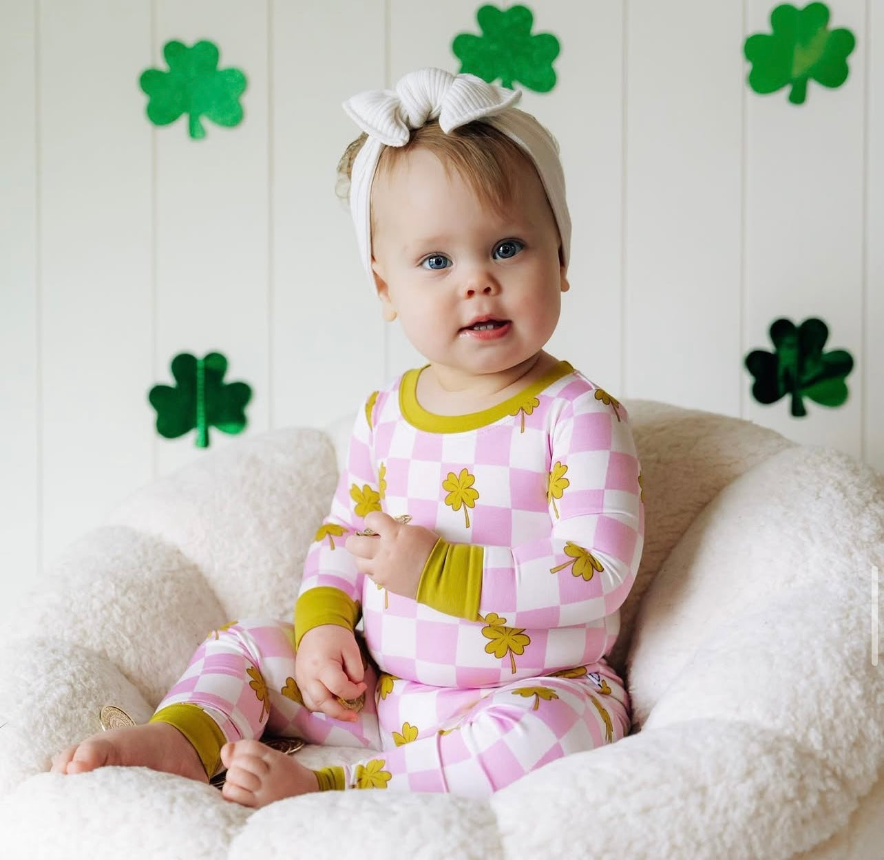 Your little one will be the sweetest charm around in our Cutest Clover Dream Set! This darling two-piece features a playful pink-and-white checkerboard sprinkled with golden clovers, finished with soft olive-green trim at the neckline and cuffs for a stylish twist.