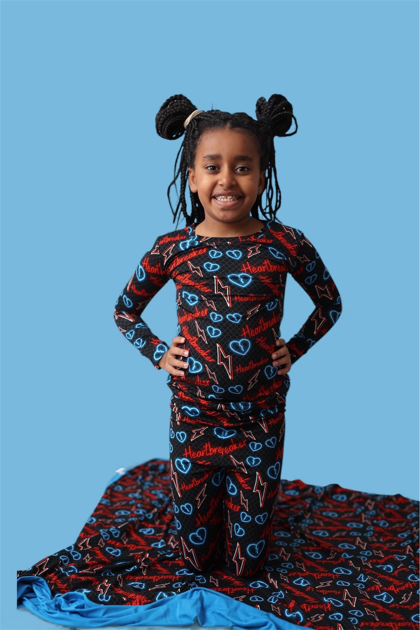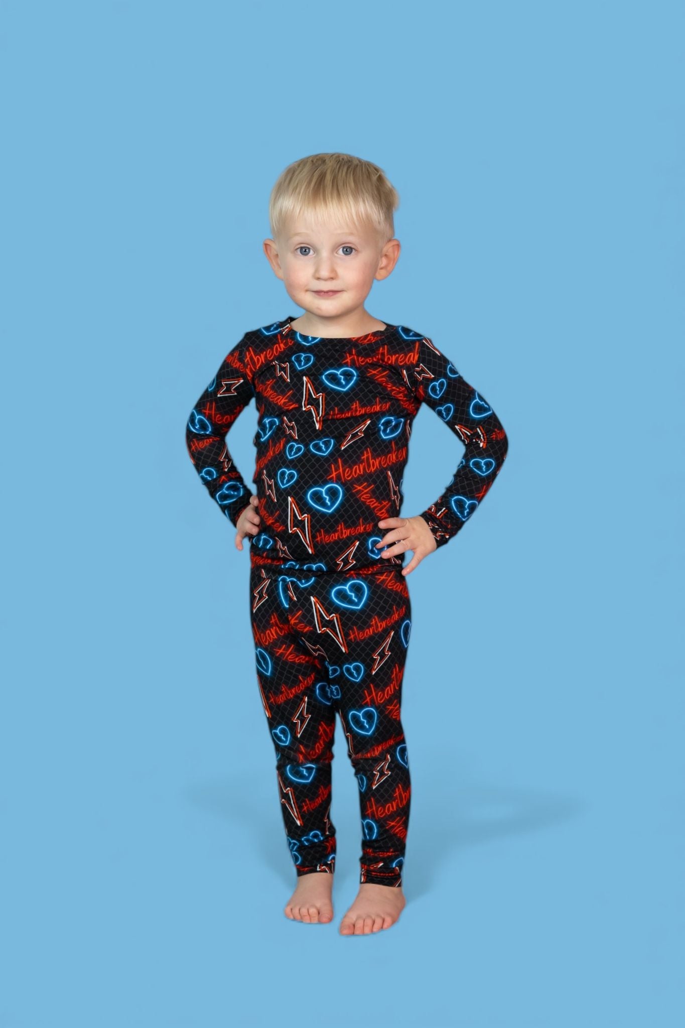 Cozy meets cool! The Heartbreaker Dream Set features a long sleeve top and matching pants with a striking neon-style print of glowing hearts, lightning bolts, and “Heartbreaker” script. Crafted from our signature buttery-soft bamboo fabric, this set is breathable, stretchy, and perfect for sleep, play, or lounging in style.