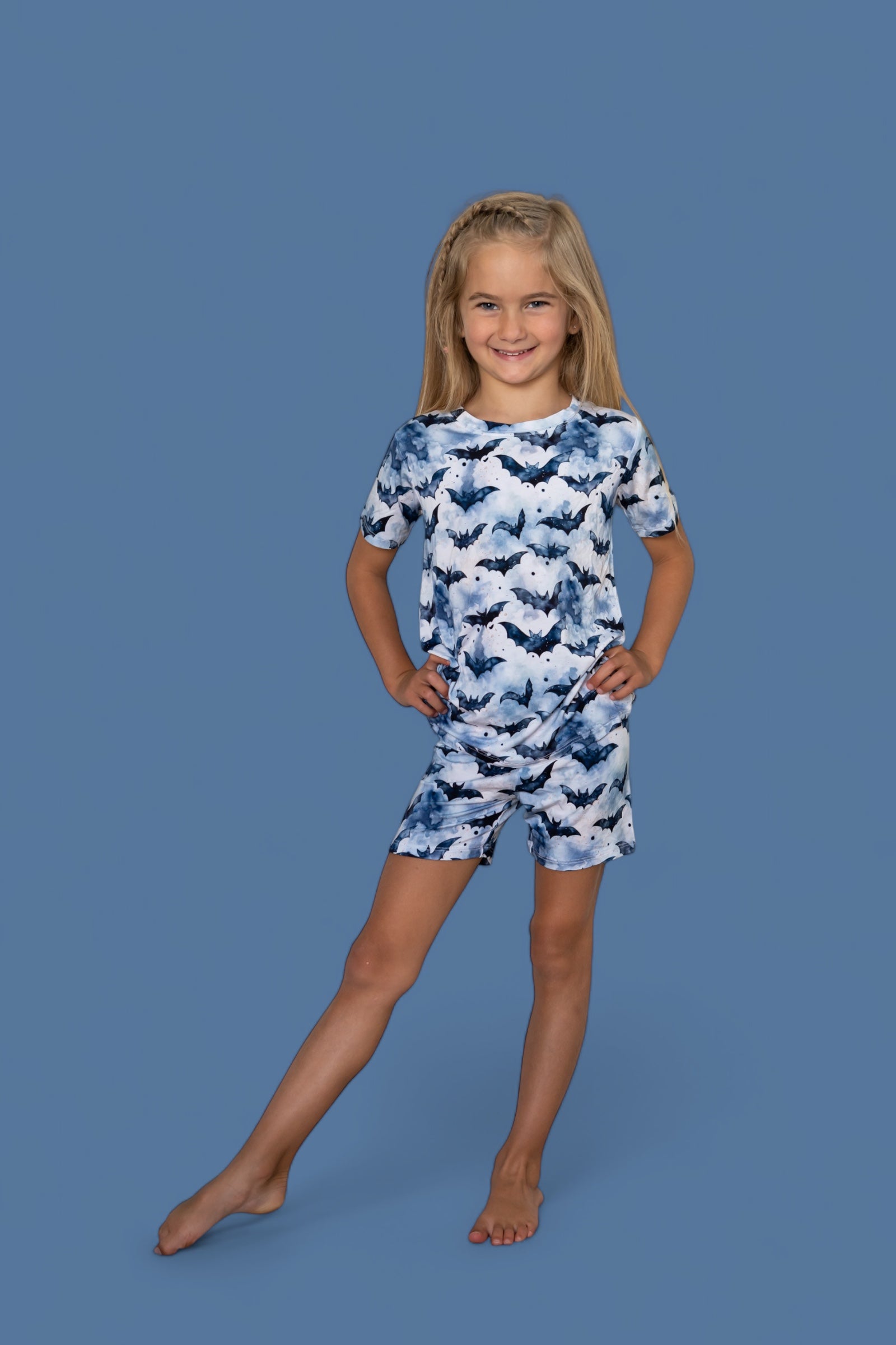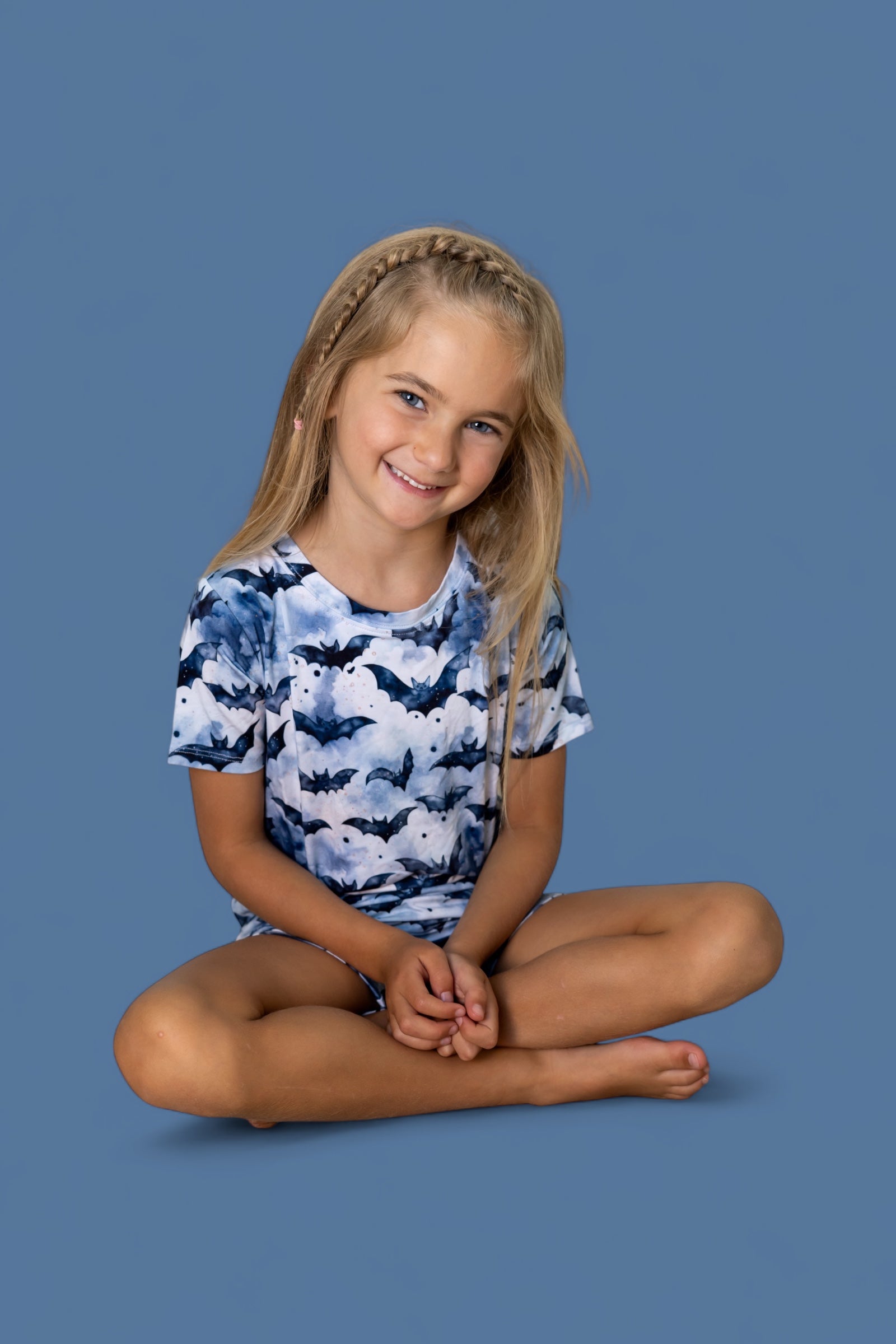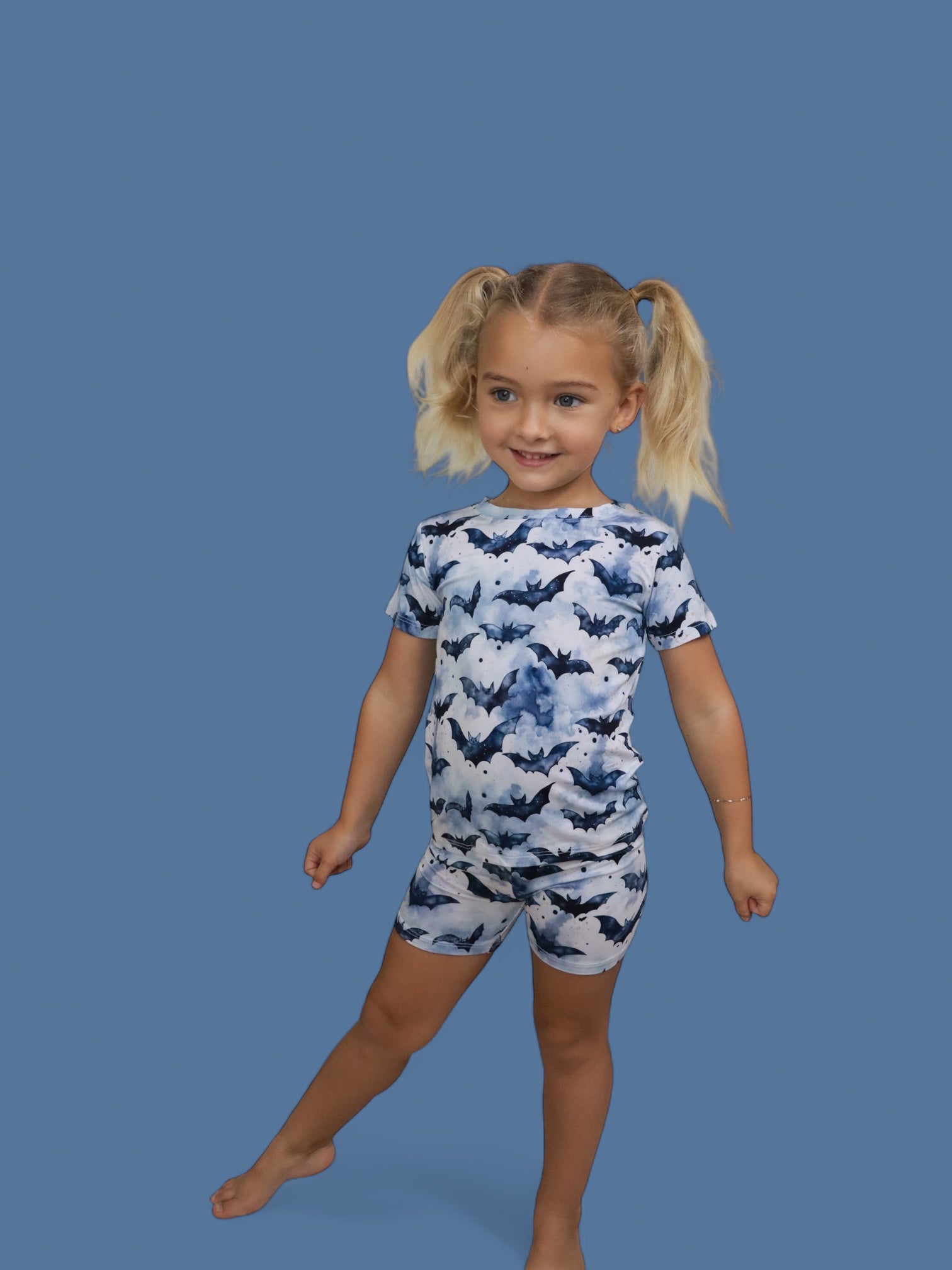 Soar into spooky season with the Midnight Flyers Dream Short Set! Featuring graceful watercolor bats gliding across a starlit sky, this two-piece set includes a buttery-soft short sleeve top and matching shorts—perfect for warm autumn nights, movie marathons, and magical bedtime stories. It’s moody, comfy, and made for little night flyers.